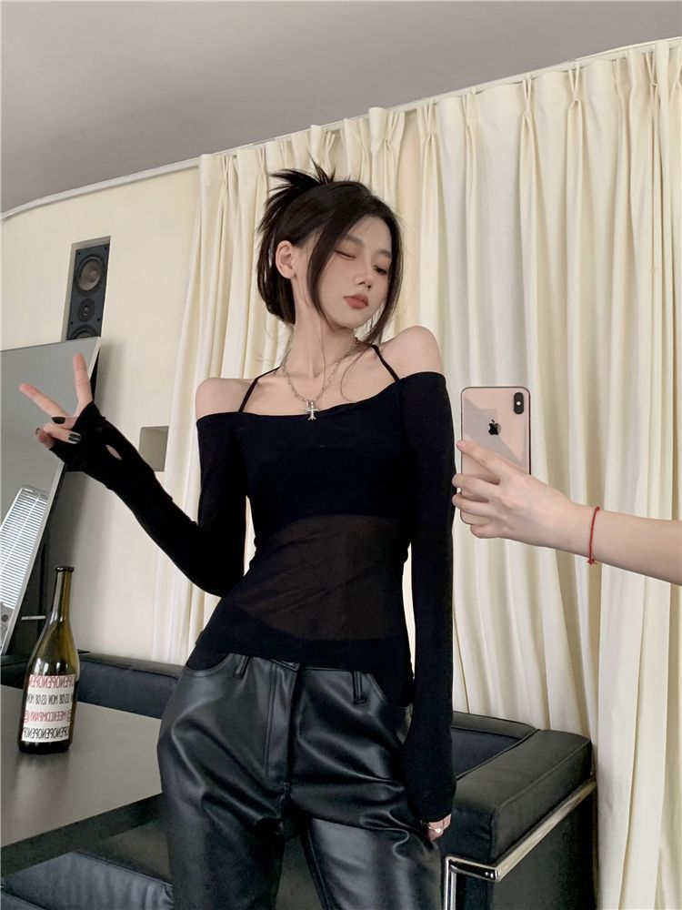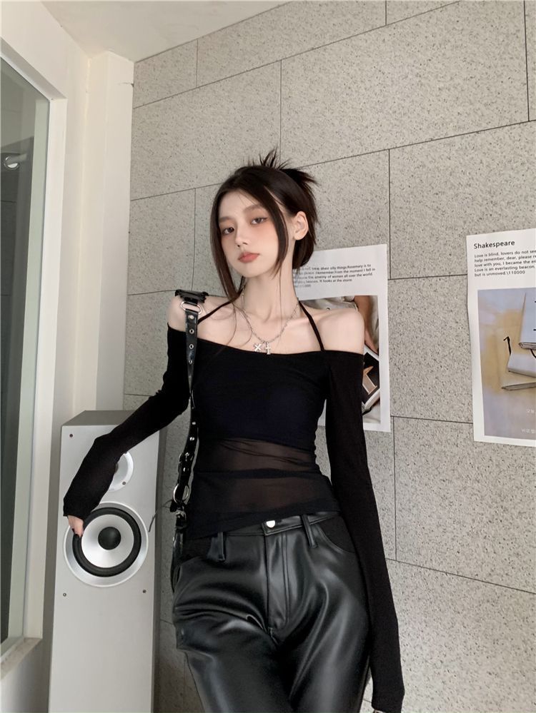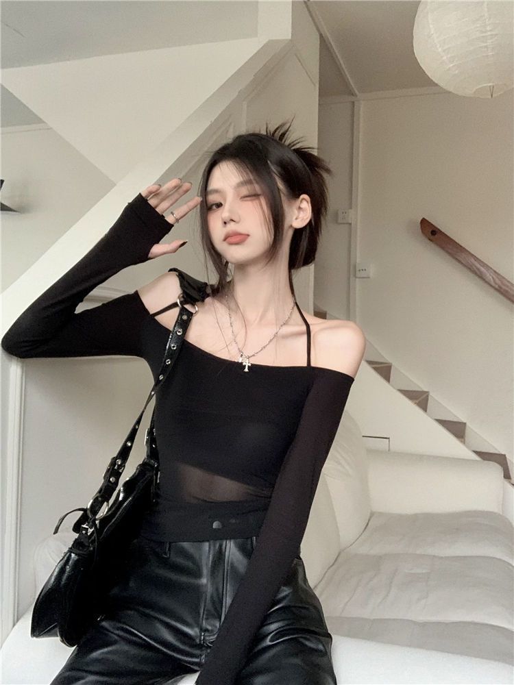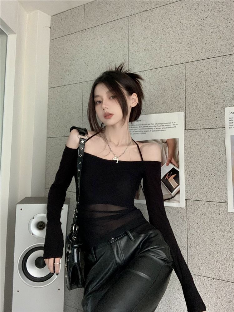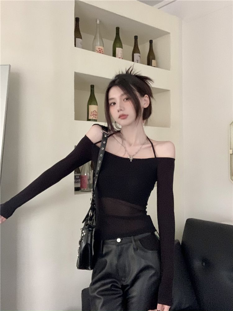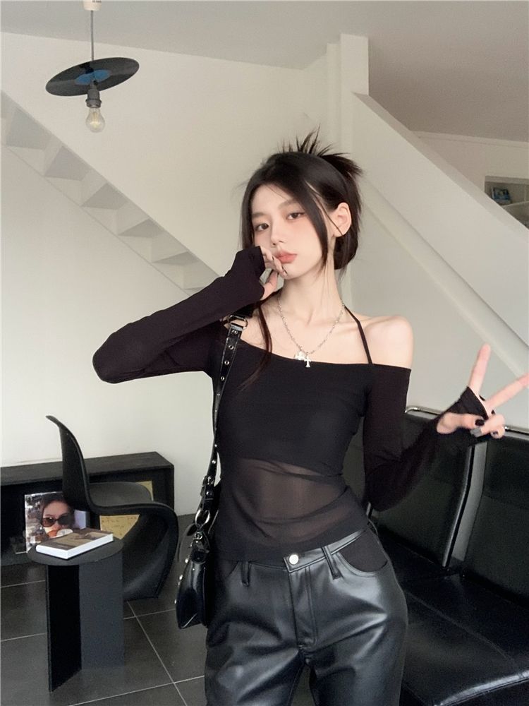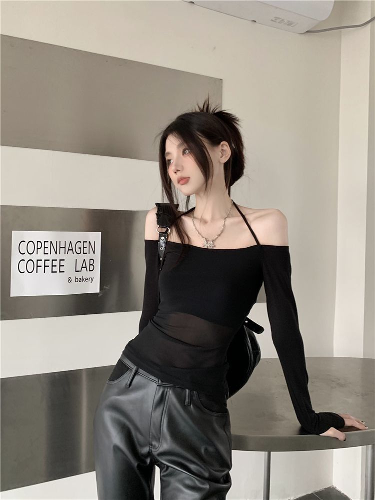 2023 새로운 티셔츠 시크 리틀 섹시 블랙 퓨어 메쉬 스티칭 디자인 슬림베이스 셔츠 탑스토어 가기