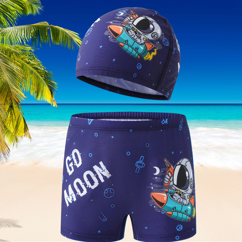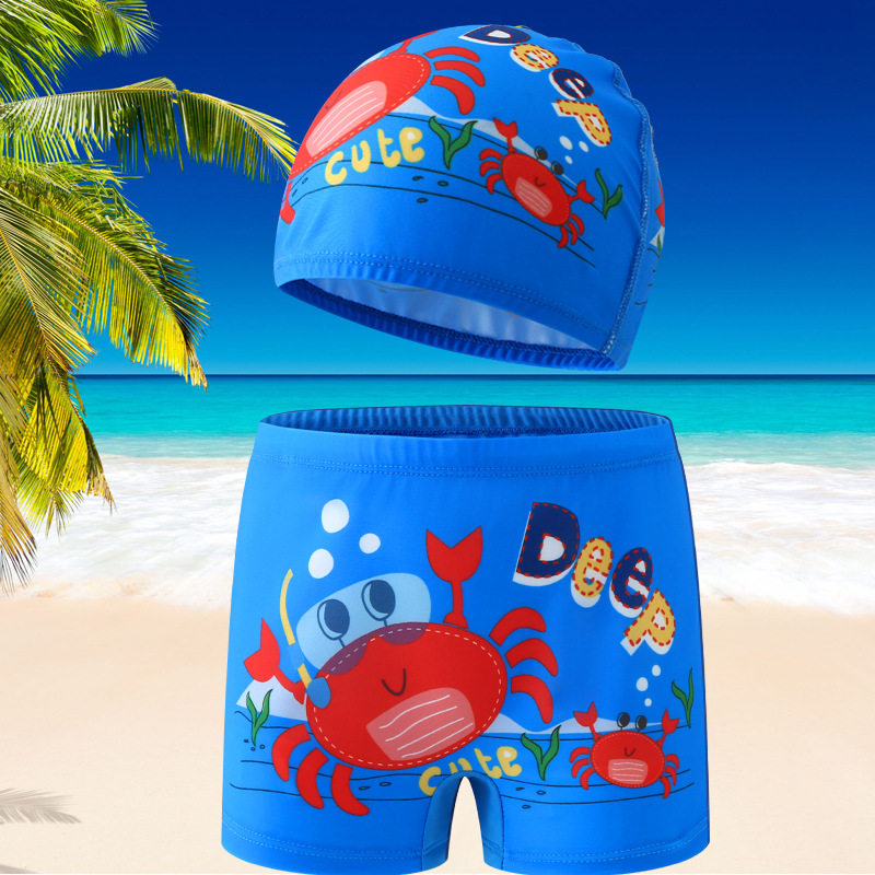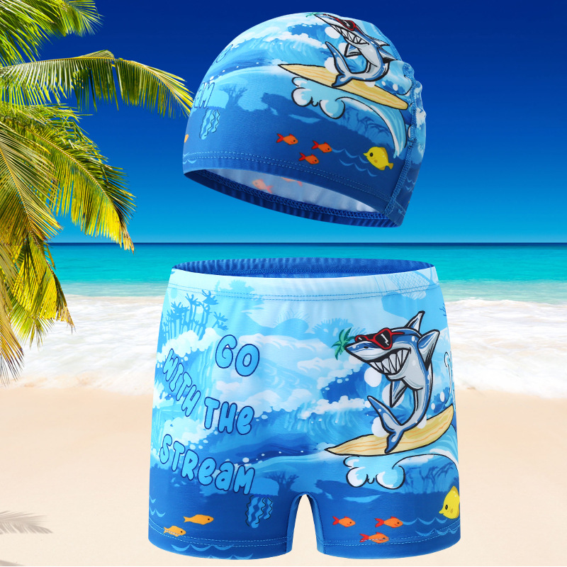 공장 직접 공급 어린이 수영 트렁크 소년 수영복 만화 소년 복서 반바지 중소 어린이 수영복 수영 모자 세트스토어 가기