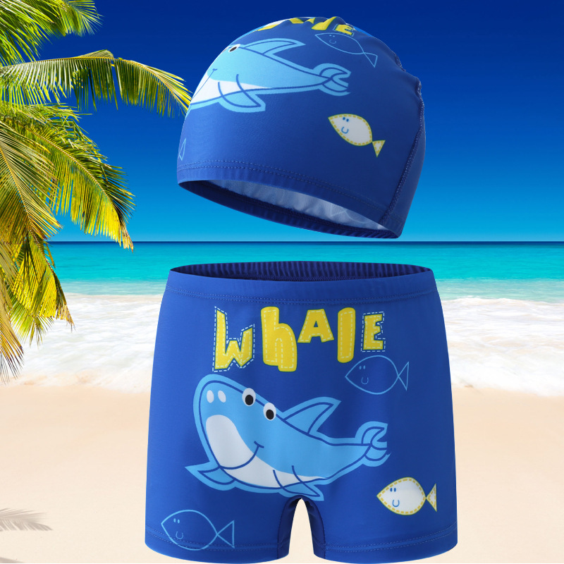 공장 직접 공급 어린이 수영 트렁크 소년 수영복 만화 소년 복서 반바지 중소 어린이 수영복 수영 모자 세트