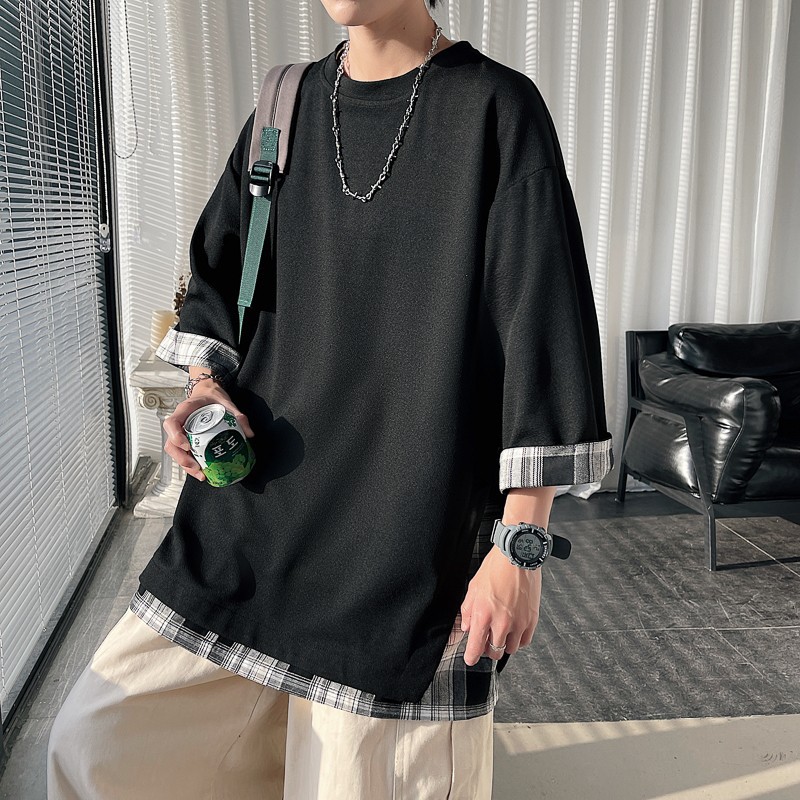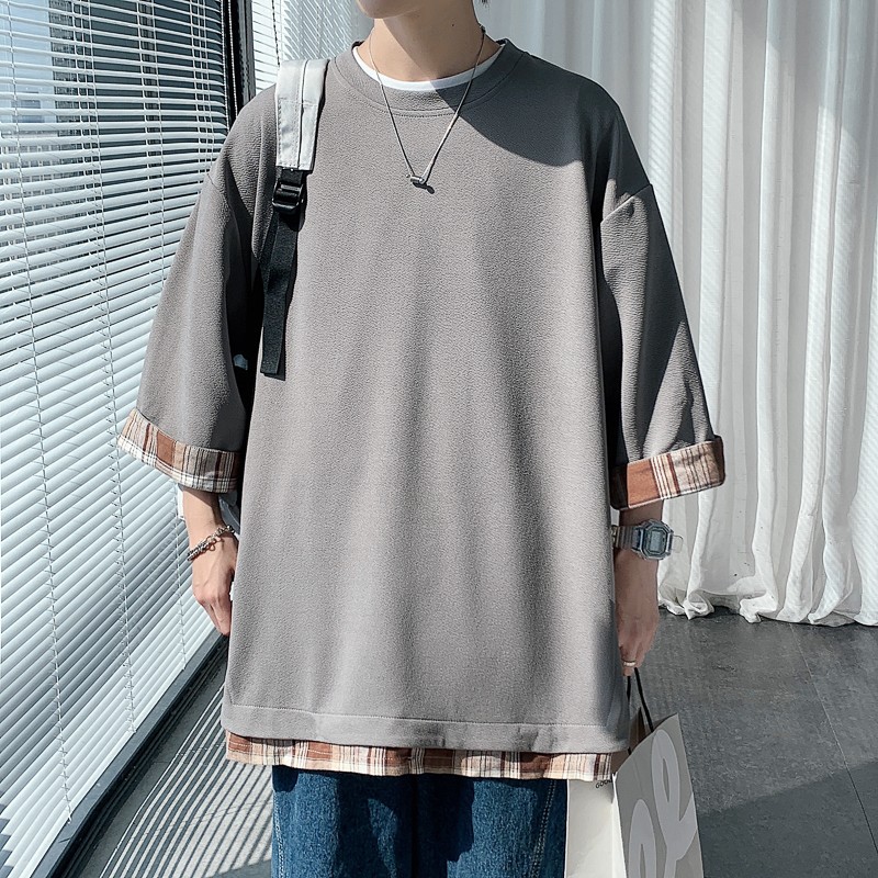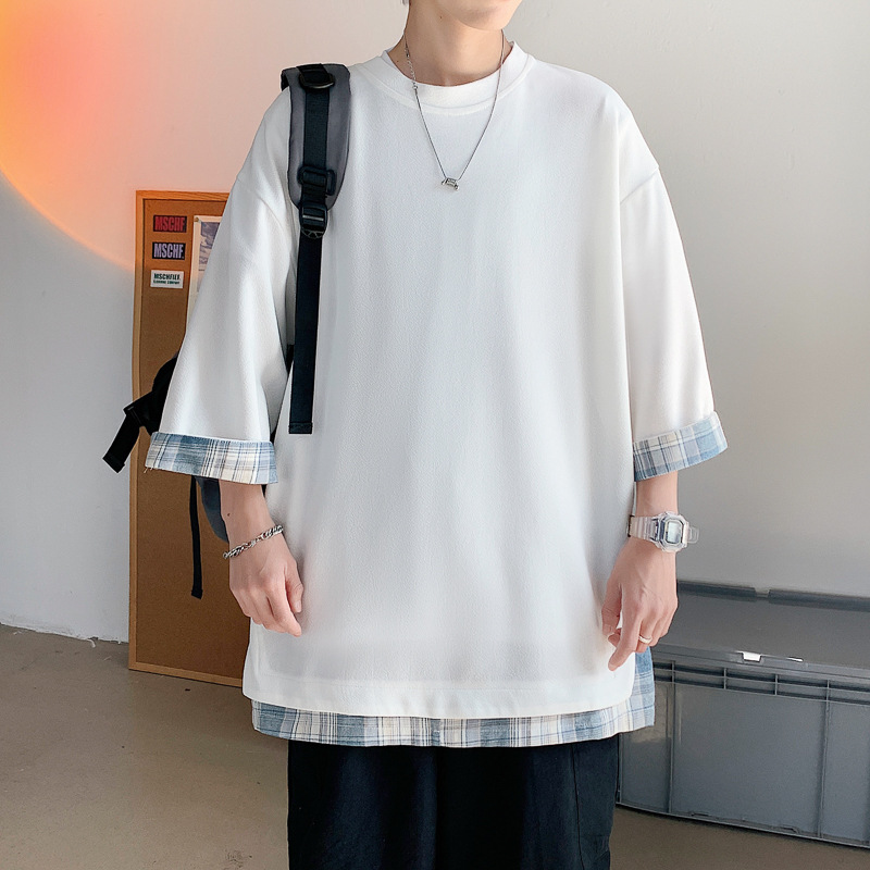 격자 무늬 스티칭 가짜 투피스 티셔츠 남성용 디자인 센스 하프 슬리브 오버사이즈 루즈한 반팔 패션 브랜드 세븐 피스 슬리브