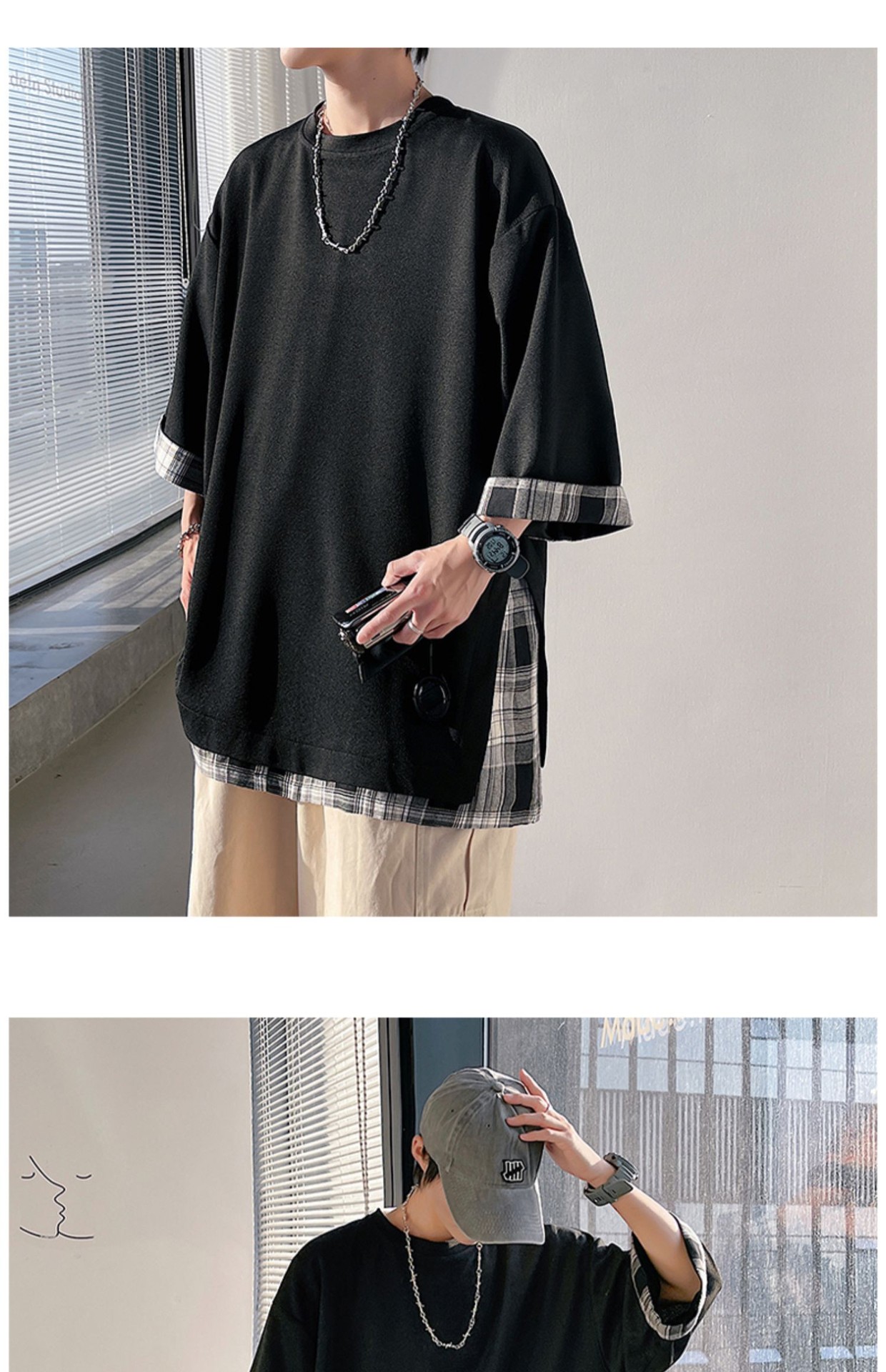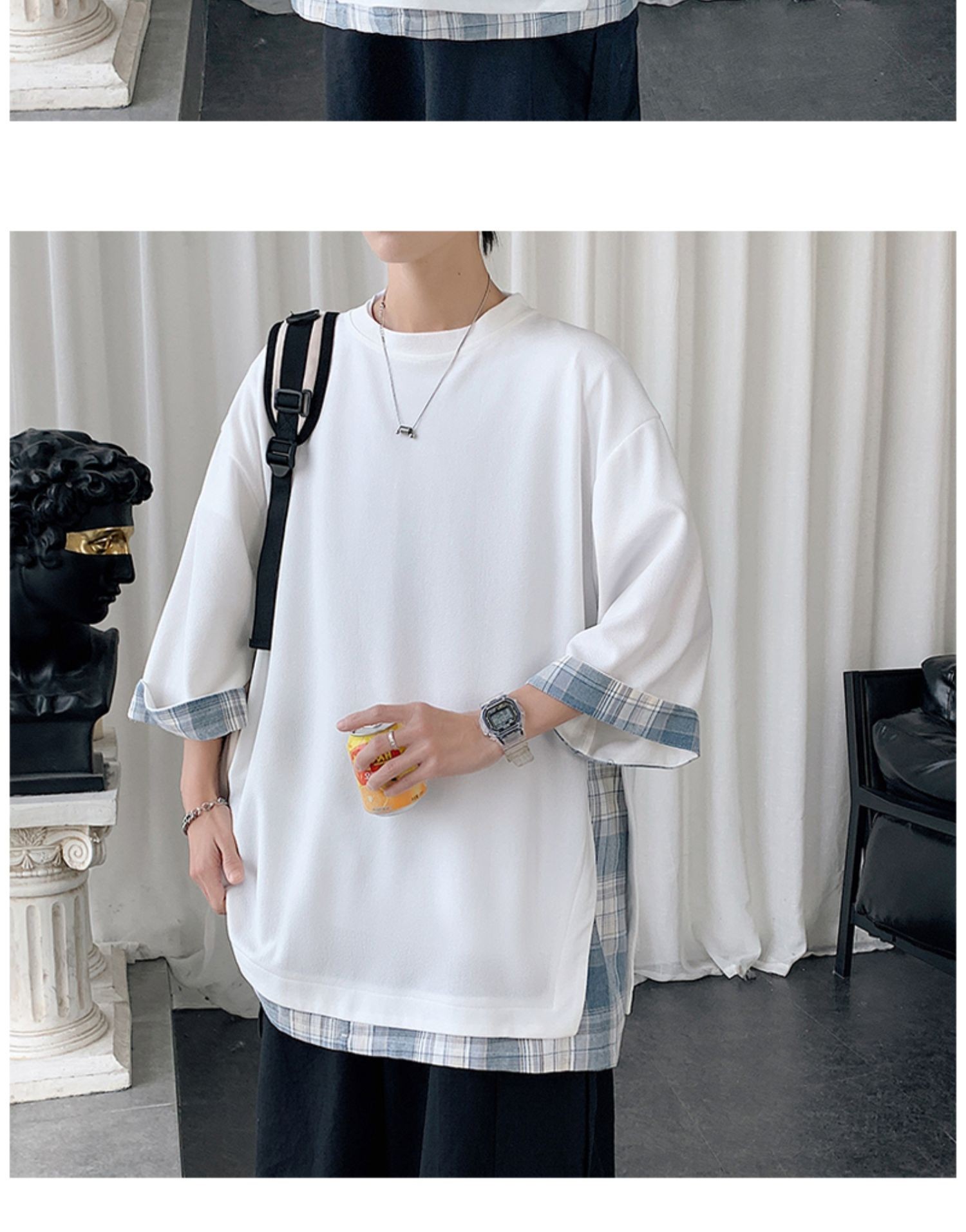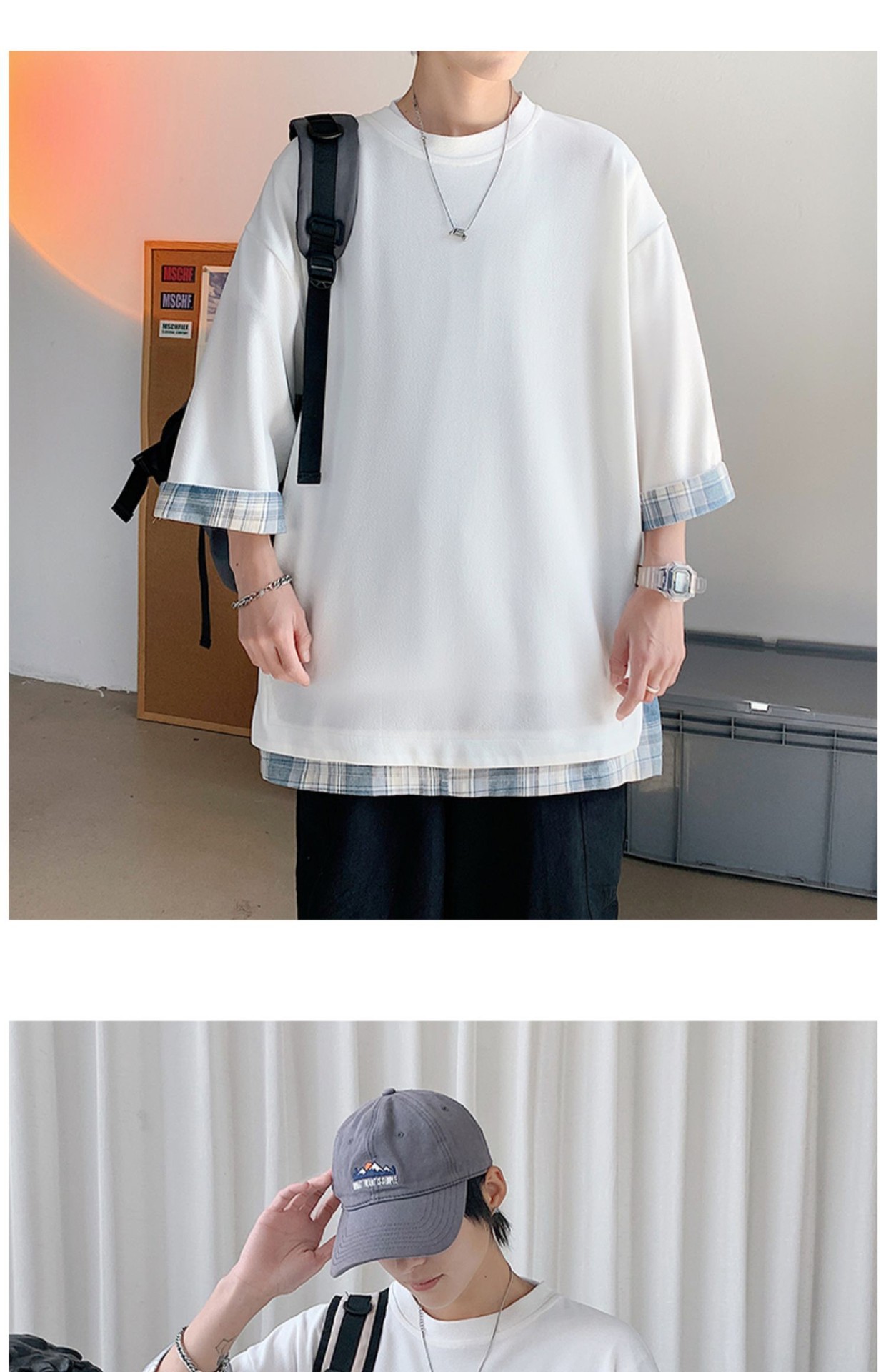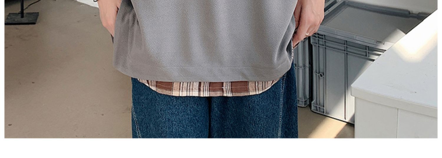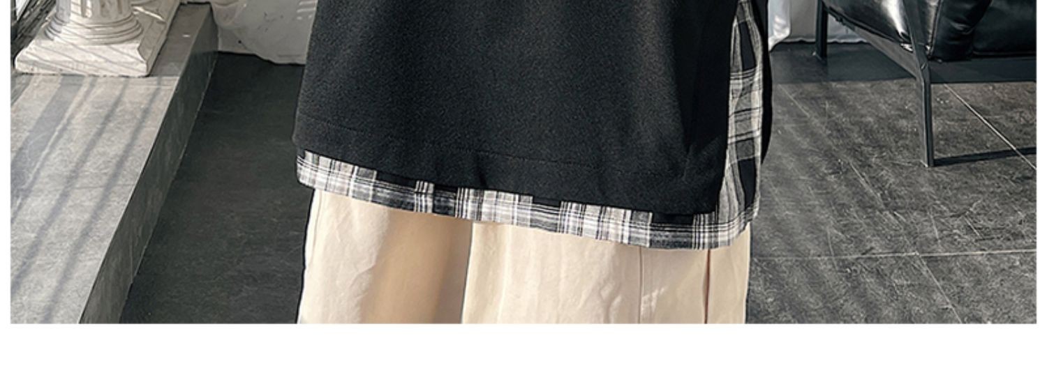 격자 무늬 스티칭 가짜 투피스 티셔츠 남성용 디자인 센스 하프 슬리브 오버사이즈 루즈한 반팔 패션 브랜드 세븐 피스 슬리브스토어 가기