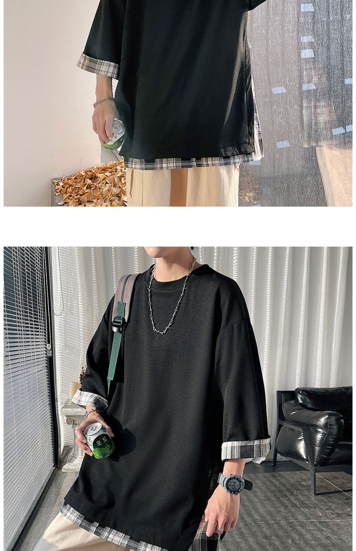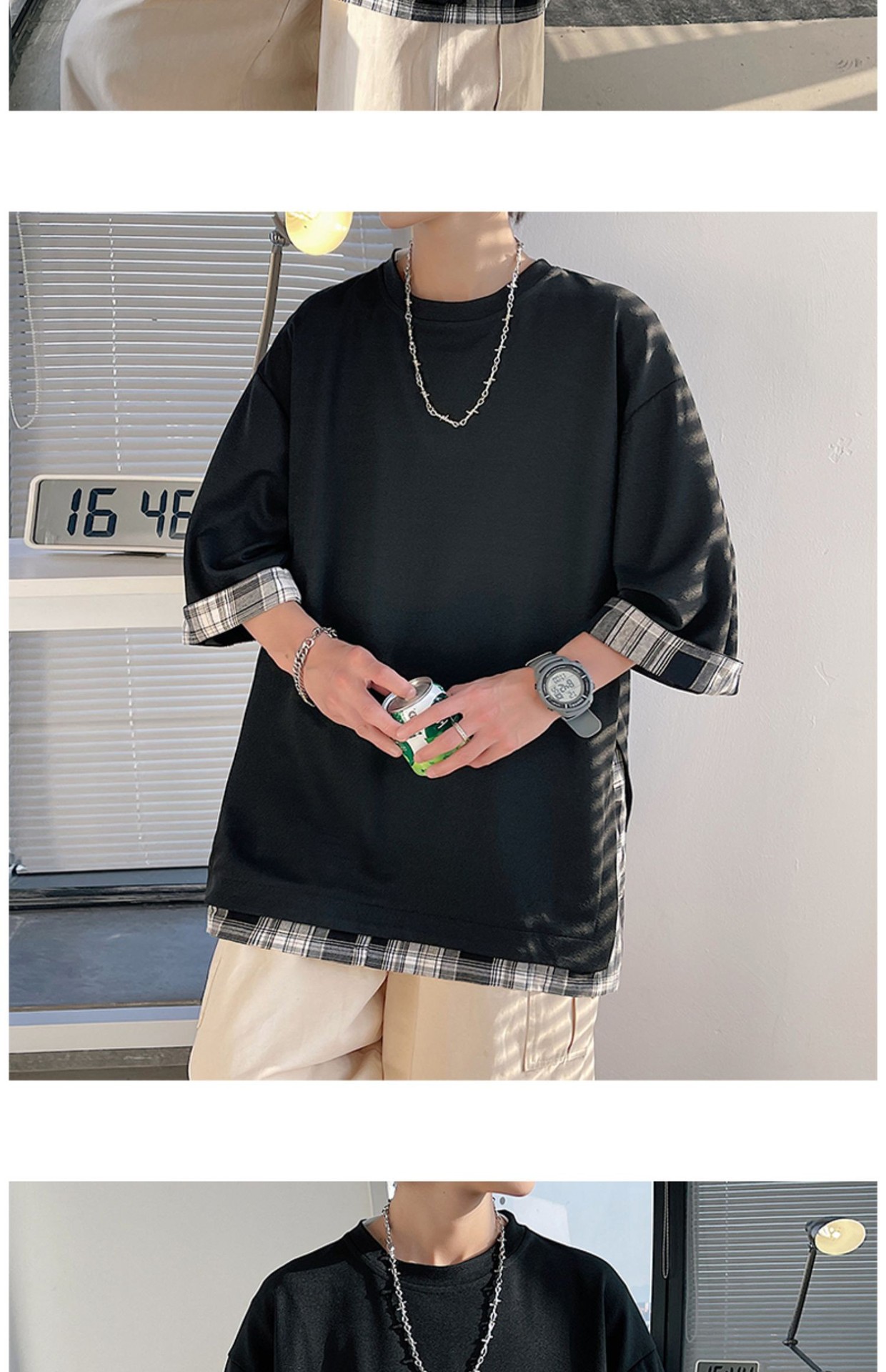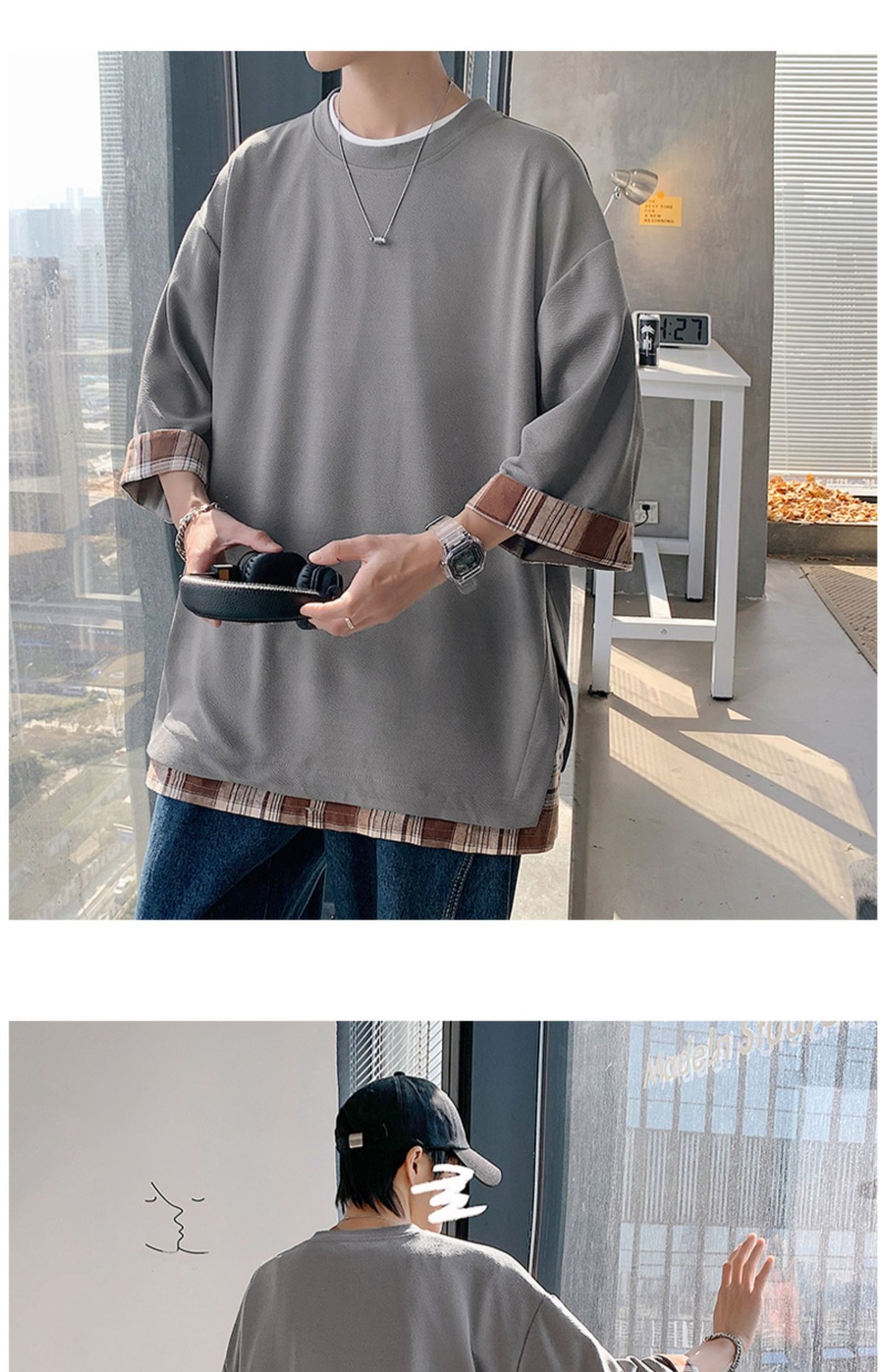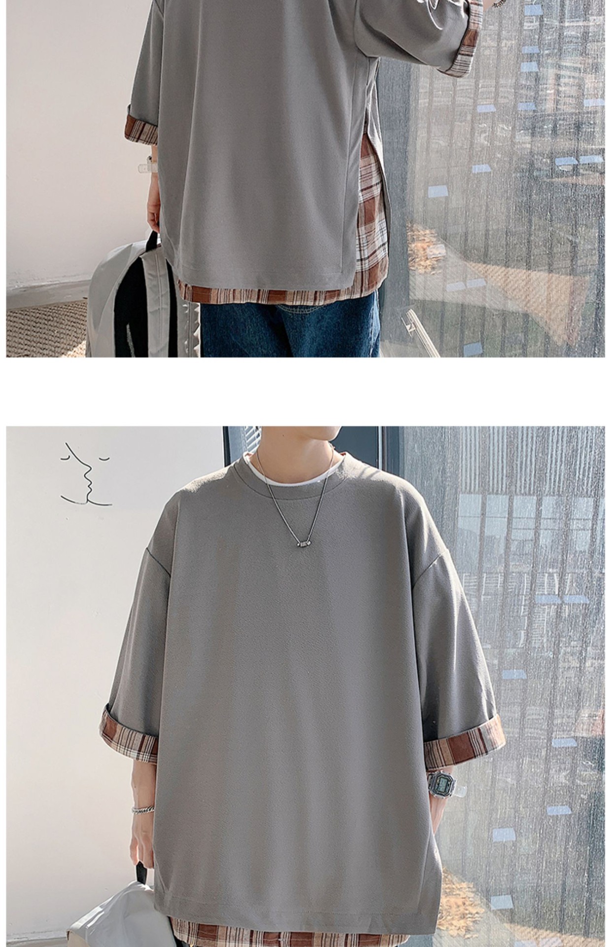 격자 무늬 스티칭 가짜 투피스 티셔츠 남성용 디자인 센스 하프 슬리브 오버사이즈 루즈한 반팔 패션 브랜드 세븐 피스 슬리브스토어 가기