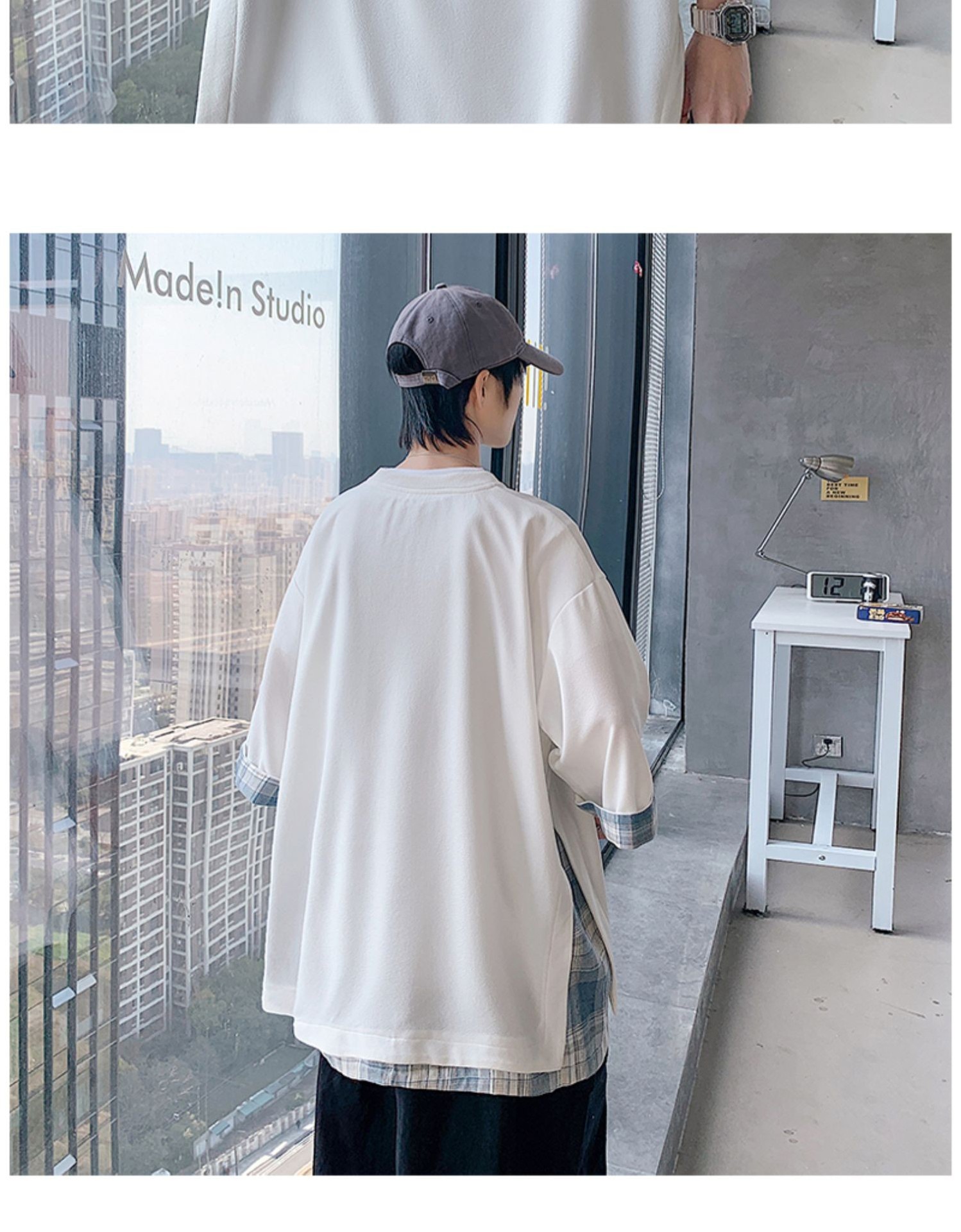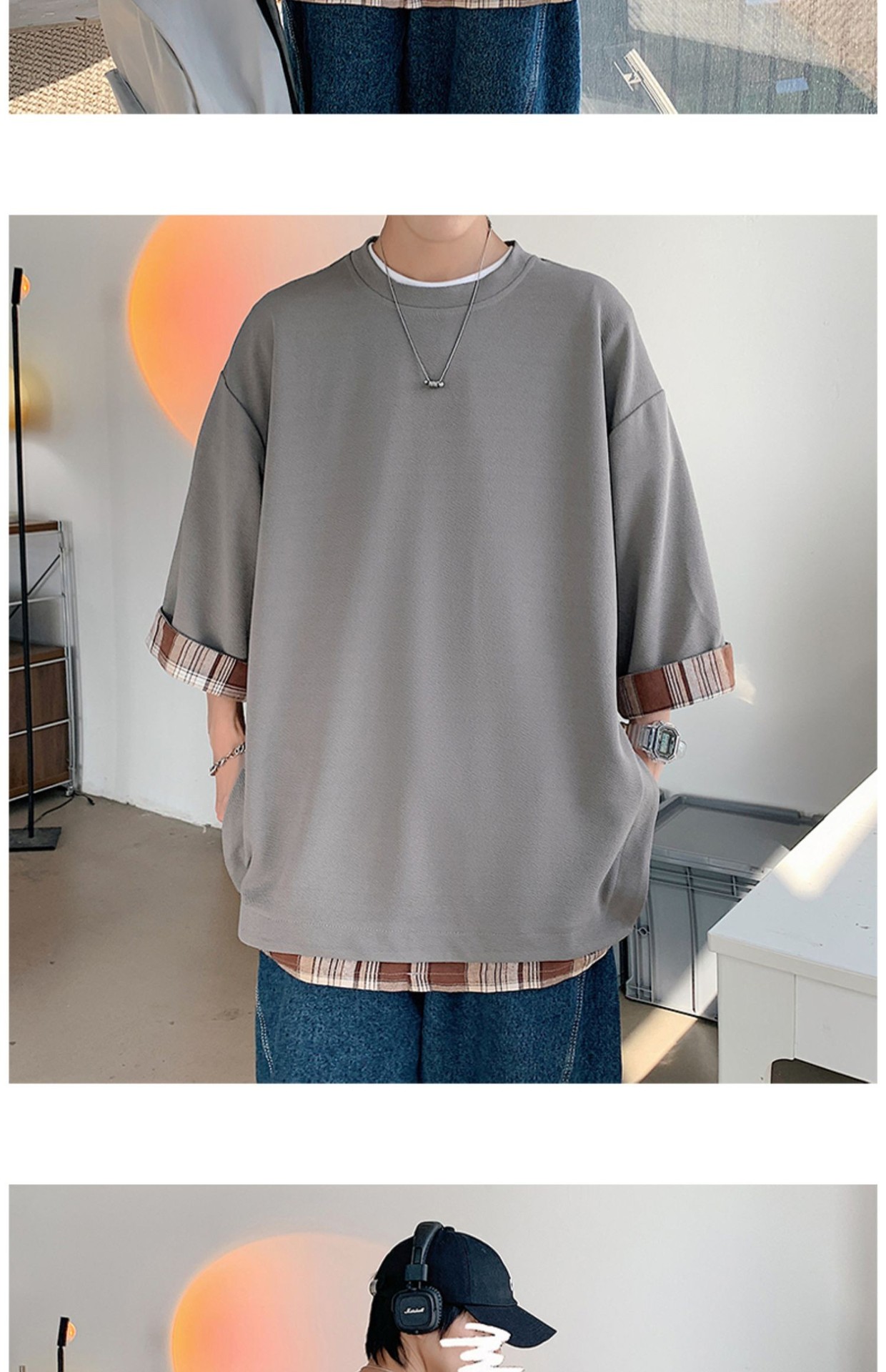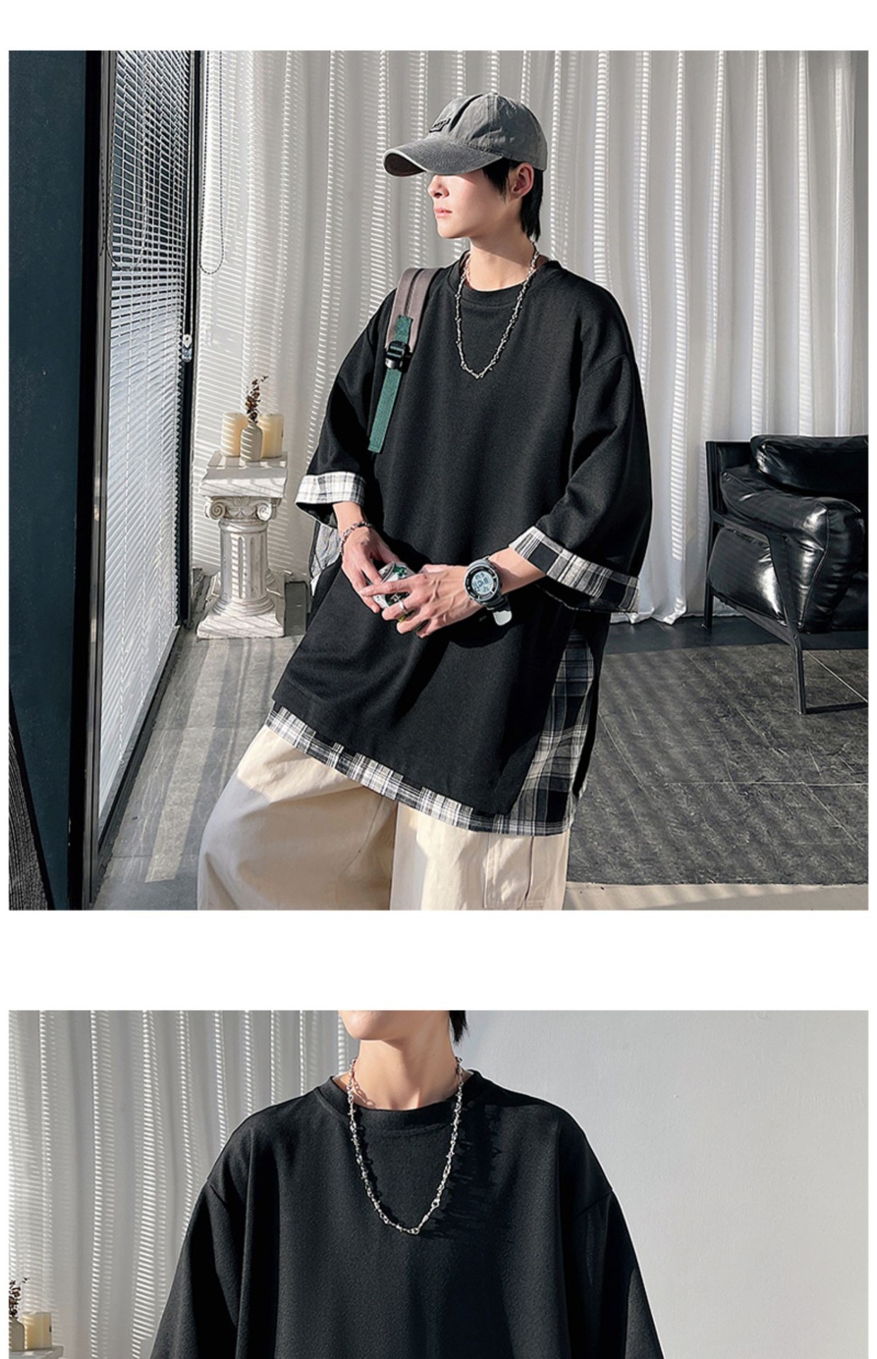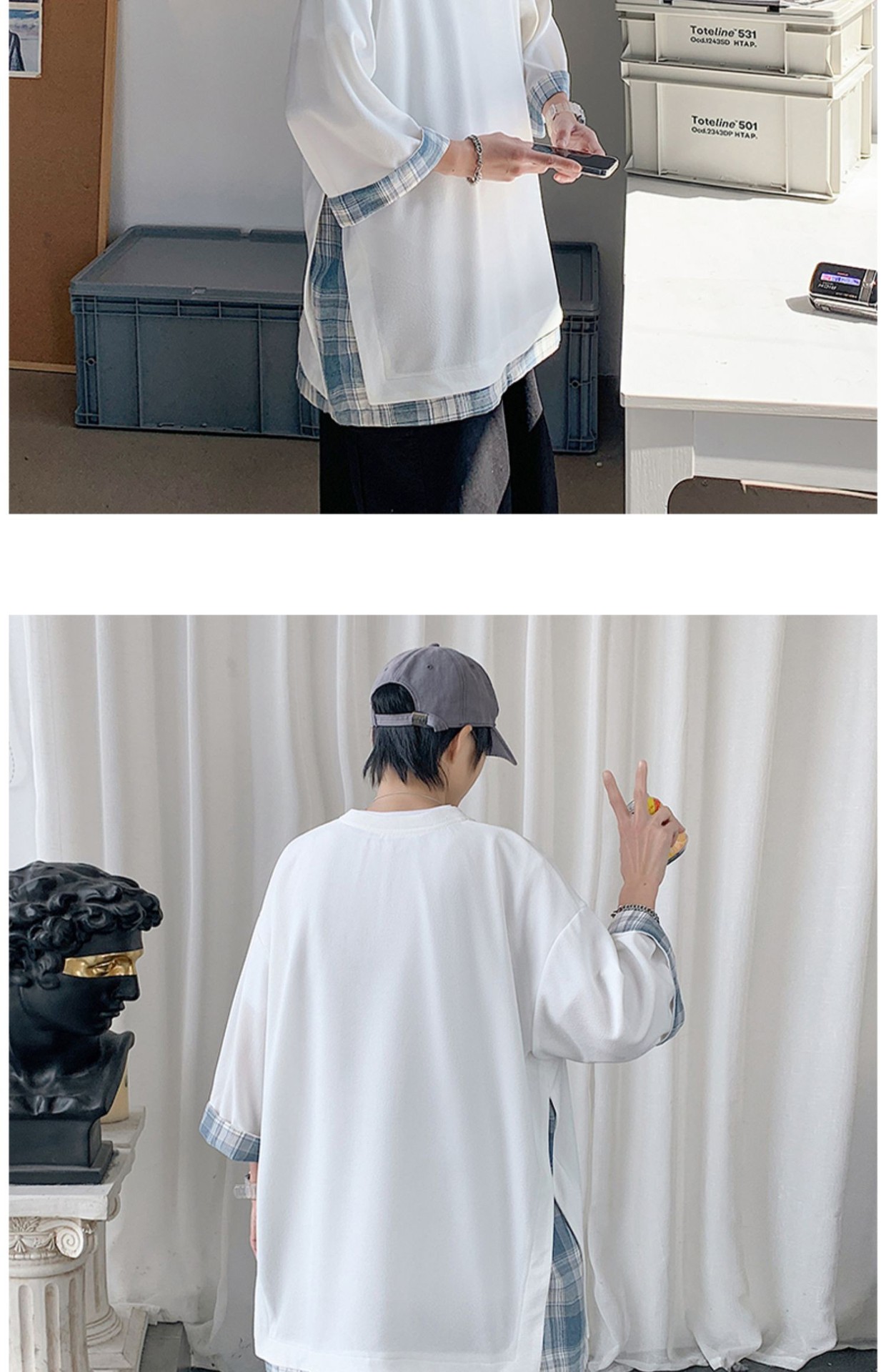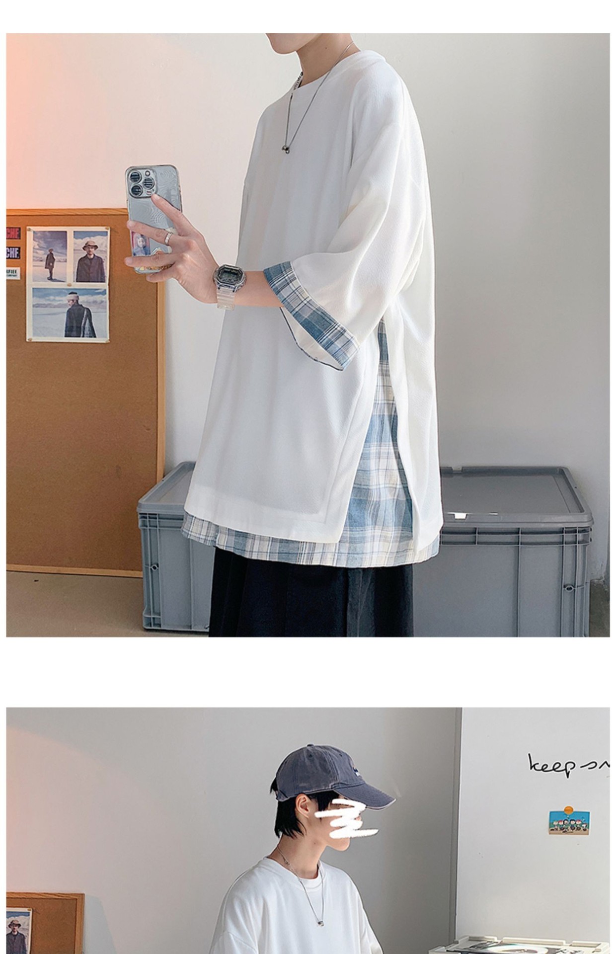 격자 무늬 스티칭 가짜 투피스 티셔츠 남성용 디자인 센스 하프 슬리브 오버사이즈 루즈한 반팔 패션 브랜드 세븐 피스 슬리브스토어 가기