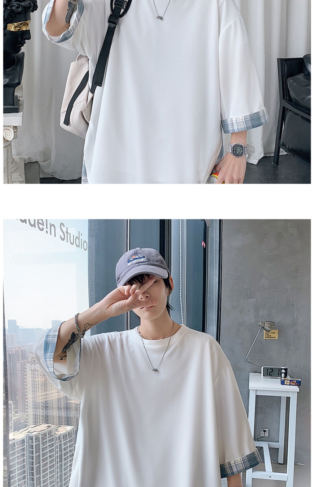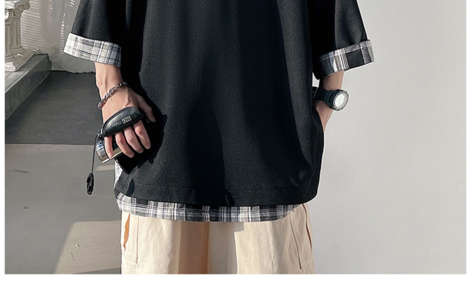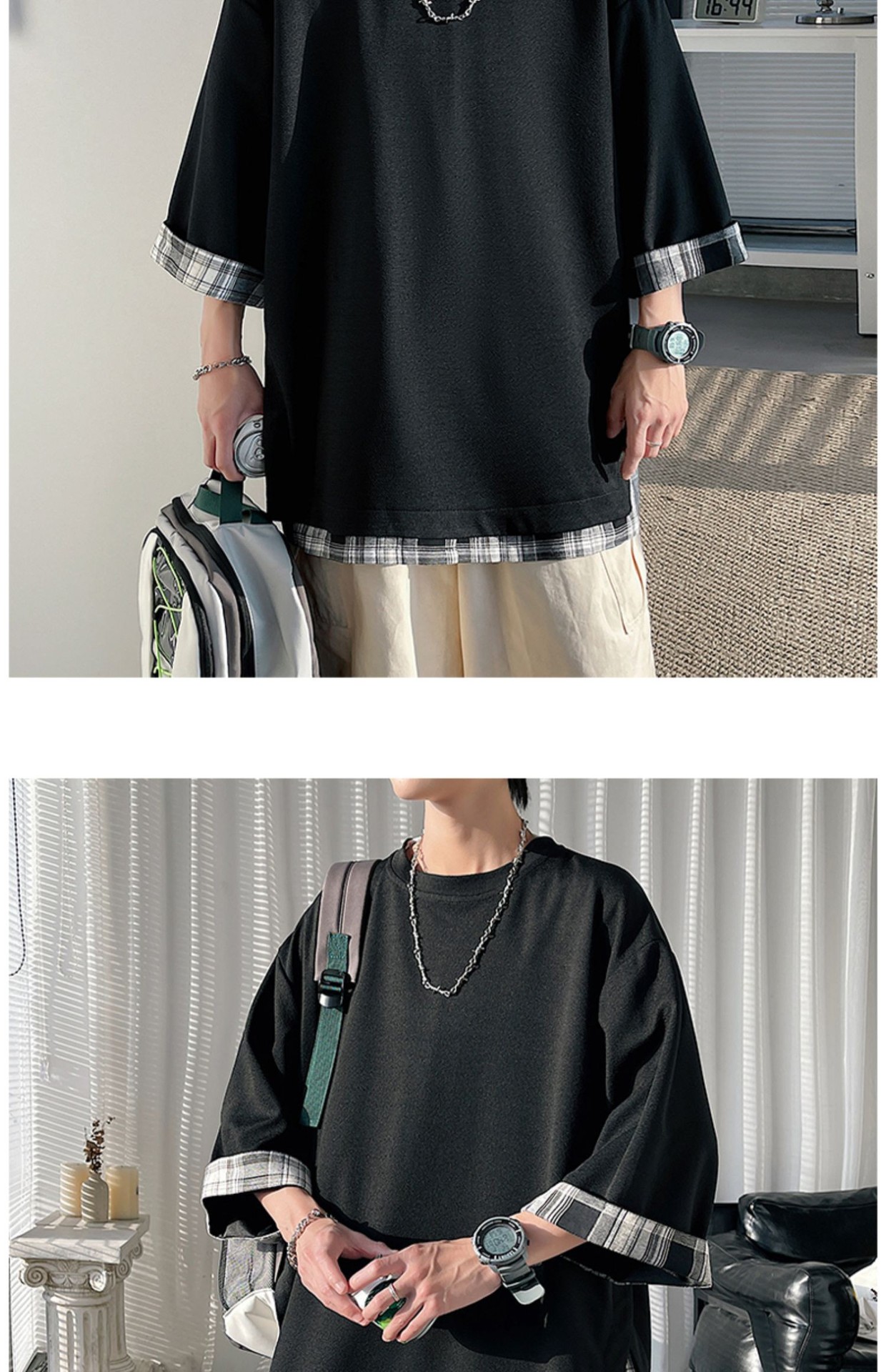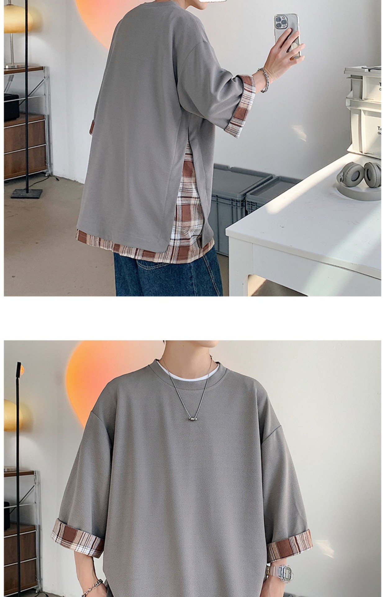 격자 무늬 스티칭 가짜 투피스 티셔츠 남성용 디자인 센스 하프 슬리브 오버사이즈 루즈한 반팔 패션 브랜드 세븐 피스 슬리브스토어 가기