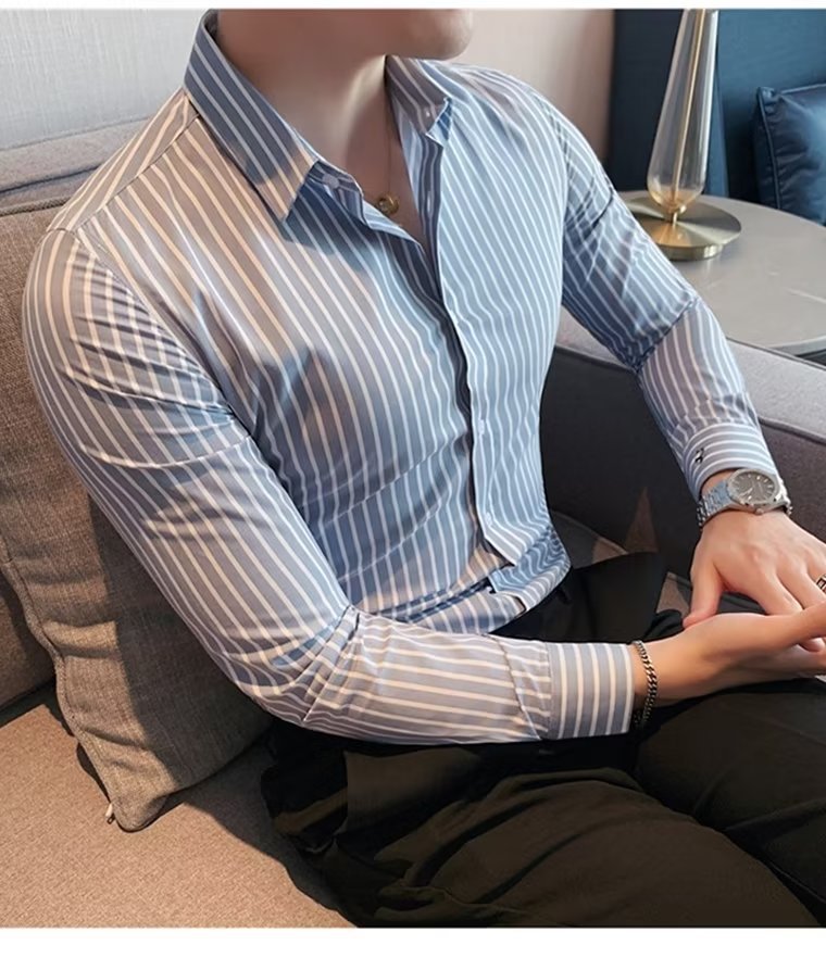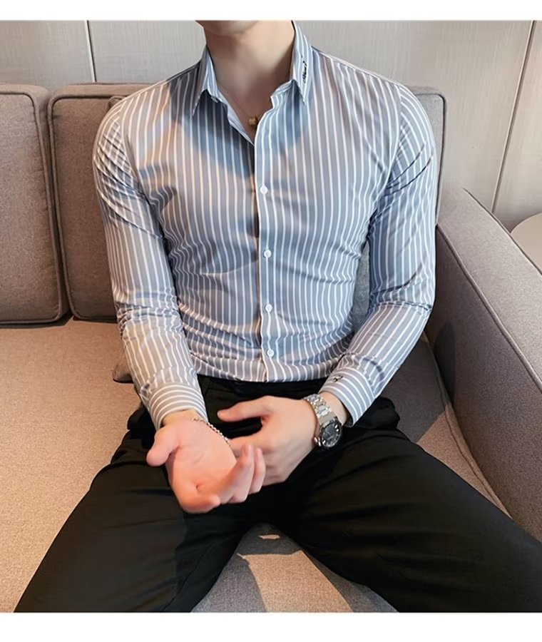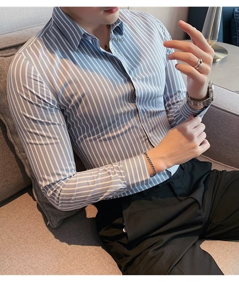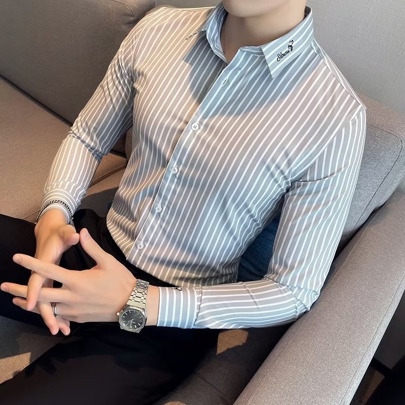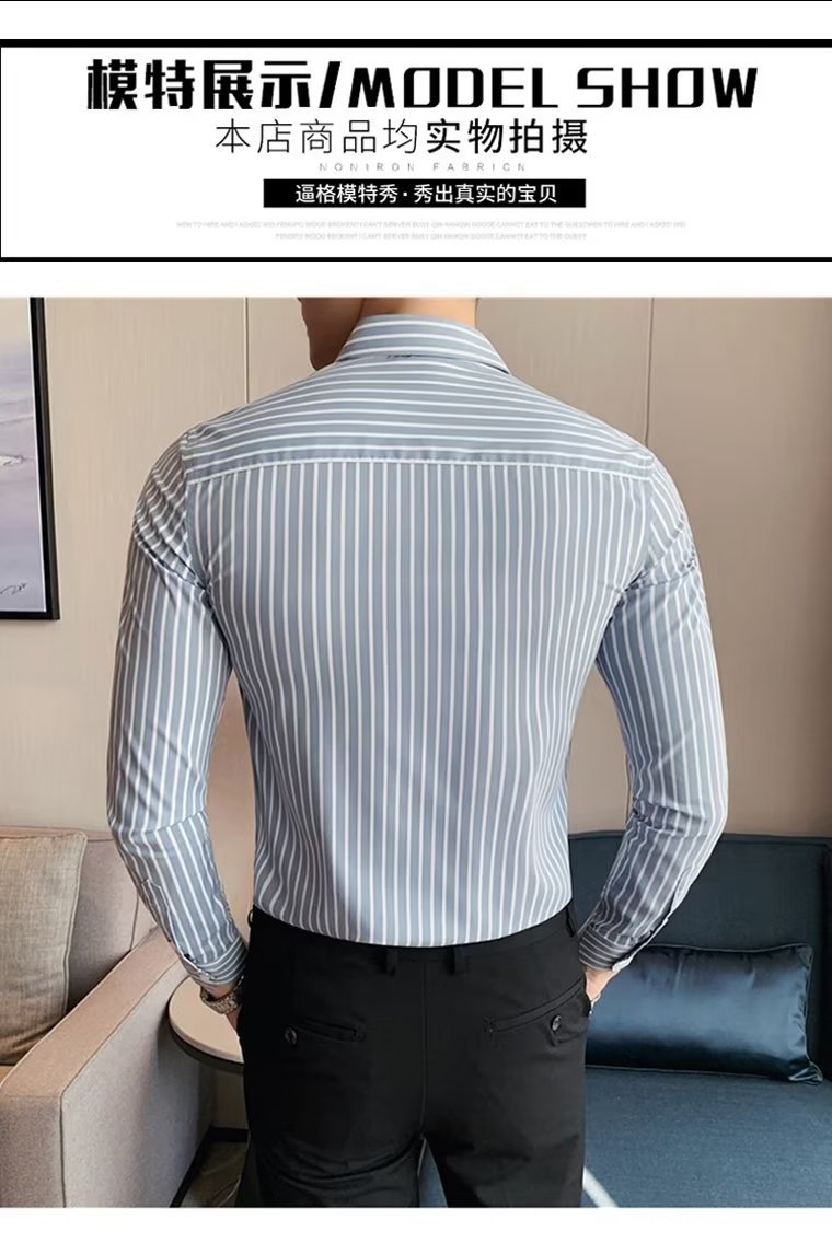 스트라이프 슬림핏 라이트 럭셔리 셔츠 남성용 고급 주름 방지 자수 셔츠 한국 스타일 고급 레트로 비즈니스 캐주얼 셔츠