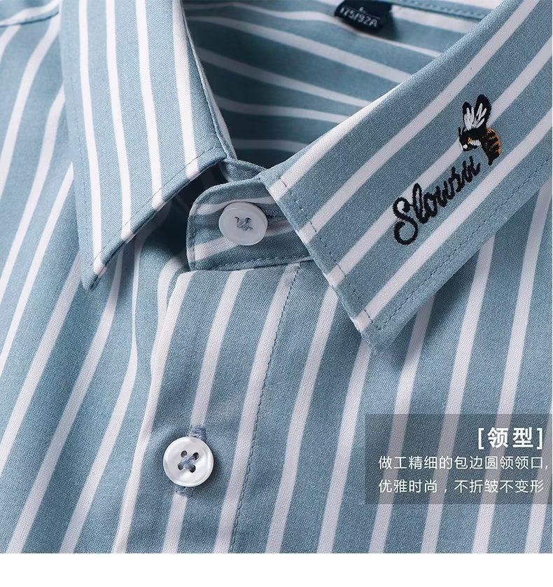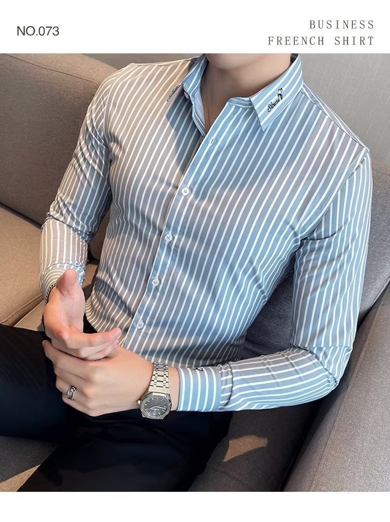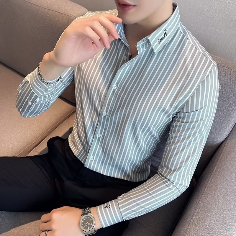 스트라이프 슬림핏 라이트 럭셔리 셔츠 남성용 고급 주름 방지 자수 셔츠 한국 스타일 고급 레트로 비즈니스 캐주얼 셔츠스토어 가기