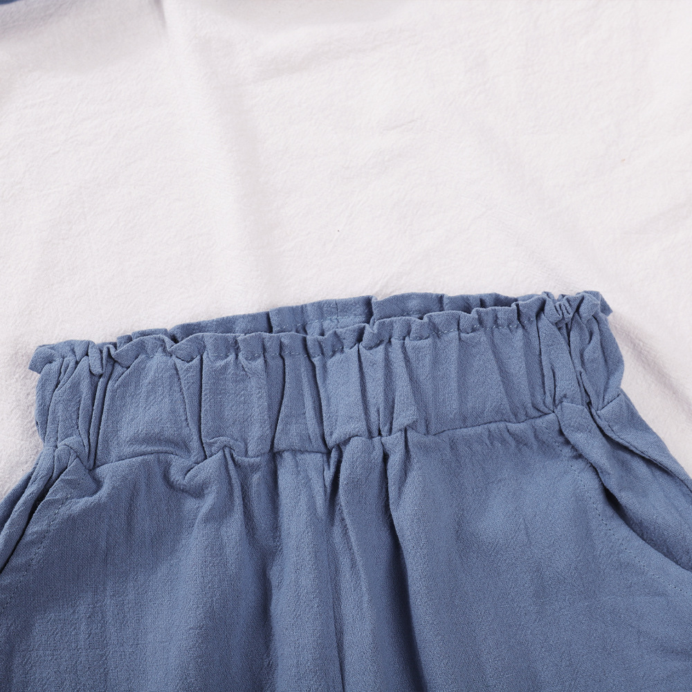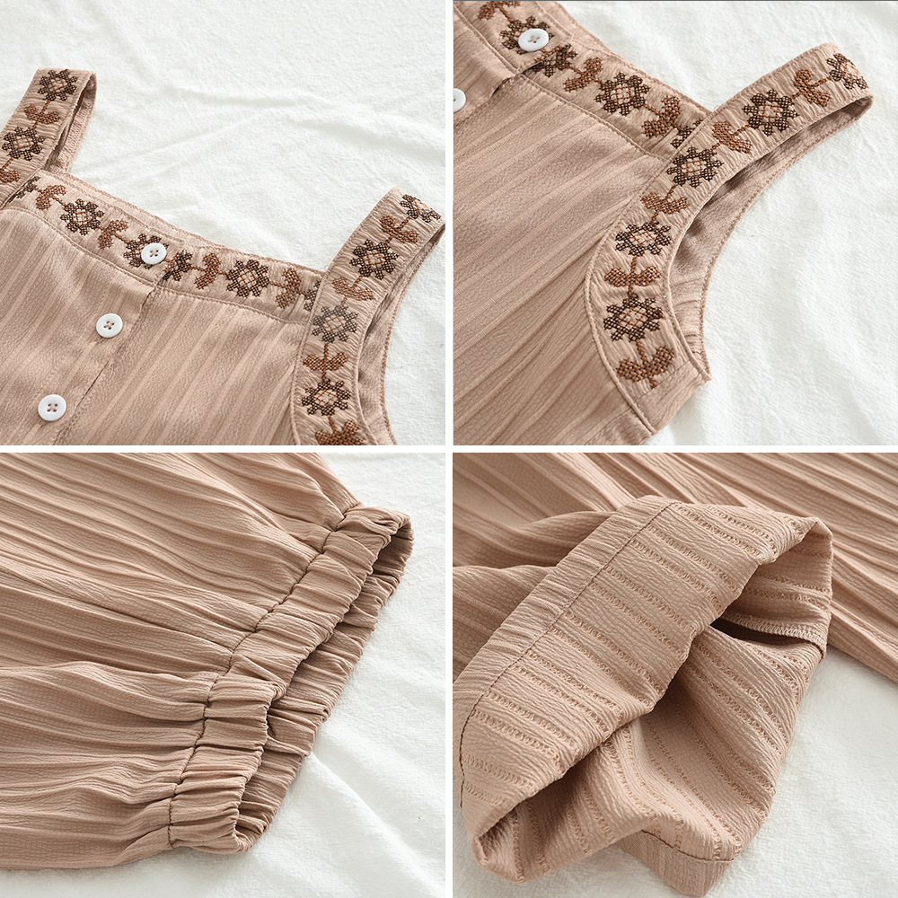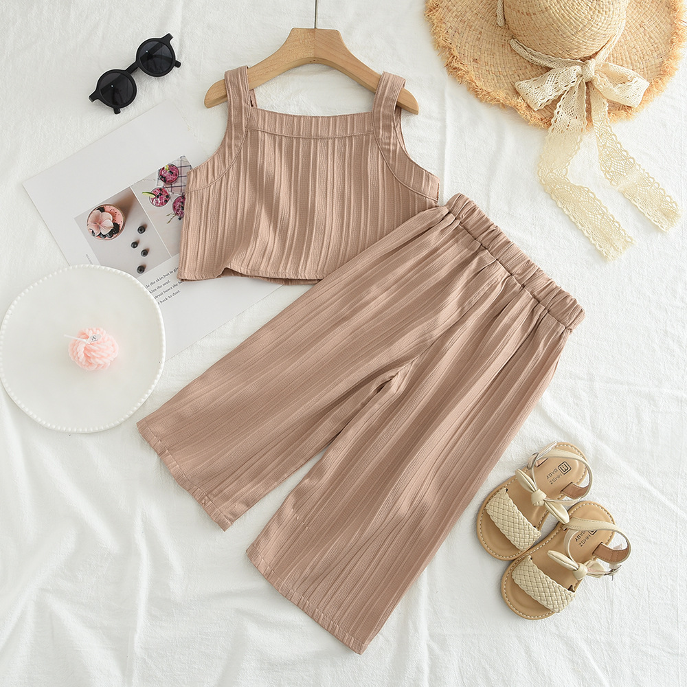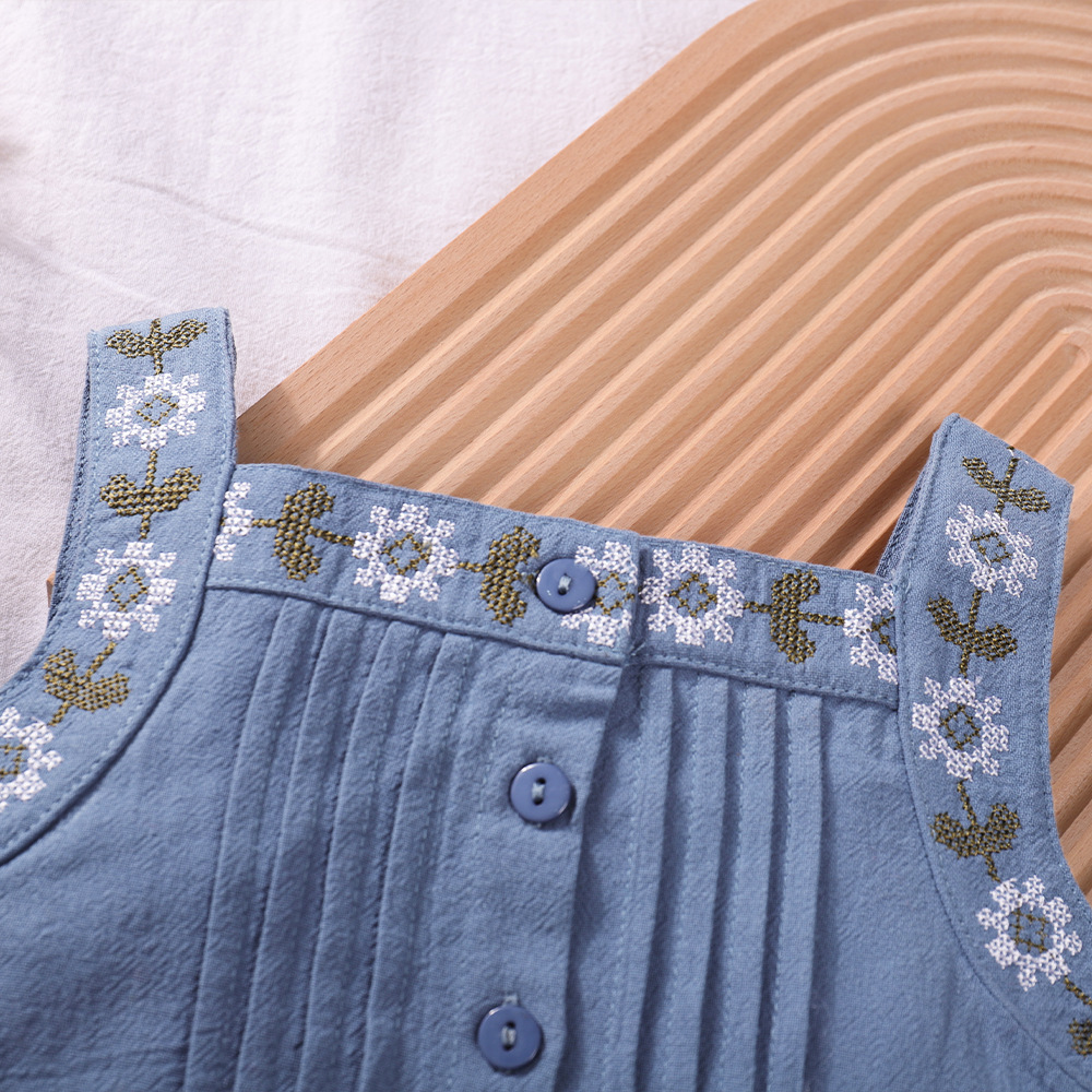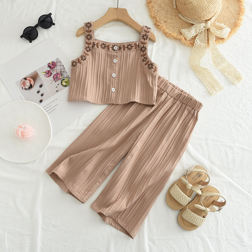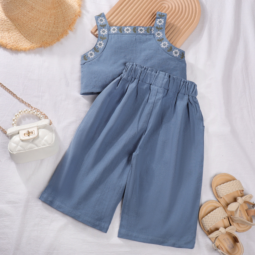 여아 민소매 세트 여름 새로운 한국 스타일 슬링 와이드 레그 팬츠 투피스 자수 빈티지 면과 린넨 바지 세트