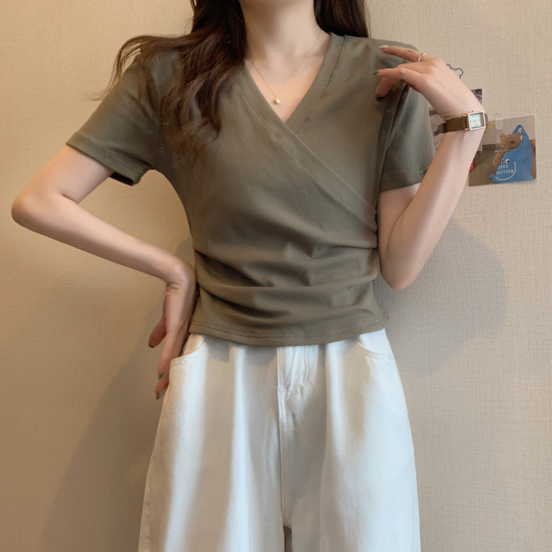 크로스 브이넥 반팔 티셔츠 여성용 2023 여름 새로운 디자인 센스 슬림핏 짧은 학생 슬림핏 트렌디 탑스토어 가기