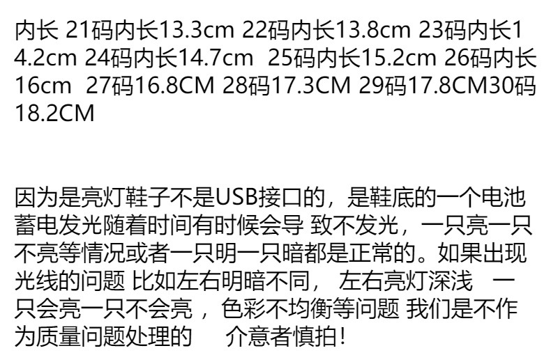 内长 21码内长13.3cm 22码内长13.8cm 23码内长14.2cm 24码内长14.7cm  25码内长15.2cm 26码内长16cm  27码16.8CM 28码17.3CM 29码17.8CM30码18.2CM