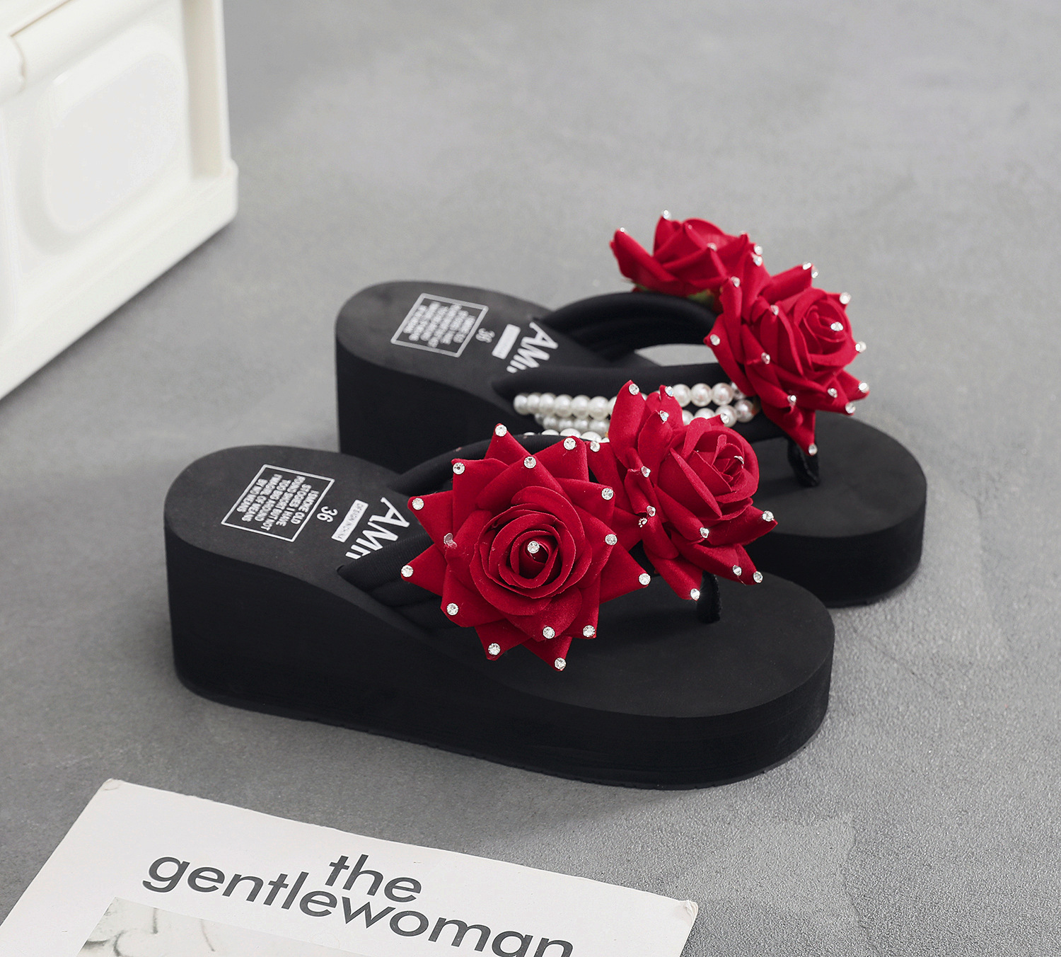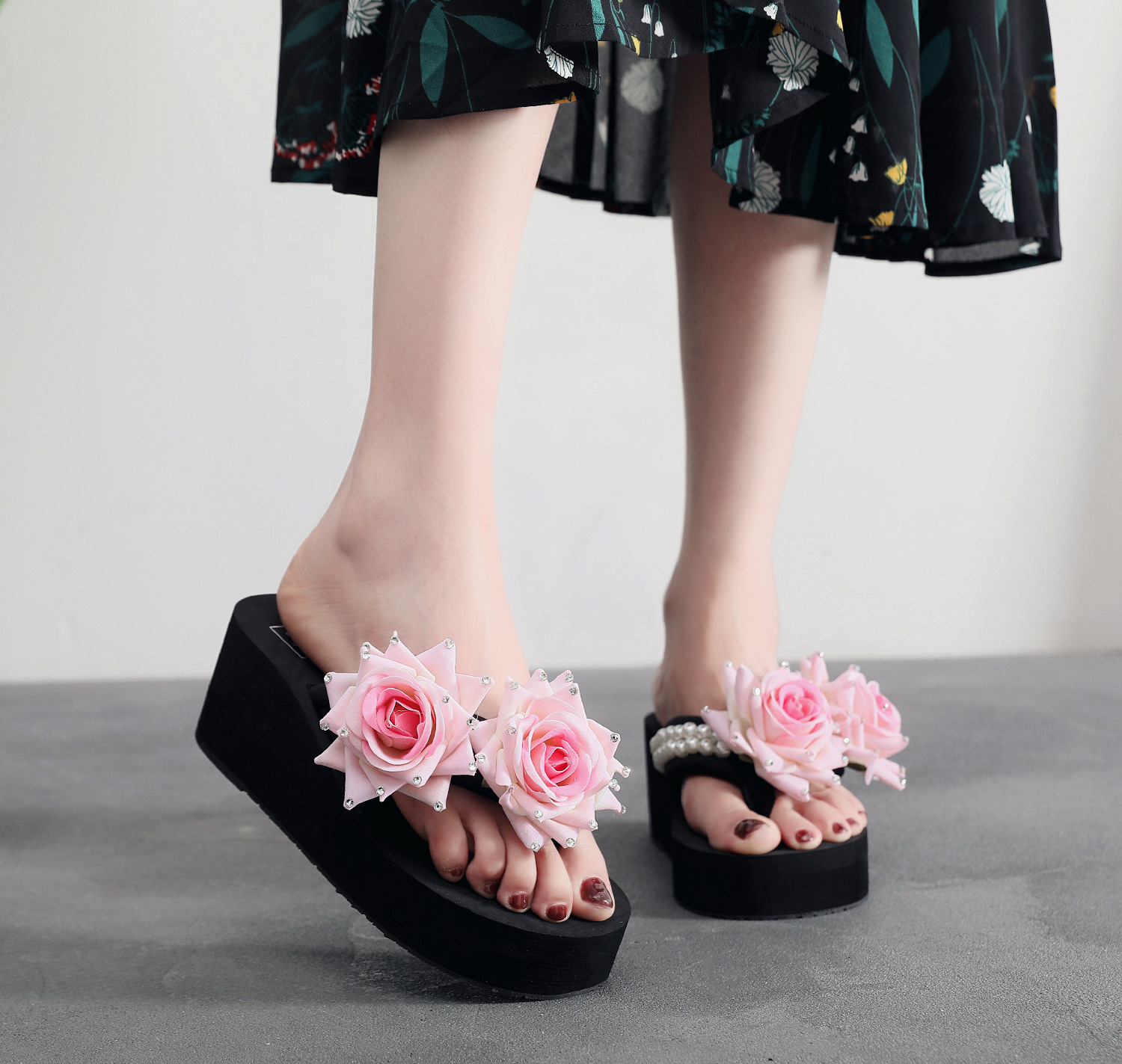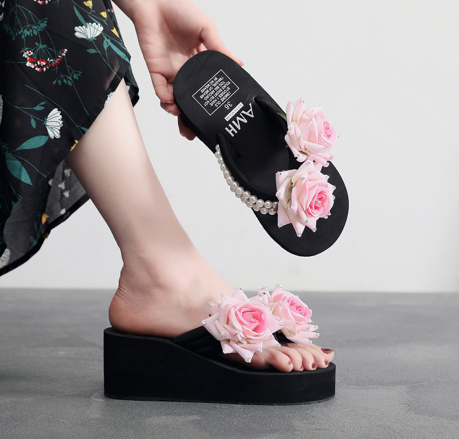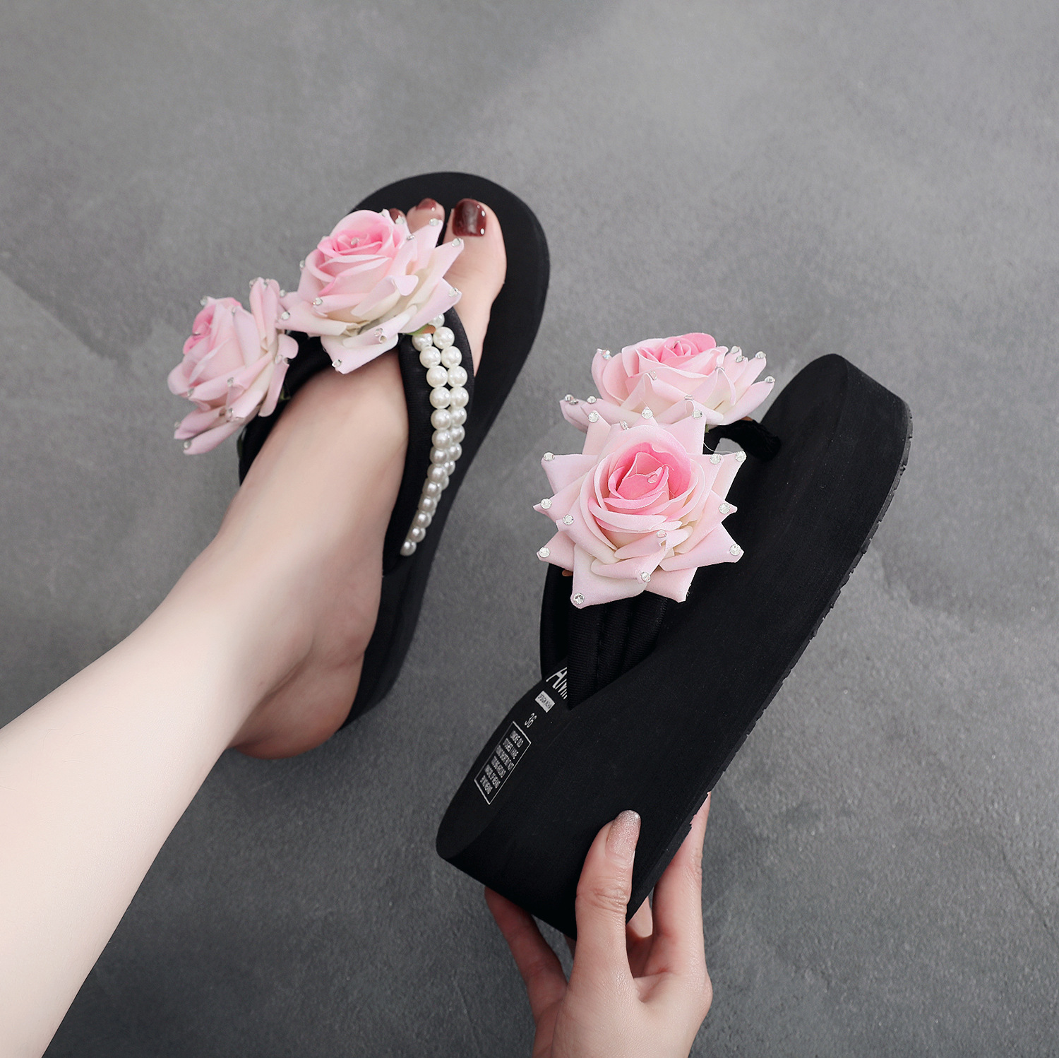 슬리퍼 여성용 여름 신상품 수제 장미 꽃 진주 웨지 두꺼운 바닥 달콤한 비치 슬리퍼 트렌디스토어 가기