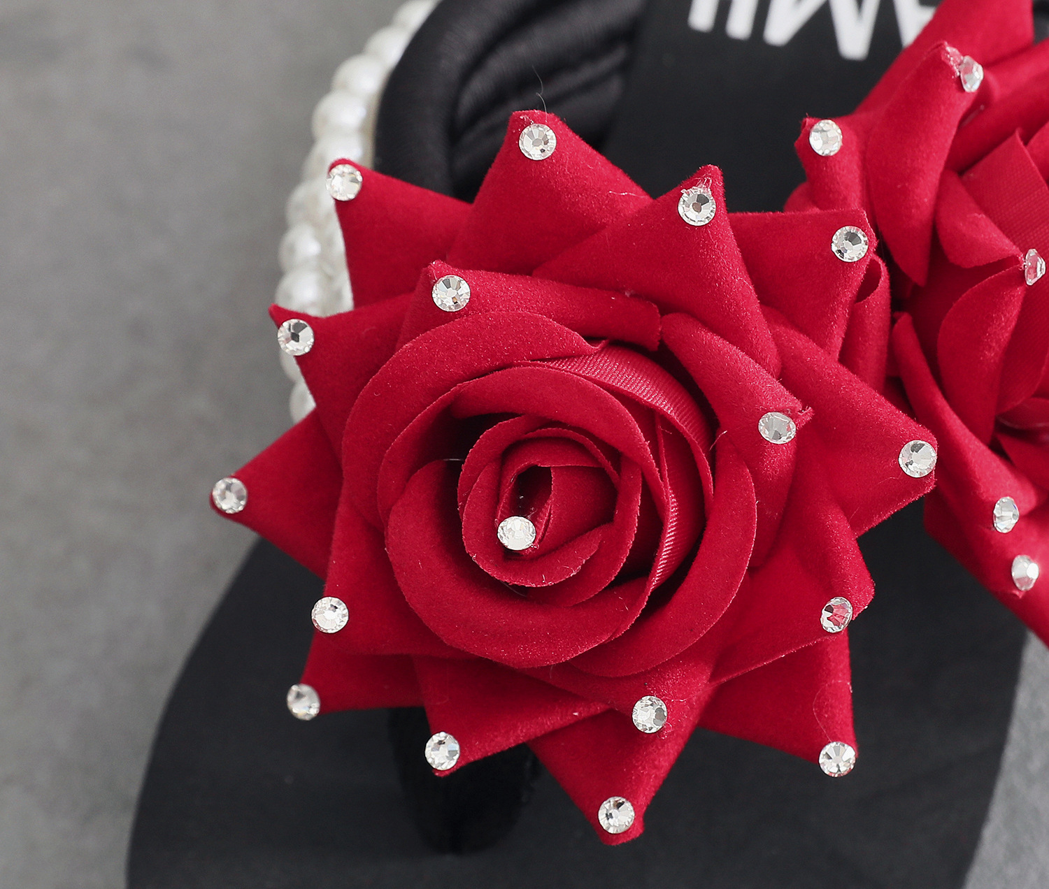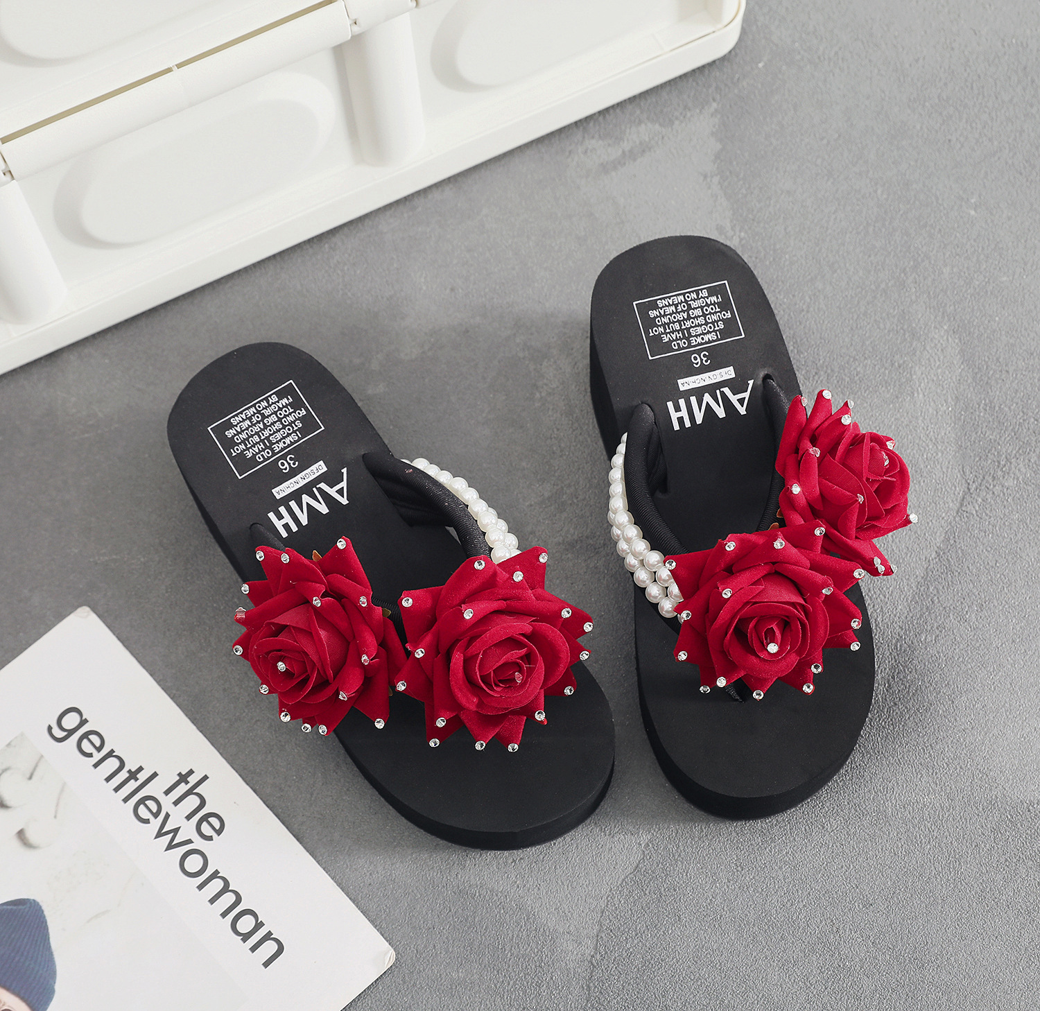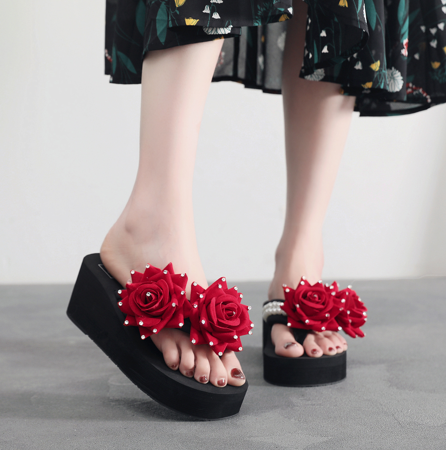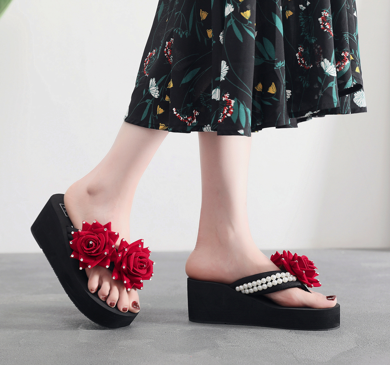 슬리퍼 여성용 여름 신상품 수제 장미 꽃 진주 웨지 두꺼운 바닥 달콤한 비치 슬리퍼 트렌디스토어 가기