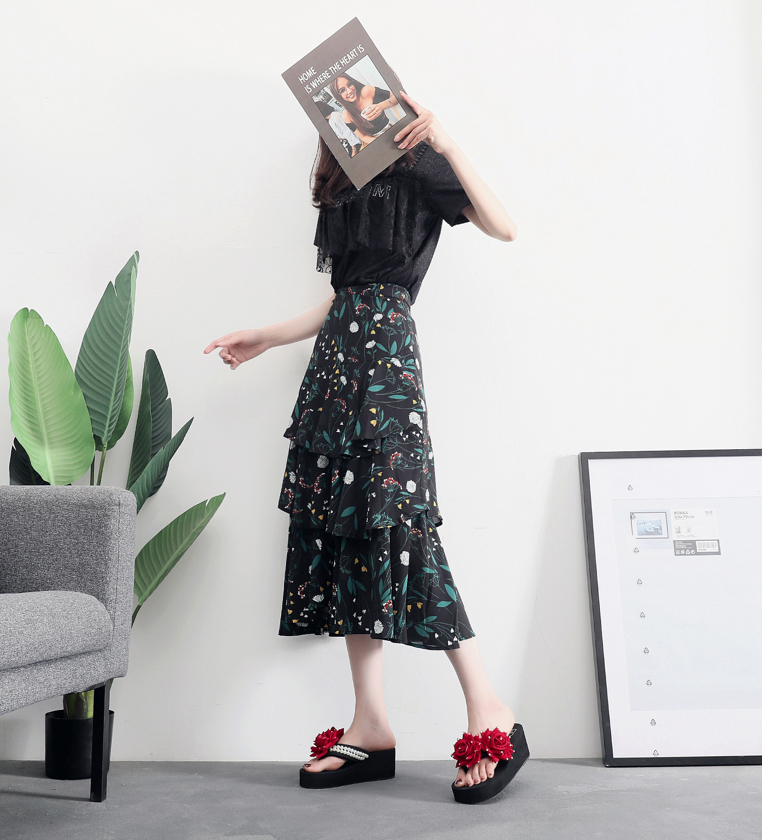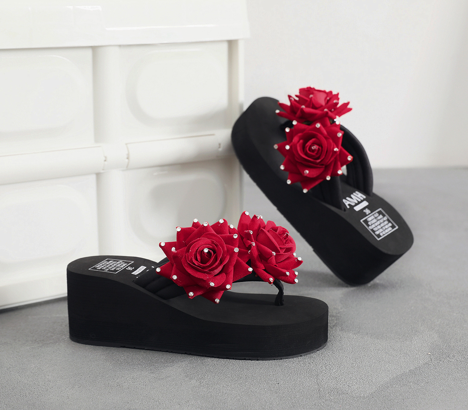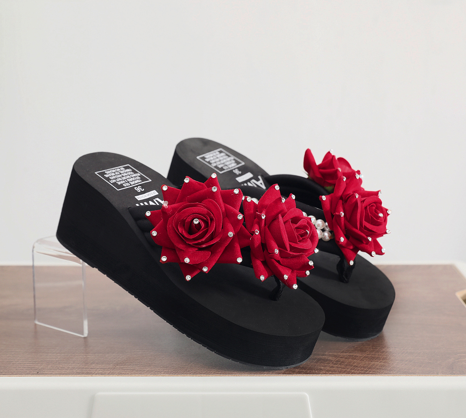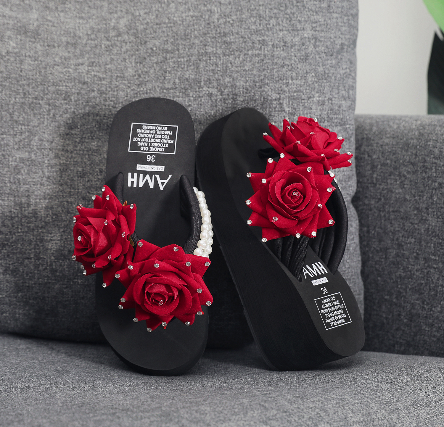 슬리퍼 여성용 여름 신상품 수제 장미 꽃 진주 웨지 두꺼운 바닥 달콤한 비치 슬리퍼 트렌디스토어 가기