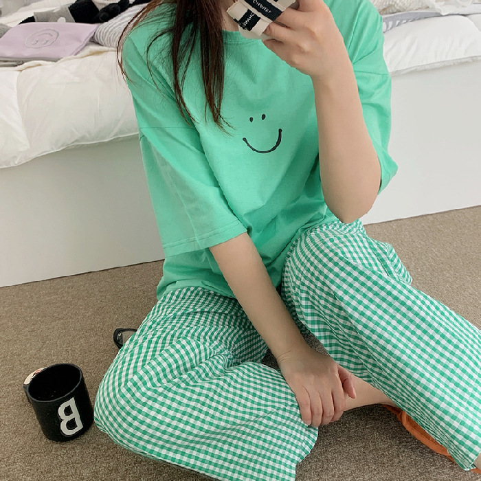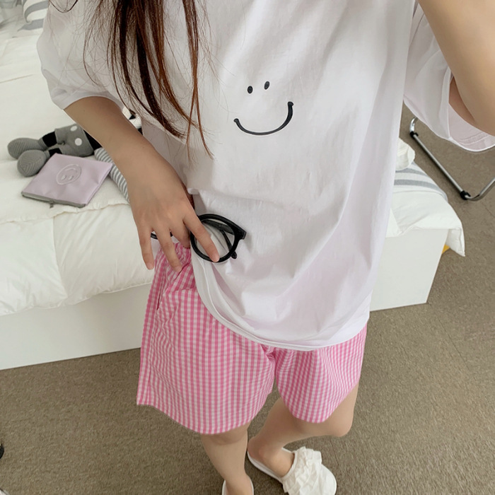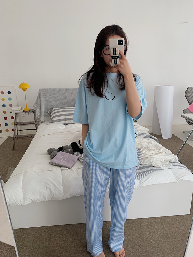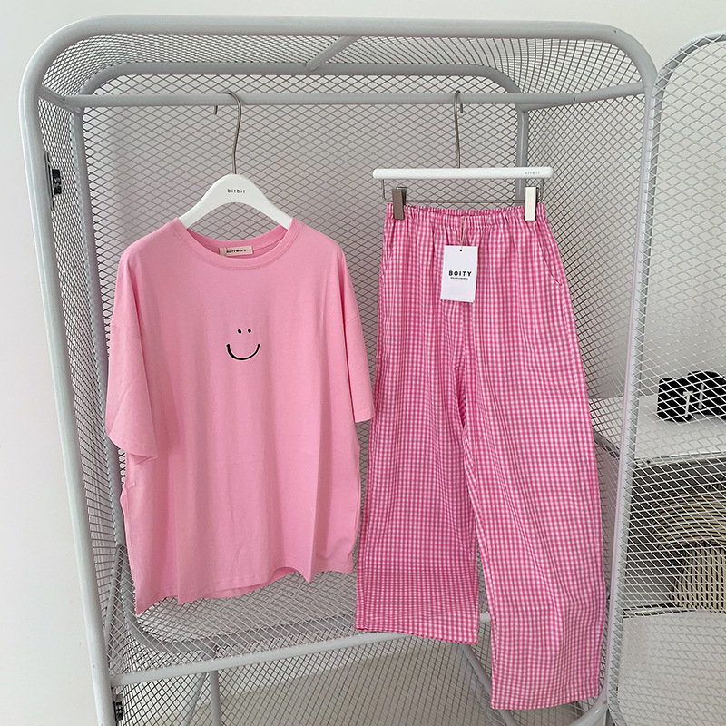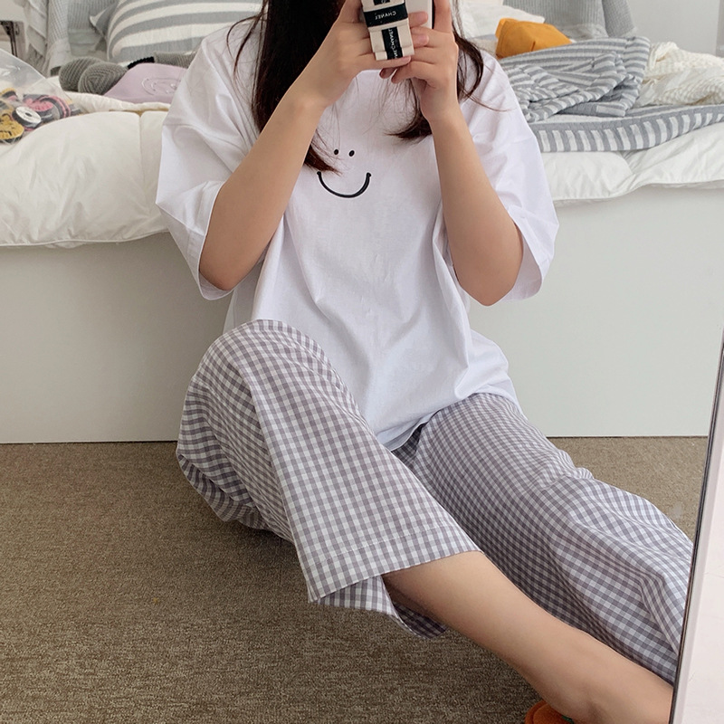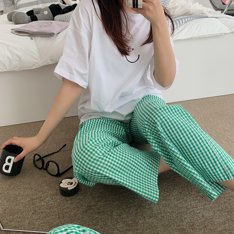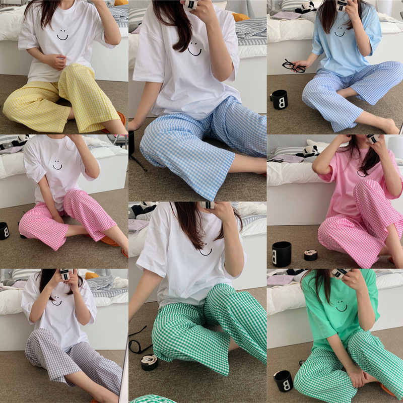 한국식 2024 여름 새 잠옷 여성의 작은 웃는 얼굴 짧은 긴 격자 무늬 느슨한 캐주얼 세트 홈 웨어는 외부에서 착용 할 수 있습니다.스토어 가기