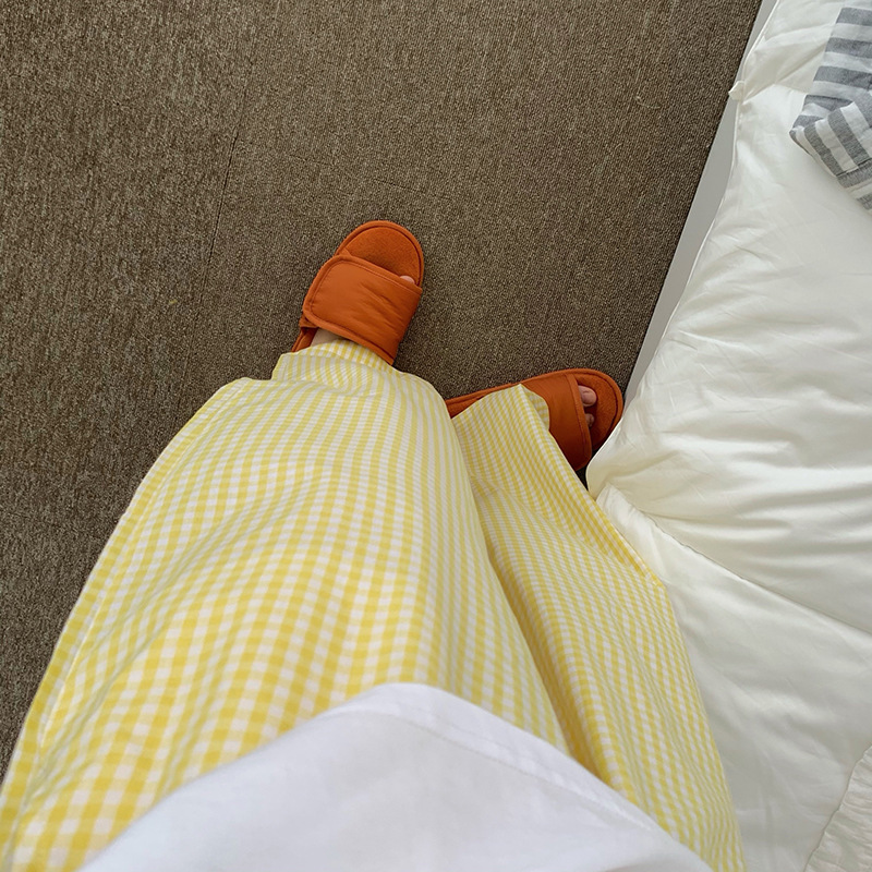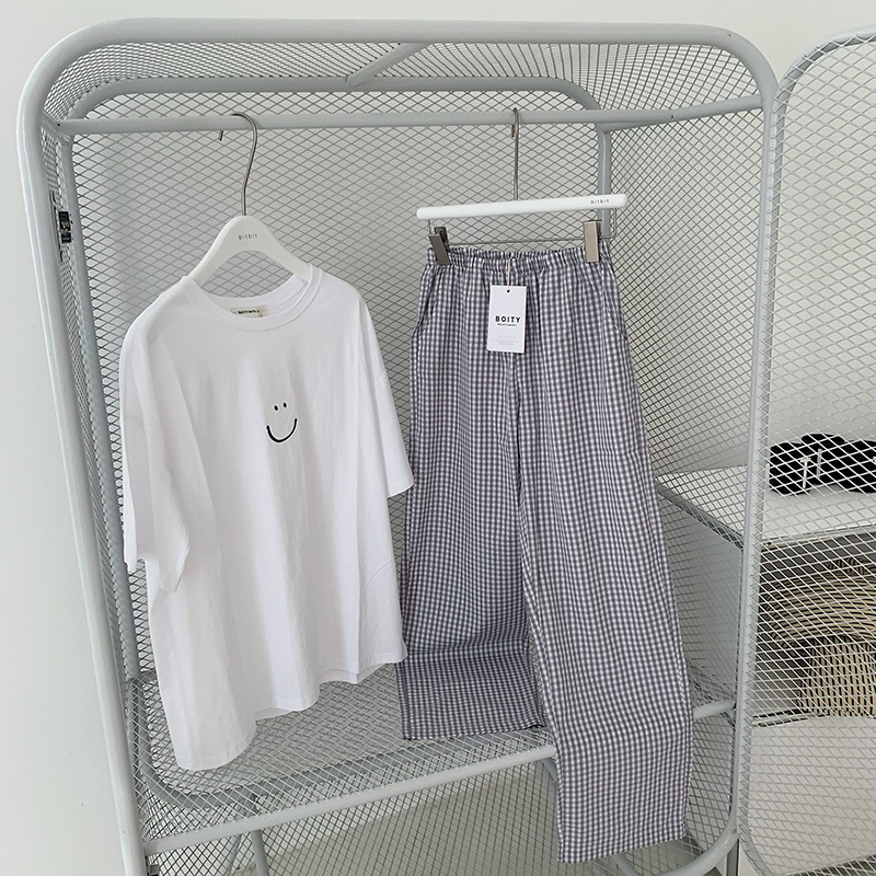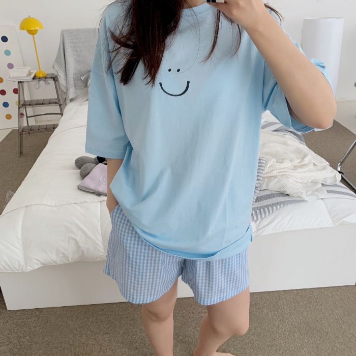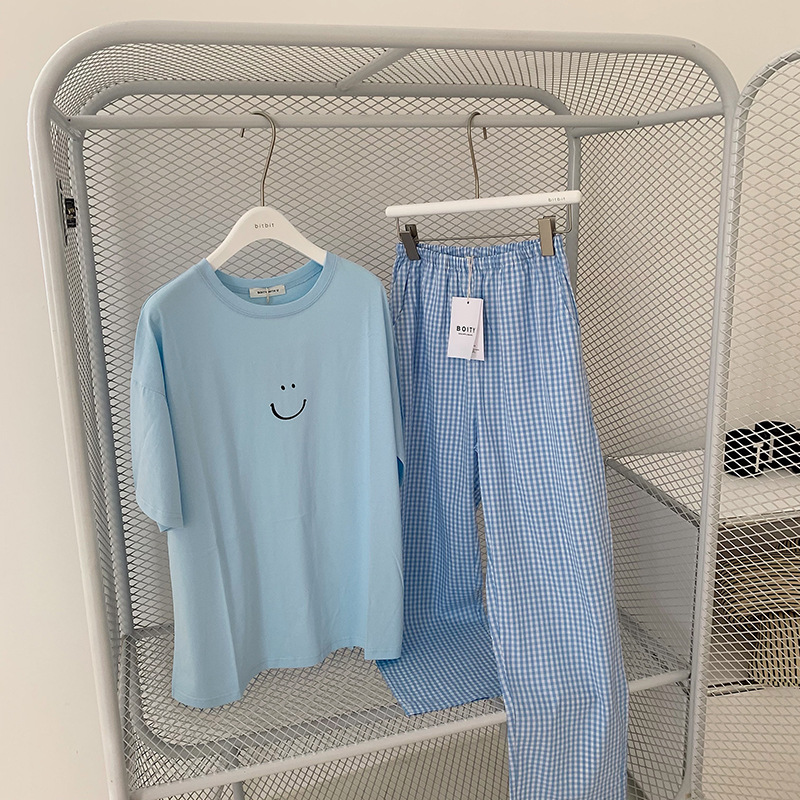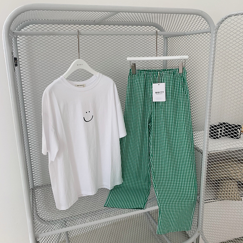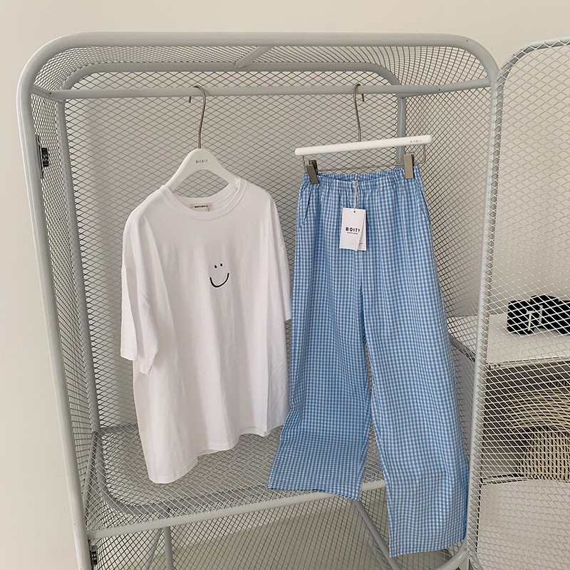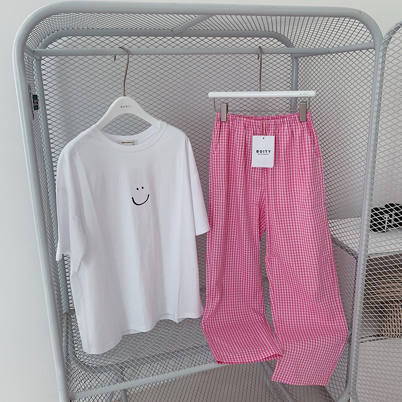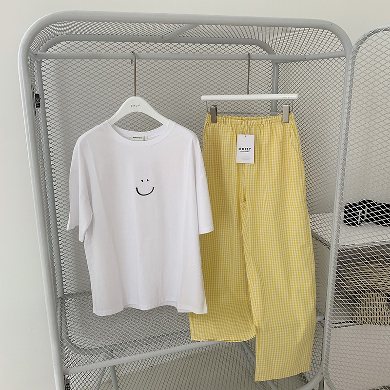 한국식 2024 여름 새 잠옷 여성의 작은 웃는 얼굴 짧은 긴 격자 무늬 느슨한 캐주얼 세트 홈 웨어는 외부에서 착용 할 수 있습니다.스토어 가기