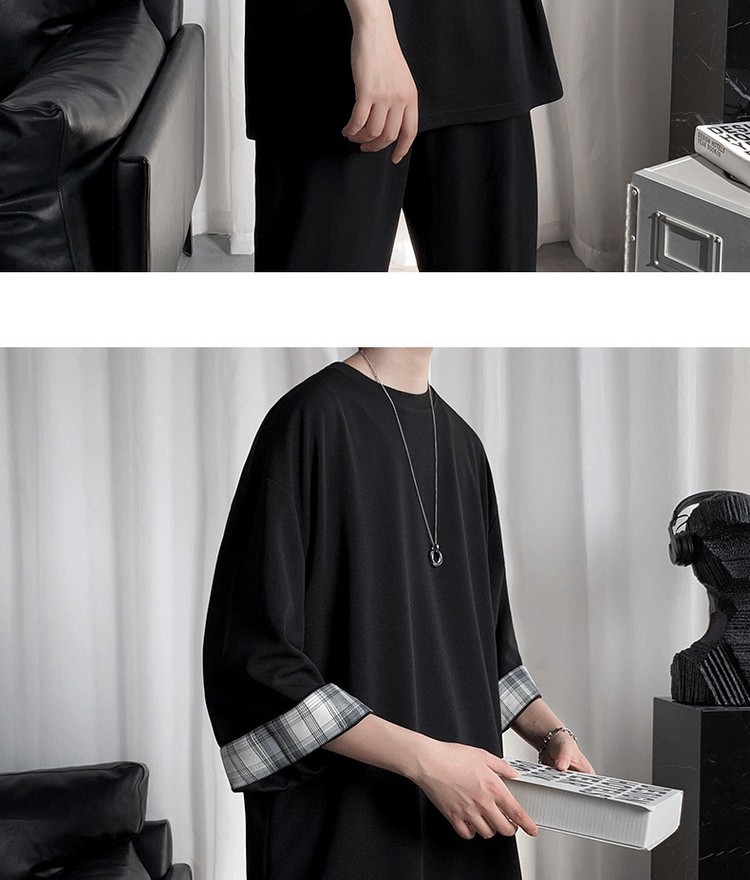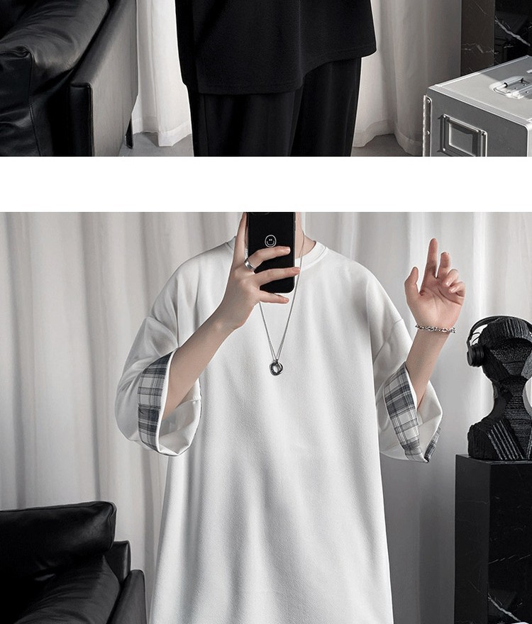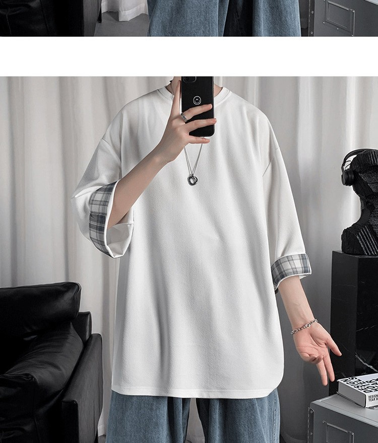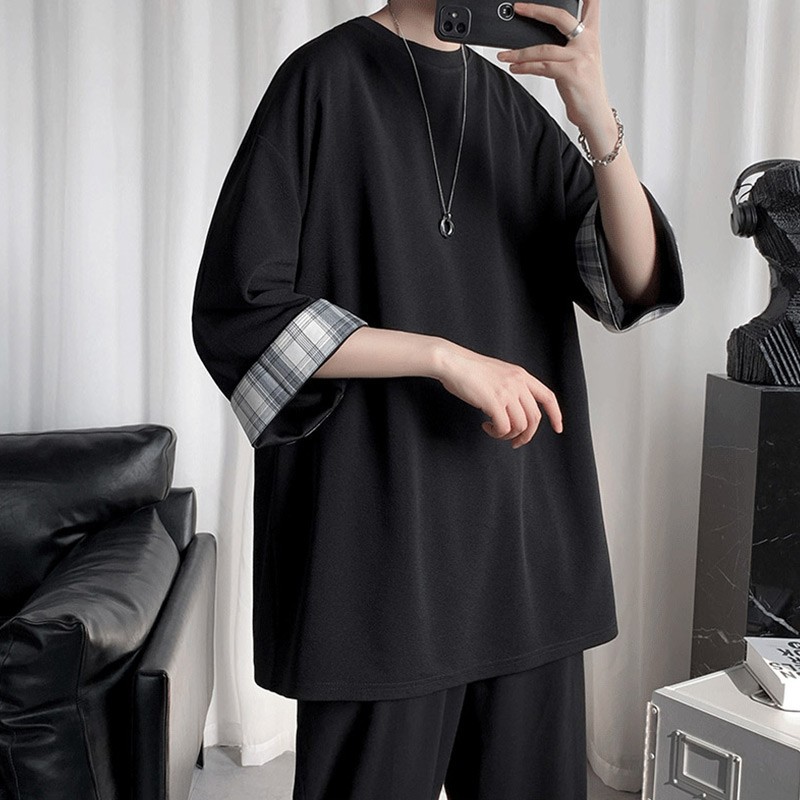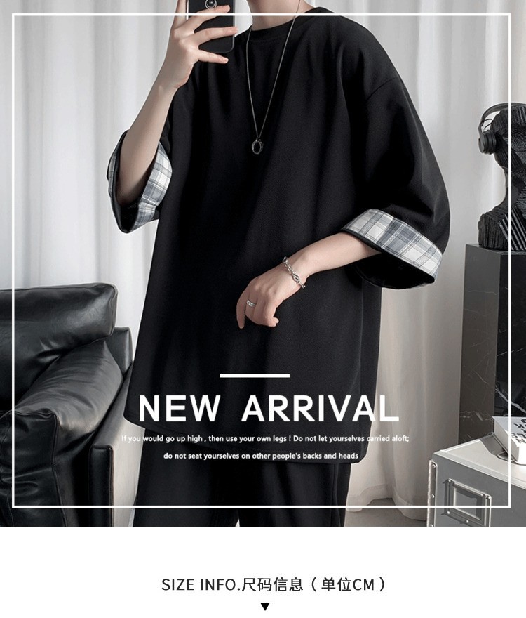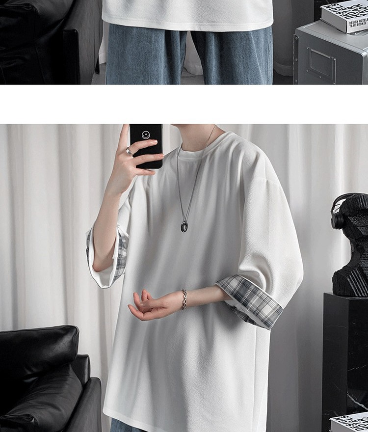 아이스 실크 반팔 남성 여름 얇은 패션 브랜드 프릴 잘 생긴 드레이핑 티셔츠 홍콩 스타일 느슨한 bf 게으른 스타일 스티칭 7 3/4 소매스토어 가기