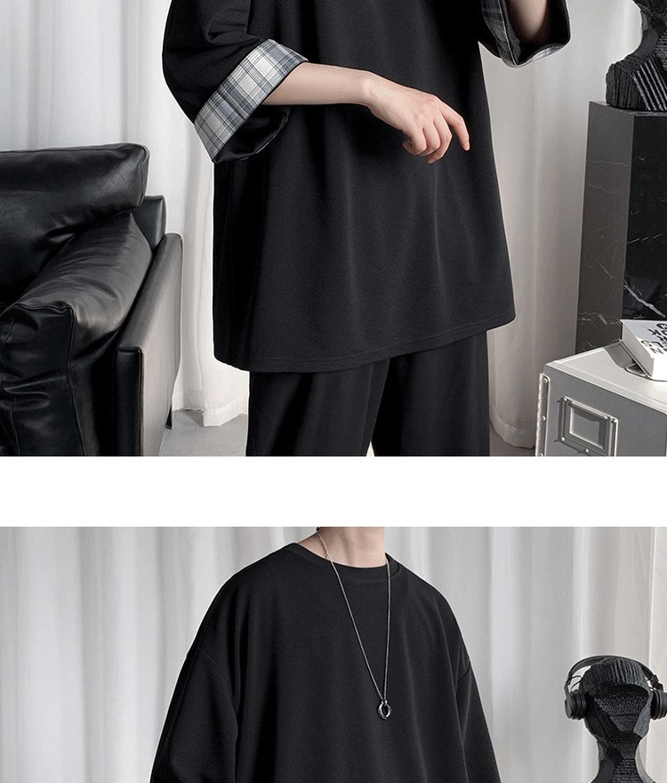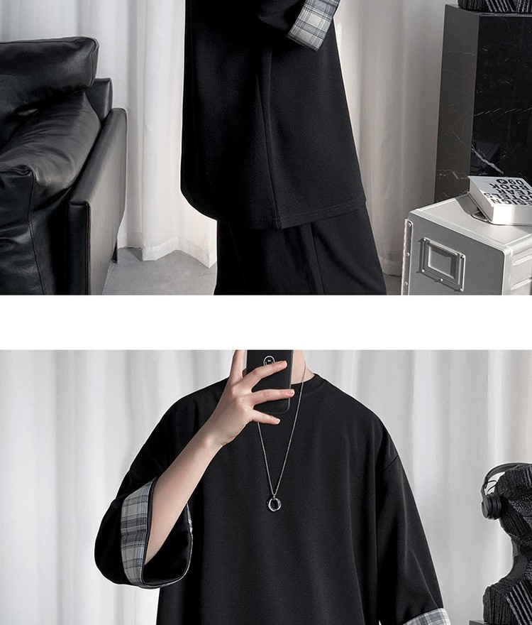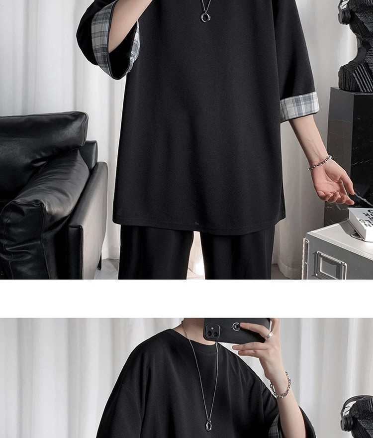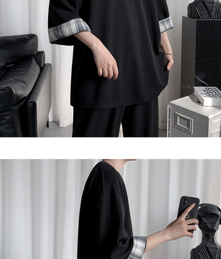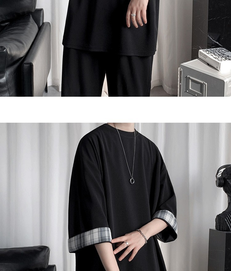 아이스 실크 반팔 남성 여름 얇은 패션 브랜드 프릴 잘 생긴 드레이핑 티셔츠 홍콩 스타일 느슨한 bf 게으른 스타일 스티칭 7 3/4 소매스토어 가기