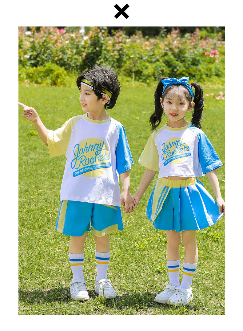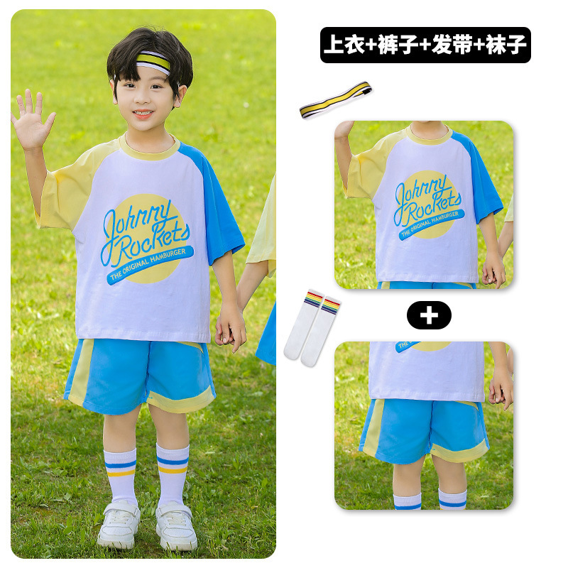 • 세트 상품: [415D 남성용 블루 & 옐로우 반팔 티셔츠 + 418D 블루 배색 반바지] + 옐로우 & 화이트 헤어밴드 + 레인보우 양말