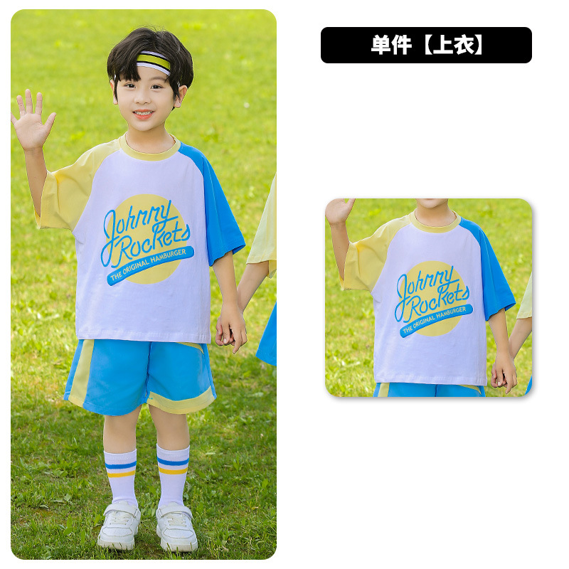 • 세트 상품: [415D 남성용 블루 & 옐로우 반팔 티셔츠 + 418D 블루 배색 반바지] + 레인보우 양말