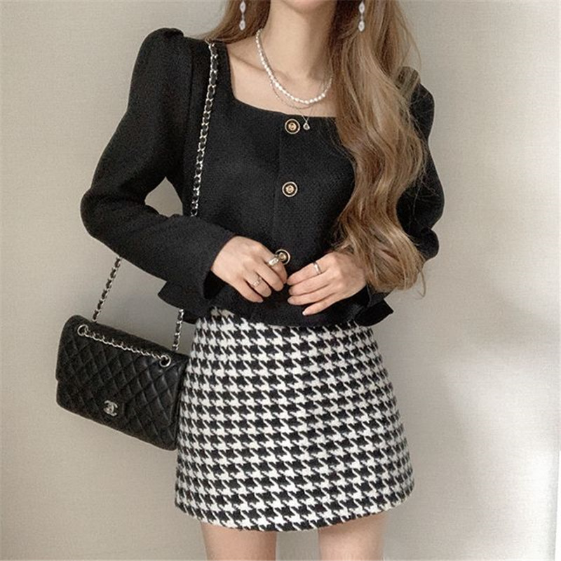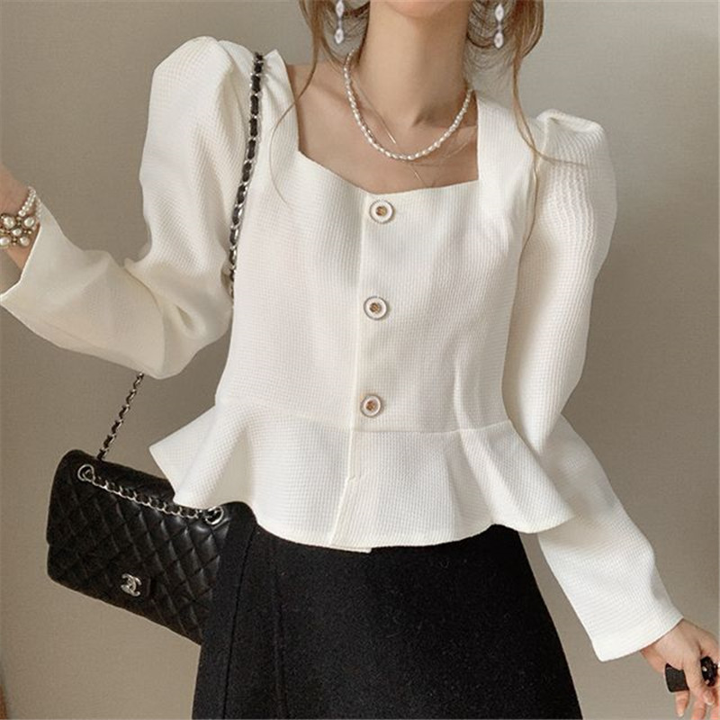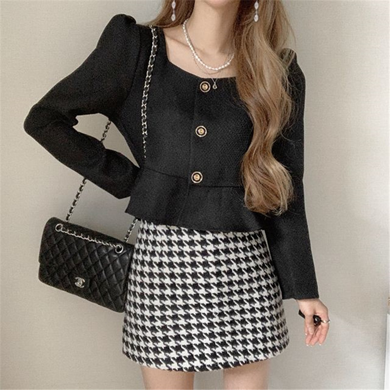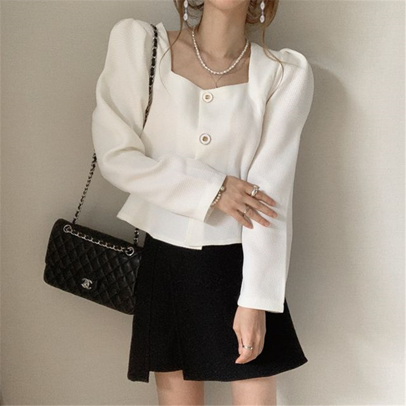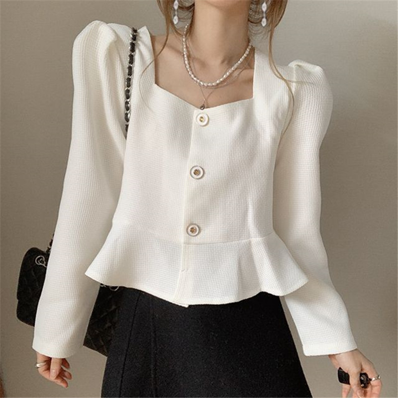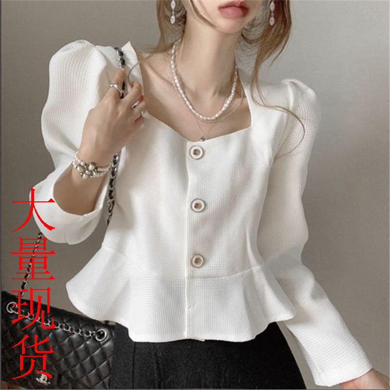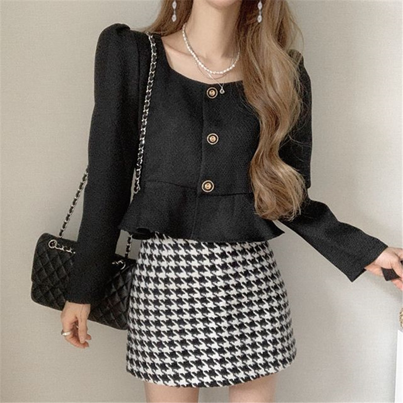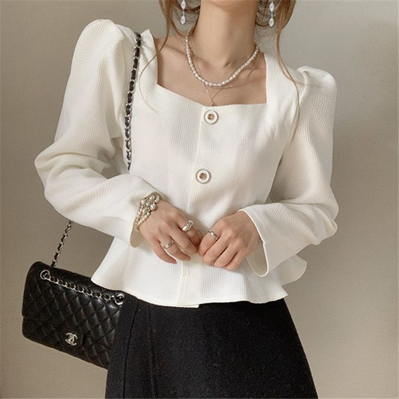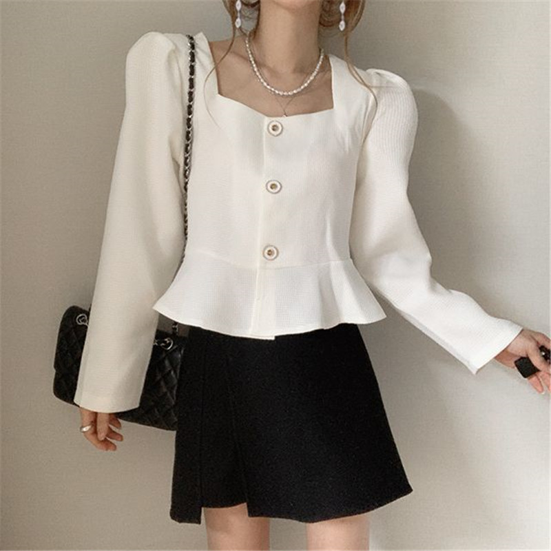 한국식 숙녀 러플 탑 긴팔 싱글 브레스트 스퀘어 칼라 단색 짧은 재킷