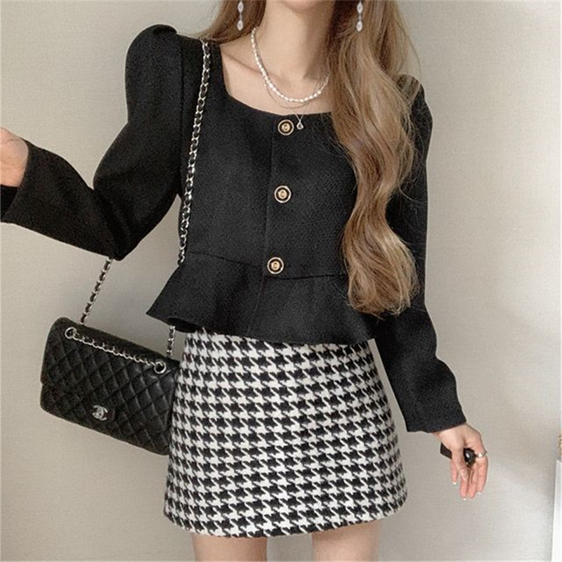 한국식 숙녀 러플 탑 긴팔 싱글 브레스트 스퀘어 칼라 단색 짧은 재킷스토어 가기
