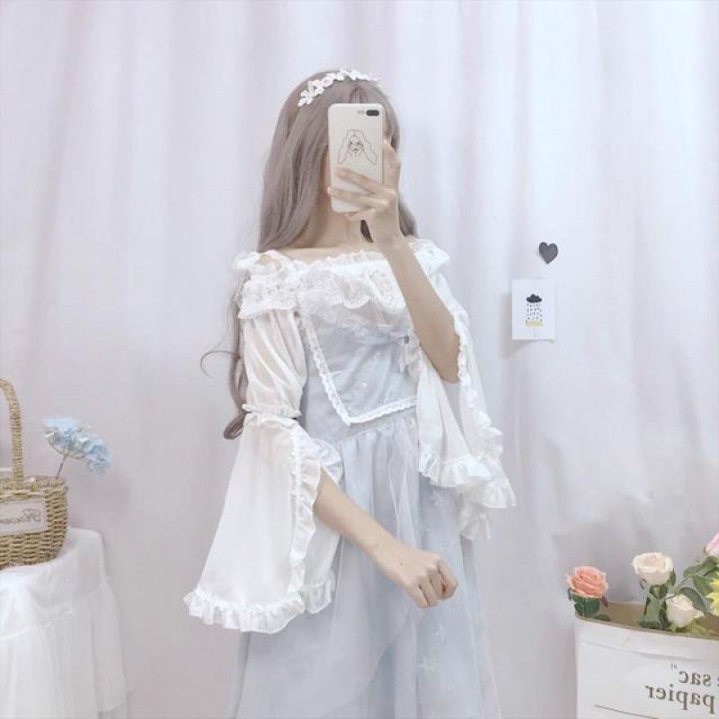 새로운 일본식 부드러운 소녀 레이스 바닥 로리타 내부 스트랩 오프 넥 공주 슬리브 벨 슬리브 쉬폰 셔츠 탑스토어 가기