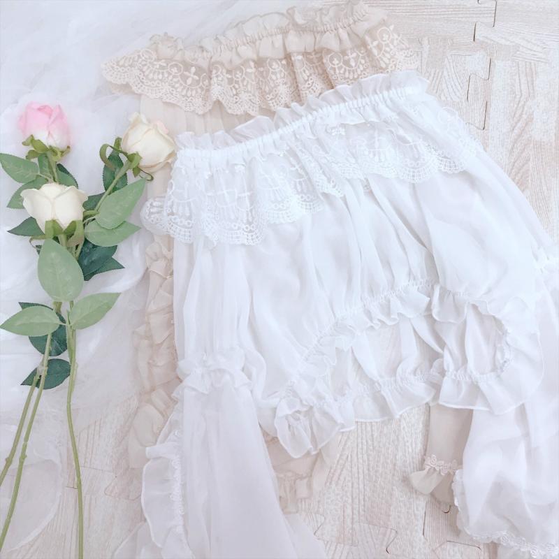 새로운 일본식 부드러운 소녀 레이스 바닥 로리타 내부 스트랩 오프 넥 공주 슬리브 벨 슬리브 쉬폰 셔츠 탑