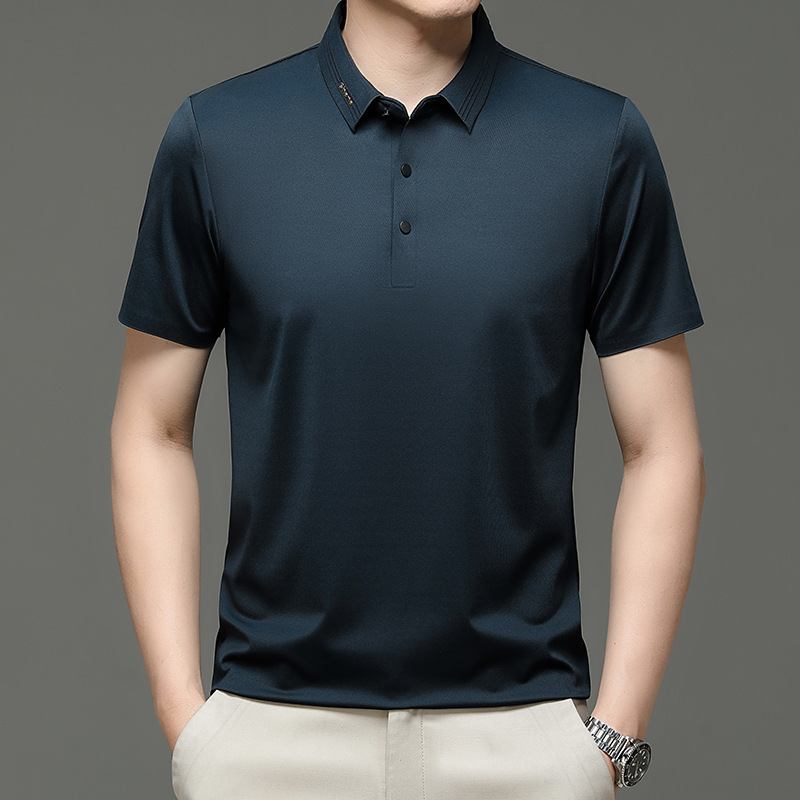 2023 여름 새 옷깃 반팔 단색 폴로 셔츠 아이스 실크 추적 없는 패션 캐주얼 중년 남성 티셔츠