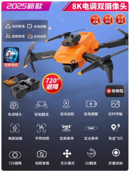 • 자동장애물회피】업그레이드 모델☆8K 고화질 듀얼 카메라 [무료 보관 가방 + 정품 배터리] 주황색 지능형 높이 설정 및 원클릭 복귀