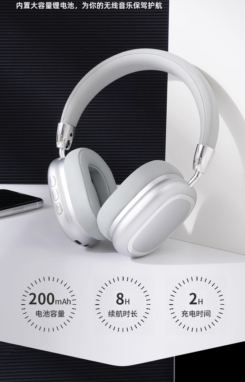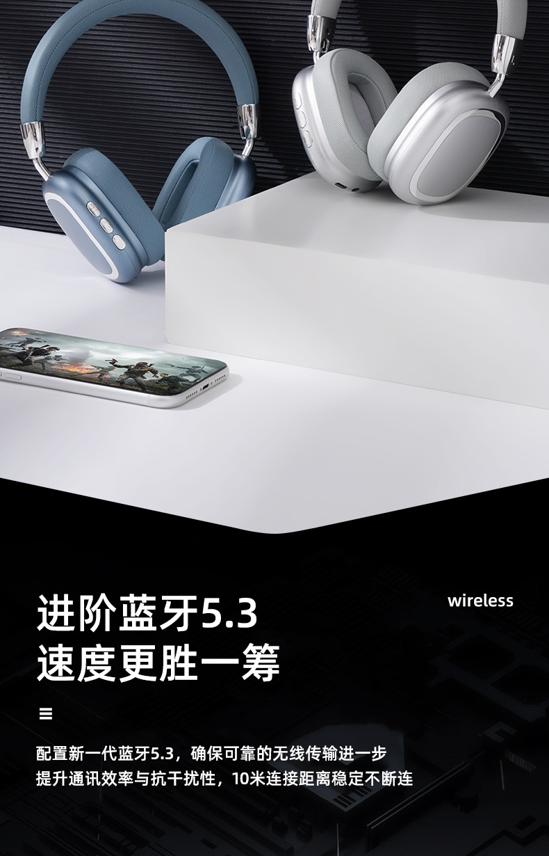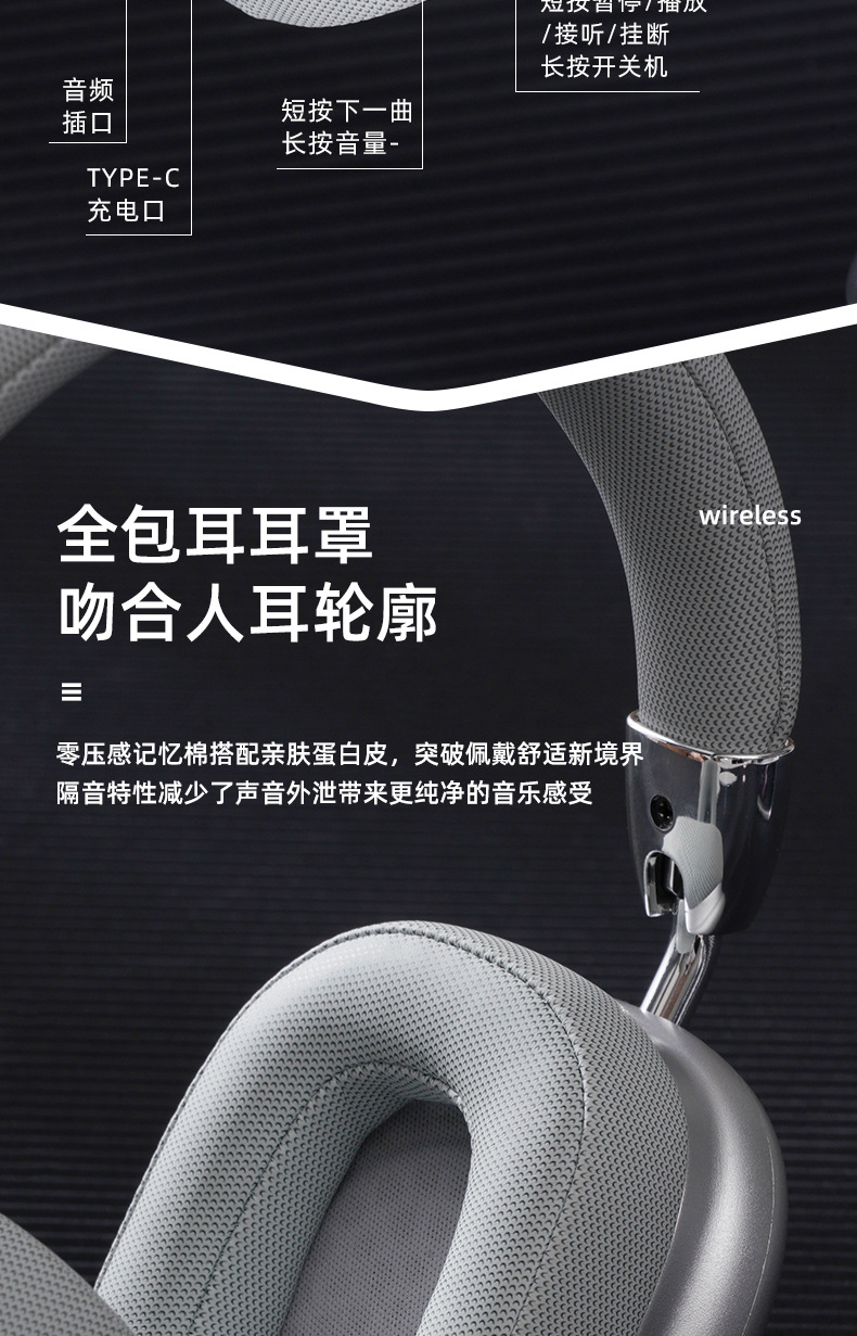 本产品使用了新型蓝牙5.3协议,ty-c充电插孔。皮革头梁,可折叠收纳
