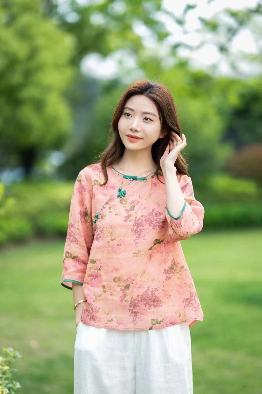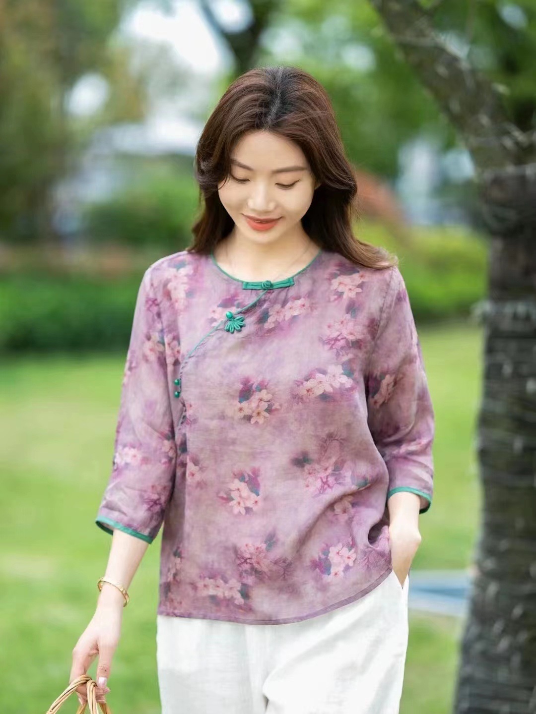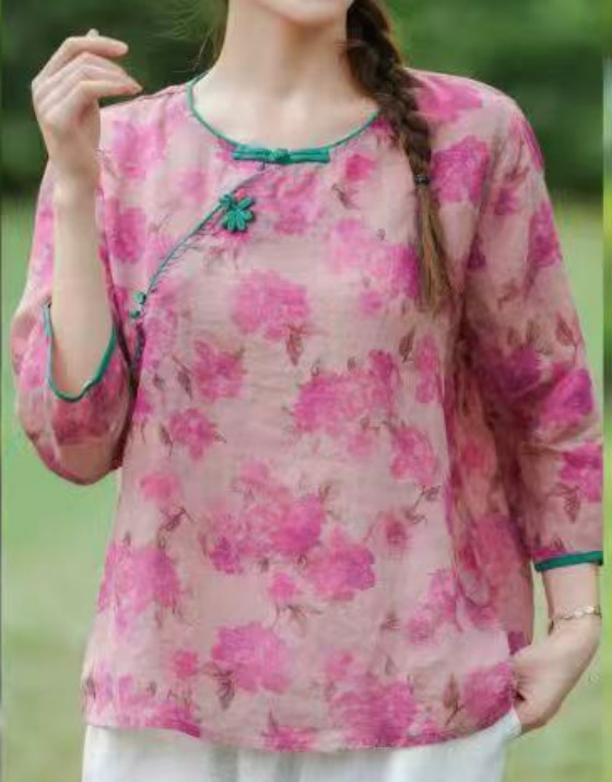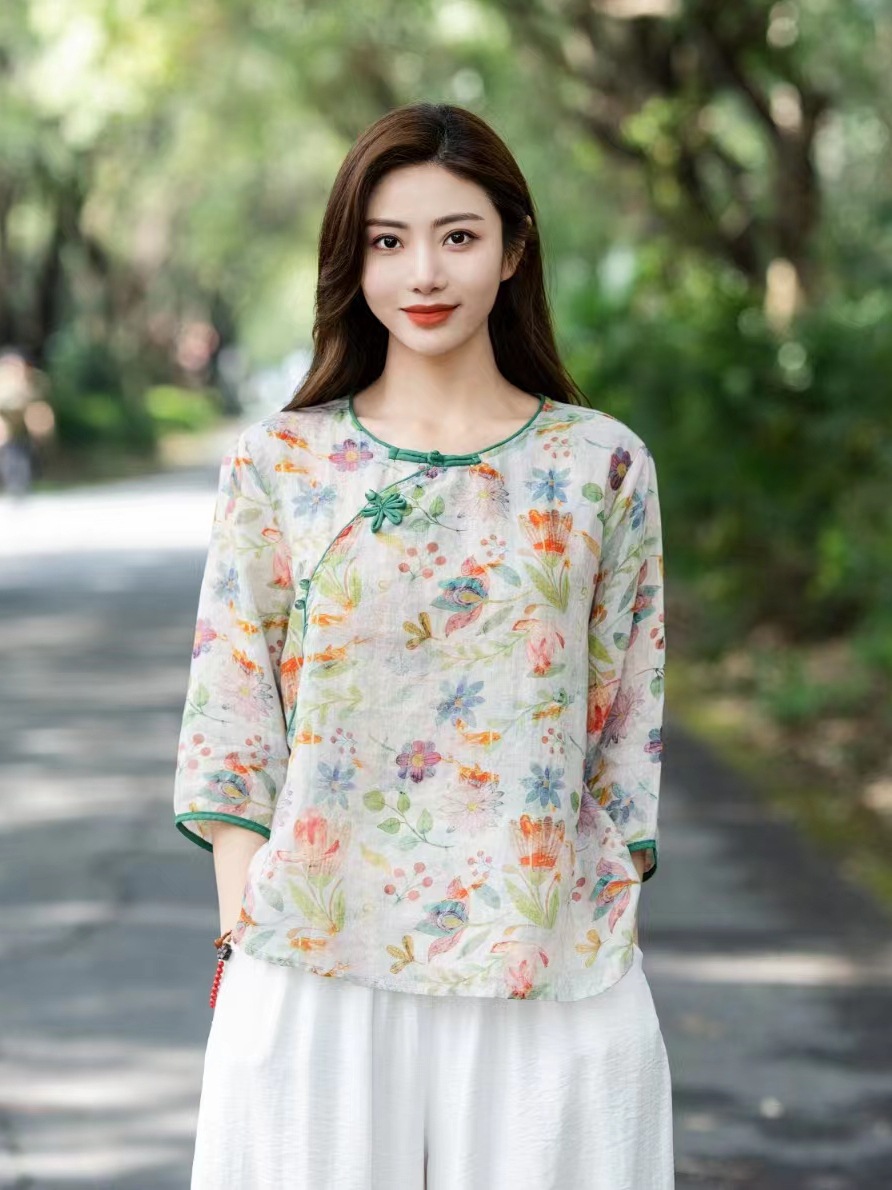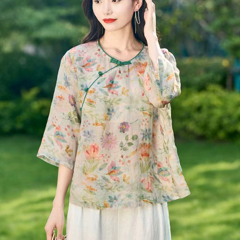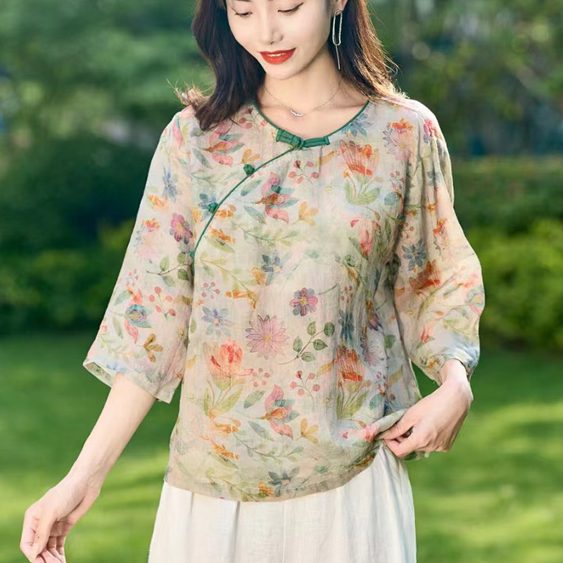 여름 새로운 예술적 복고풍 작물 버클 슬랜트 플래켓 셔츠 유명한 민족 스타일 작은 꽃 라미 탑 여성을위한 개선 된 차 의류스토어 가기