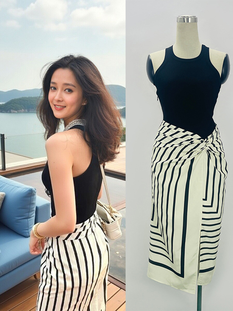 재고 양 Caiyu 같은 옷 스트라이프 실크 스카프 스커트 가짜 투피스 원피스 슬림 한 찾고 스티치 조끼 스커트스토어 가기