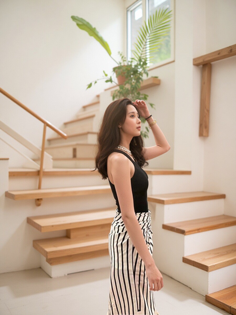 • 살구색 블랙 스트립 가짜 두 조각 원피스