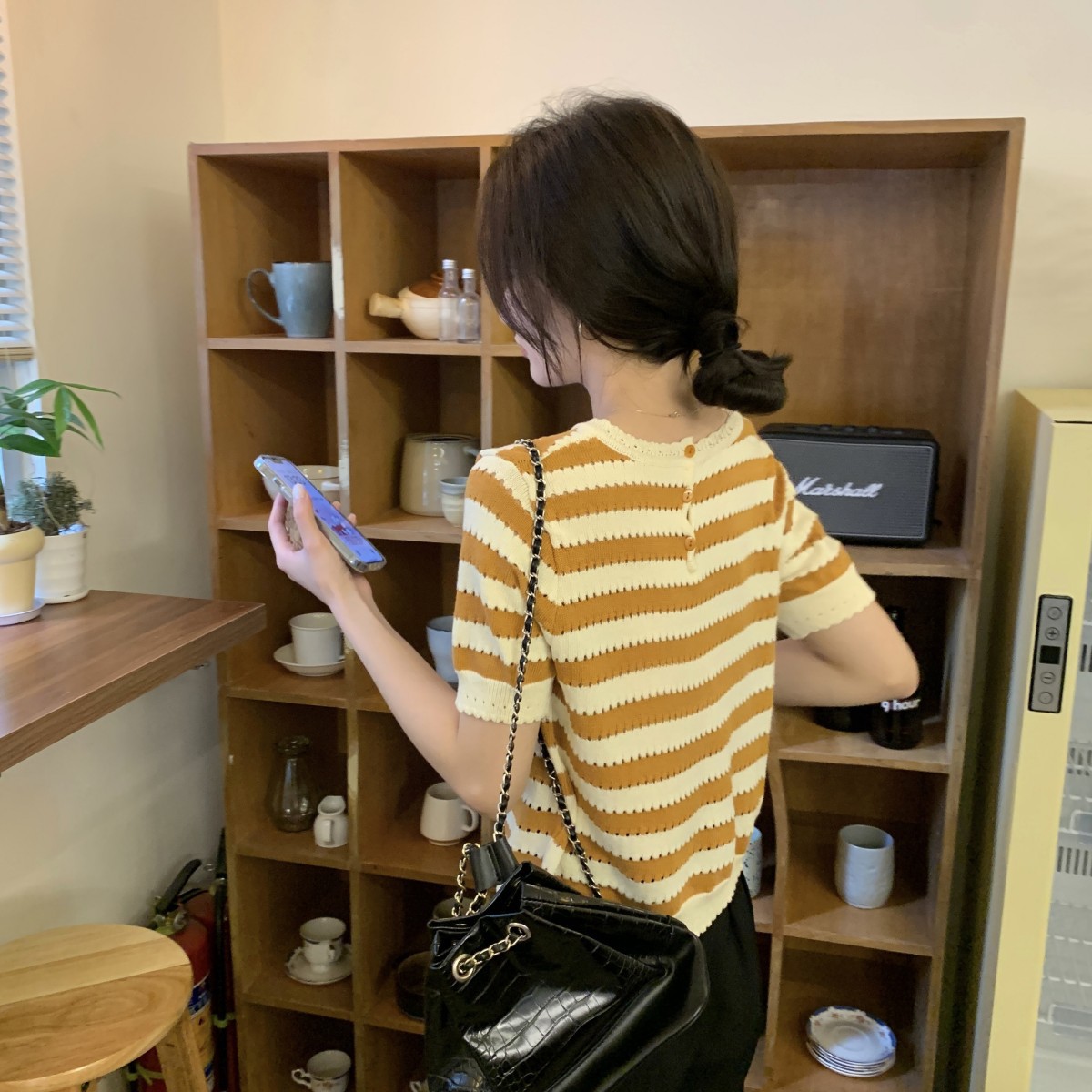 한국식 흑백 스트라이프 중공 디자인 느낌 기질 만능 반팔 스웨터 여성용 여름 여성용 고급 탑스토어 가기