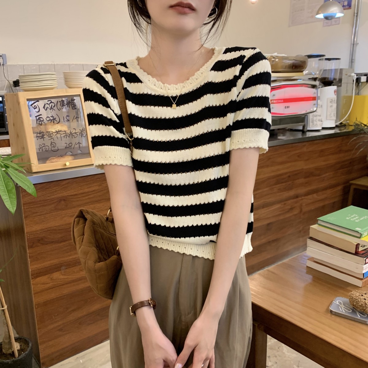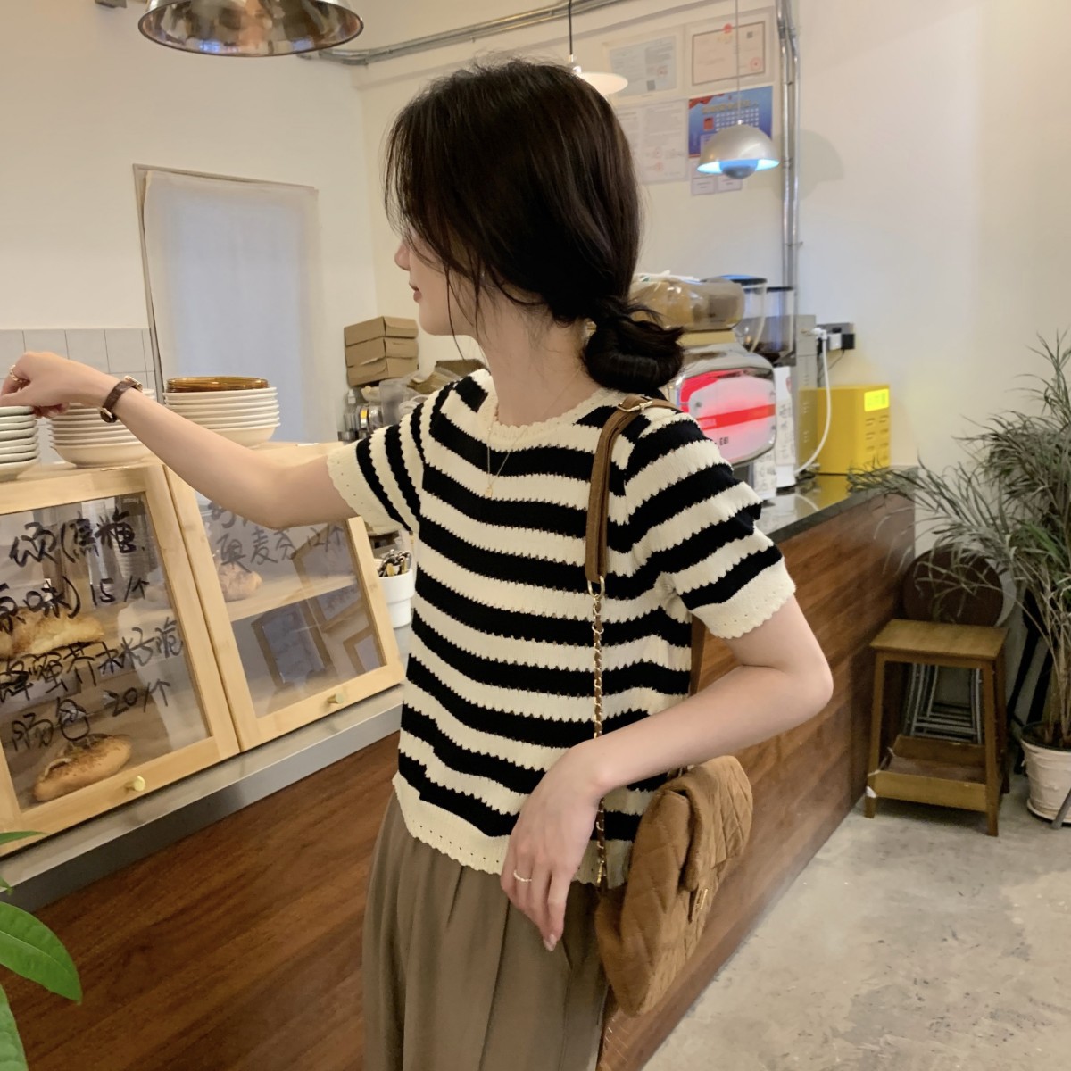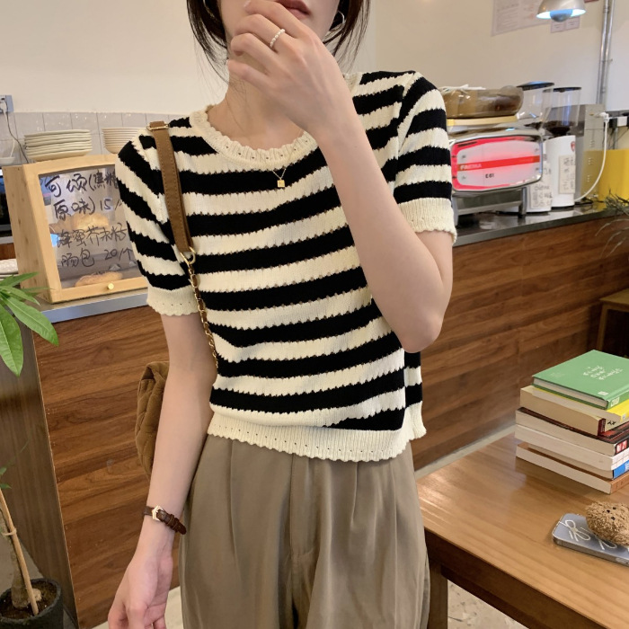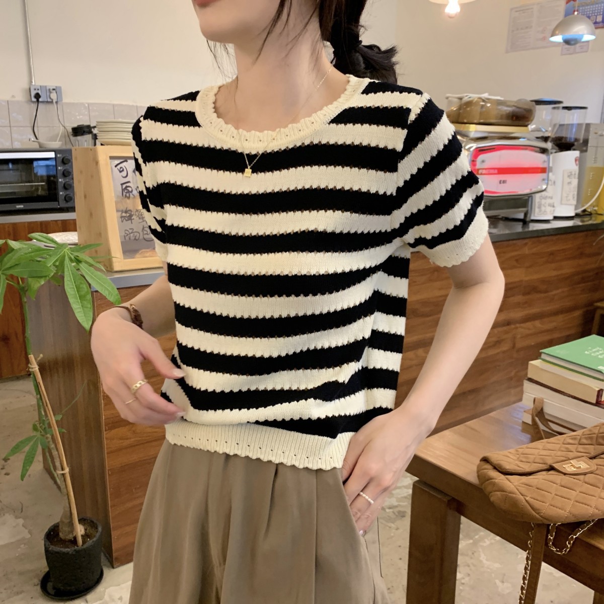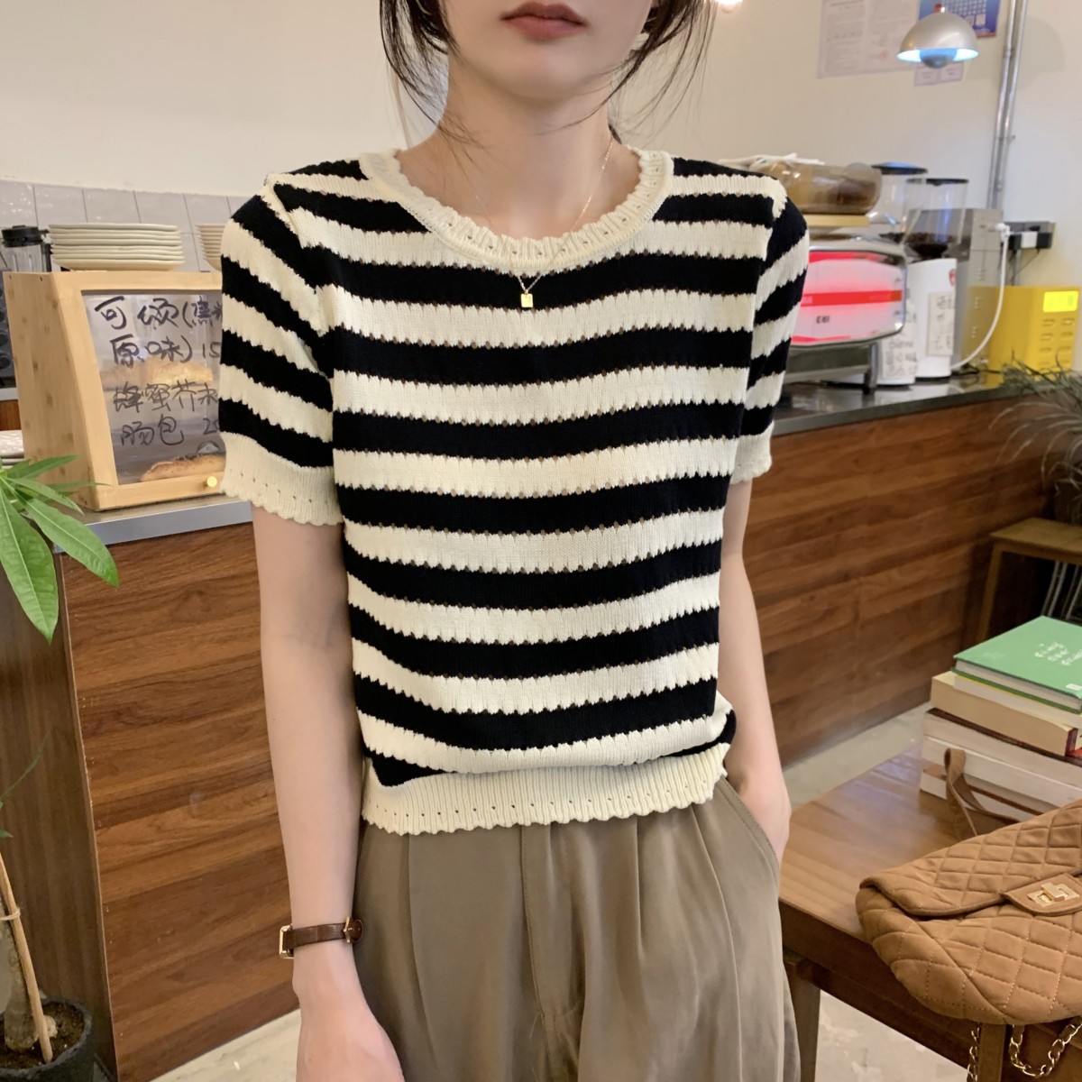 한국식 흑백 스트라이프 중공 디자인 느낌 기질 만능 반팔 스웨터 여성용 여름 여성용 고급 탑