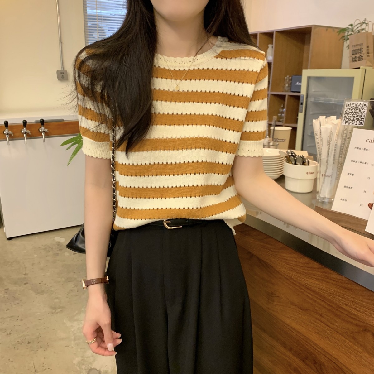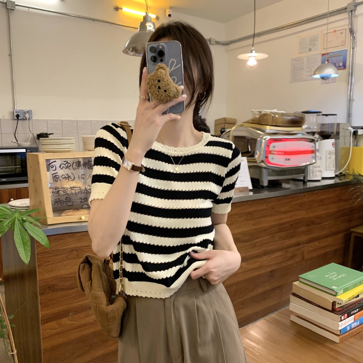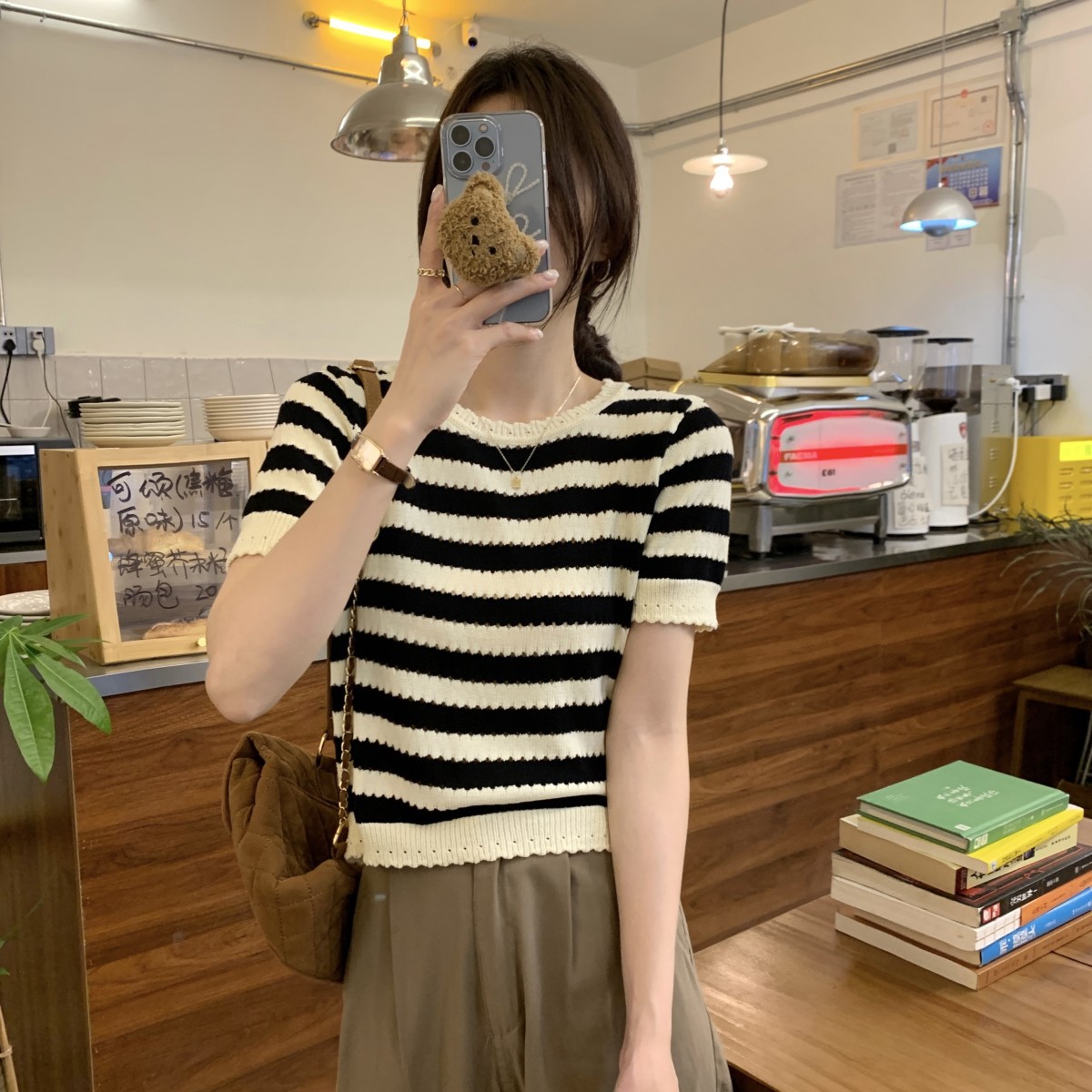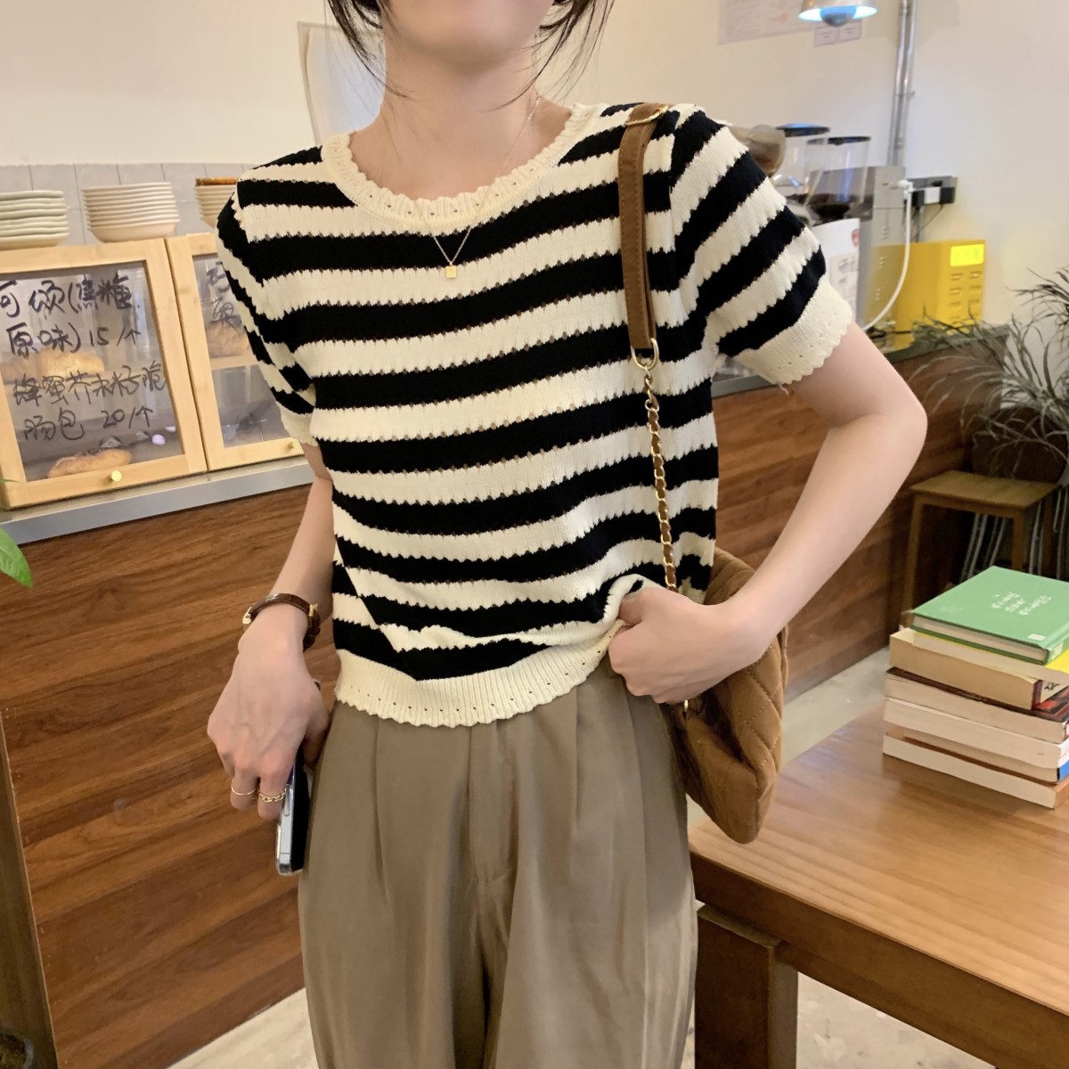 한국식 흑백 스트라이프 중공 디자인 느낌 기질 만능 반팔 스웨터 여성용 여름 여성용 고급 탑