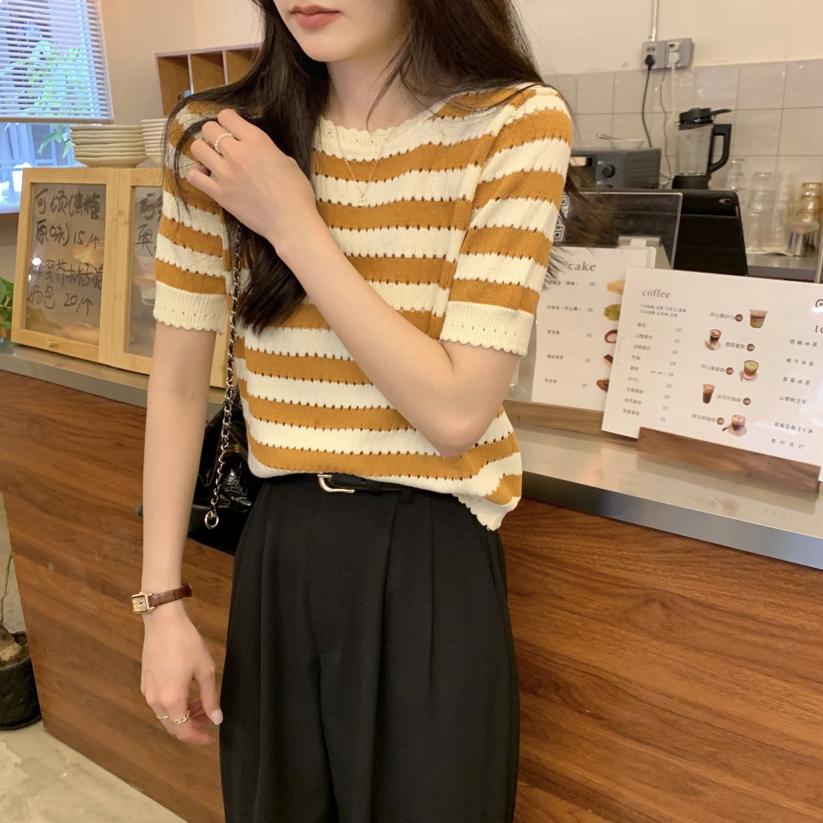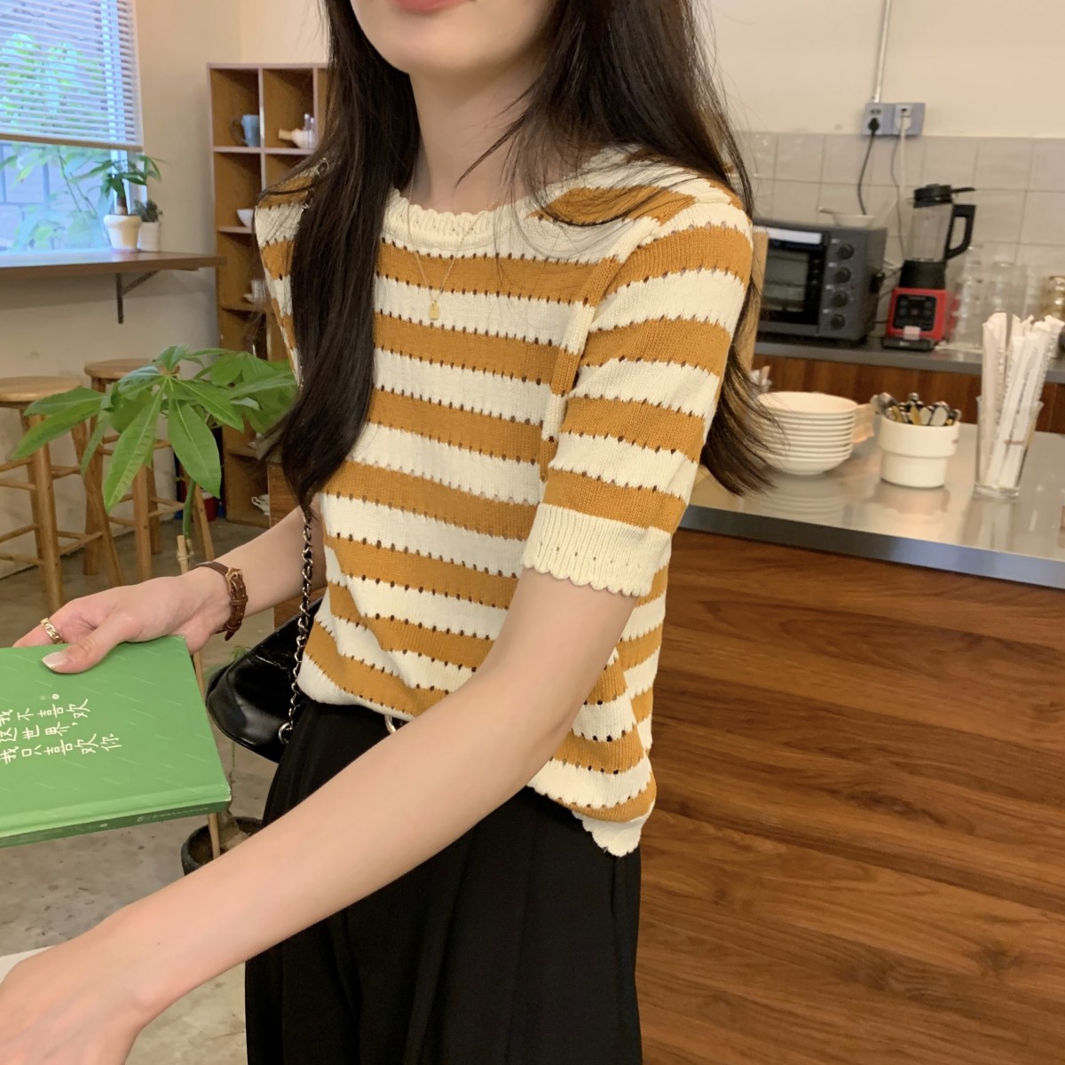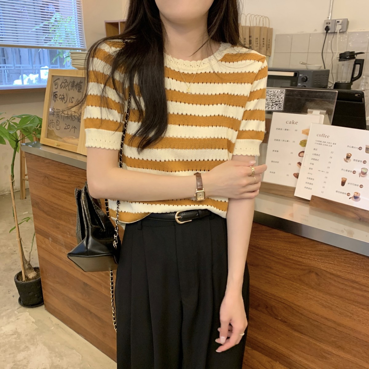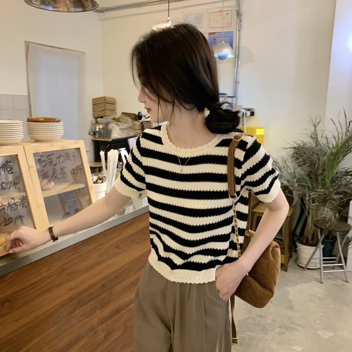 한국식 흑백 스트라이프 중공 디자인 느낌 기질 만능 반팔 스웨터 여성용 여름 여성용 고급 탑