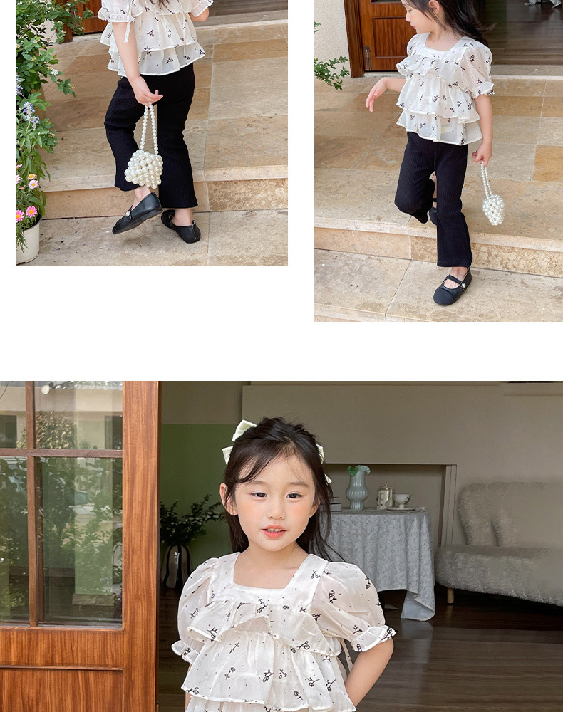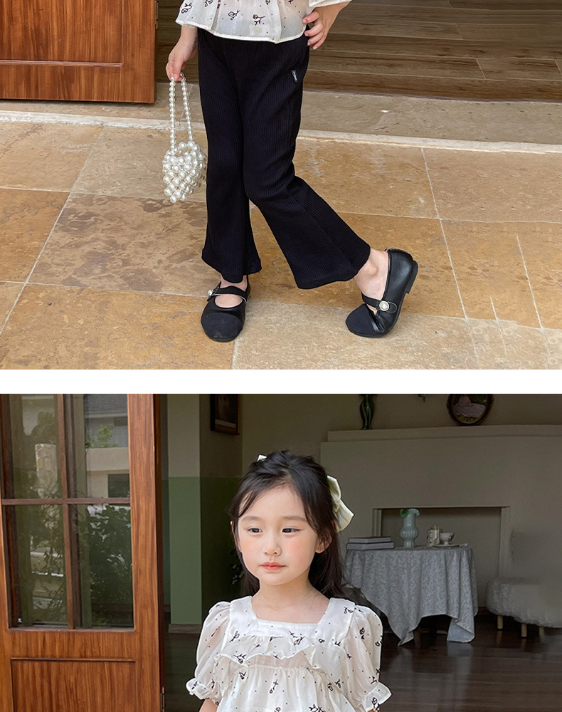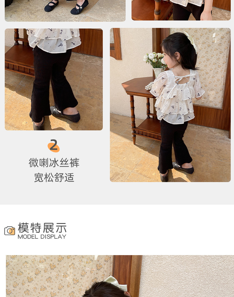 여름 신상 여아 한국 스타일 투피스 세트, 패셔너블한 아동용 꽃무늬 반팔 상의와 여아용 약간의 플레어 팬츠스토어 가기