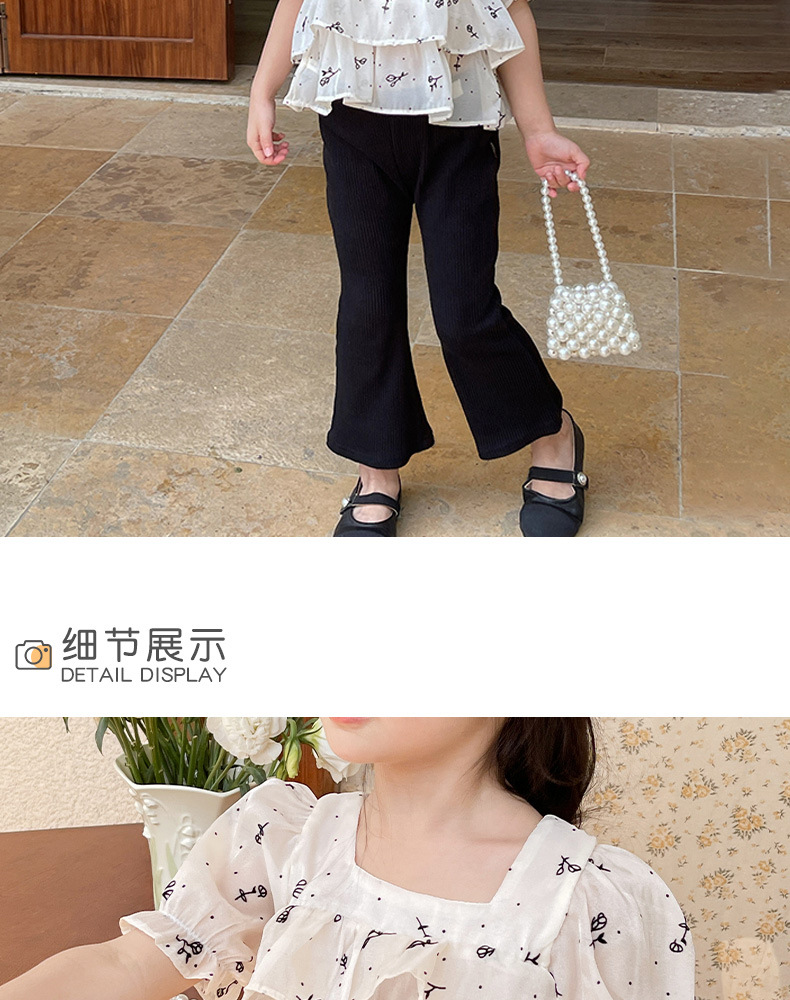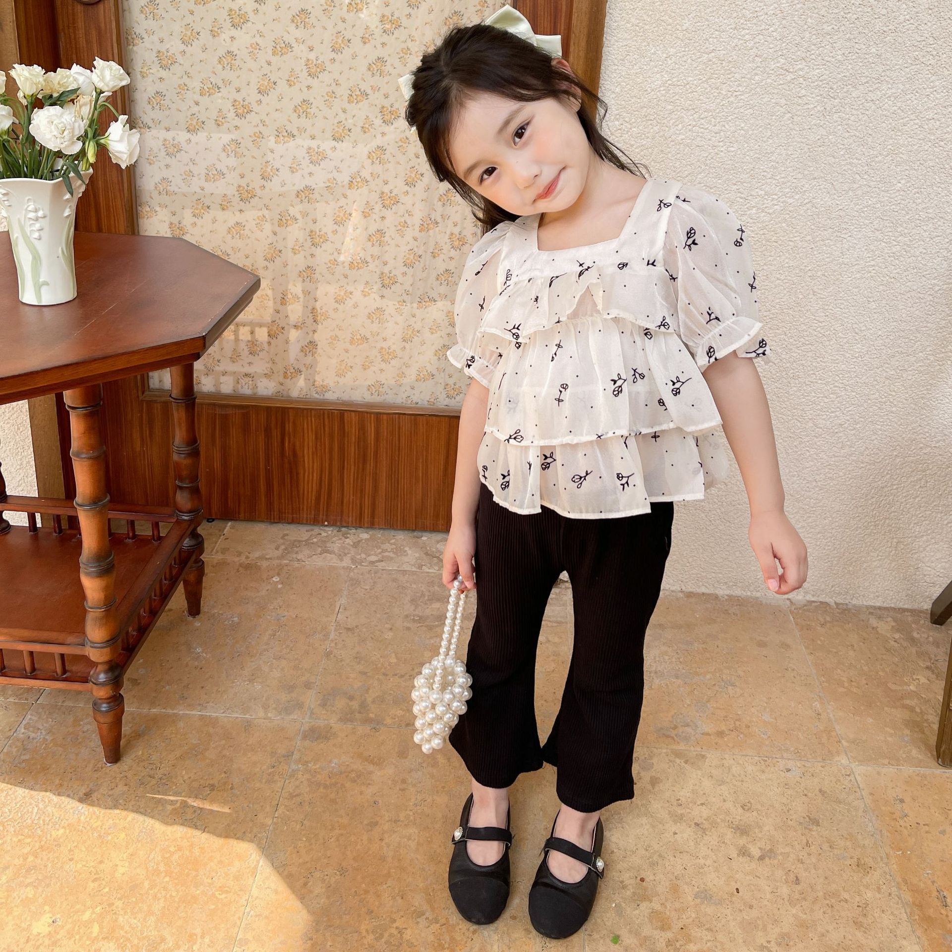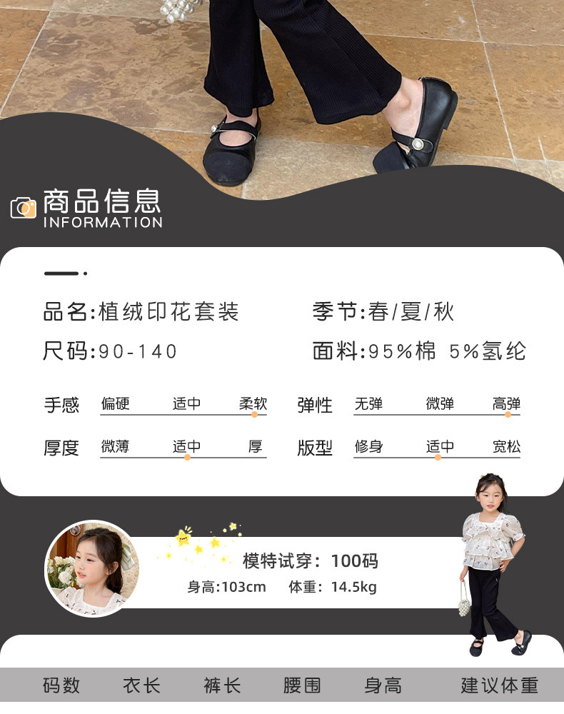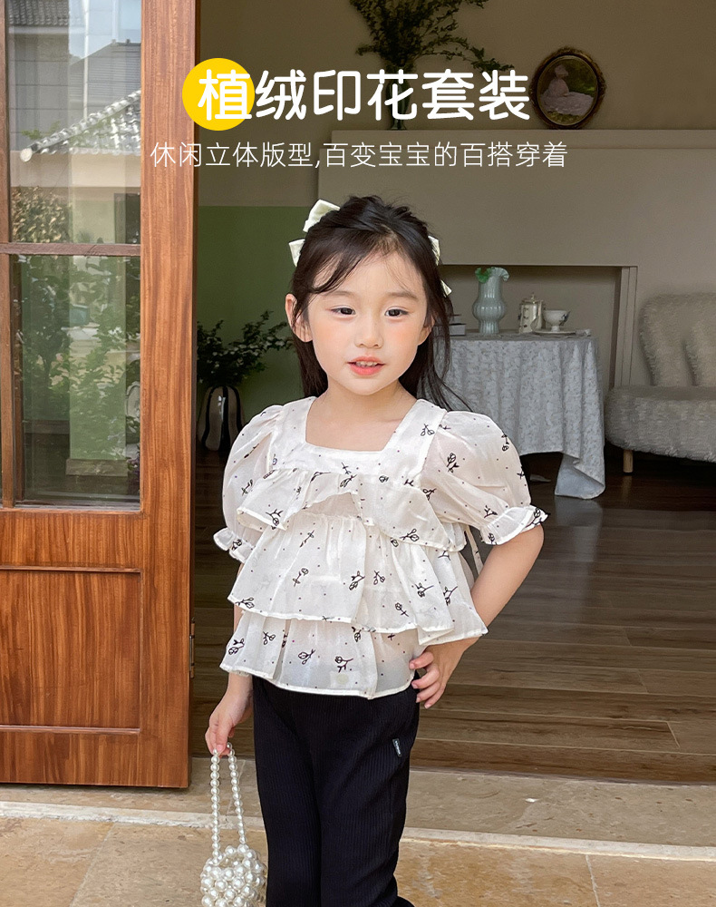 여름 신상 여아 한국 스타일 투피스 세트, 패셔너블한 아동용 꽃무늬 반팔 상의와 여아용 약간의 플레어 팬츠
