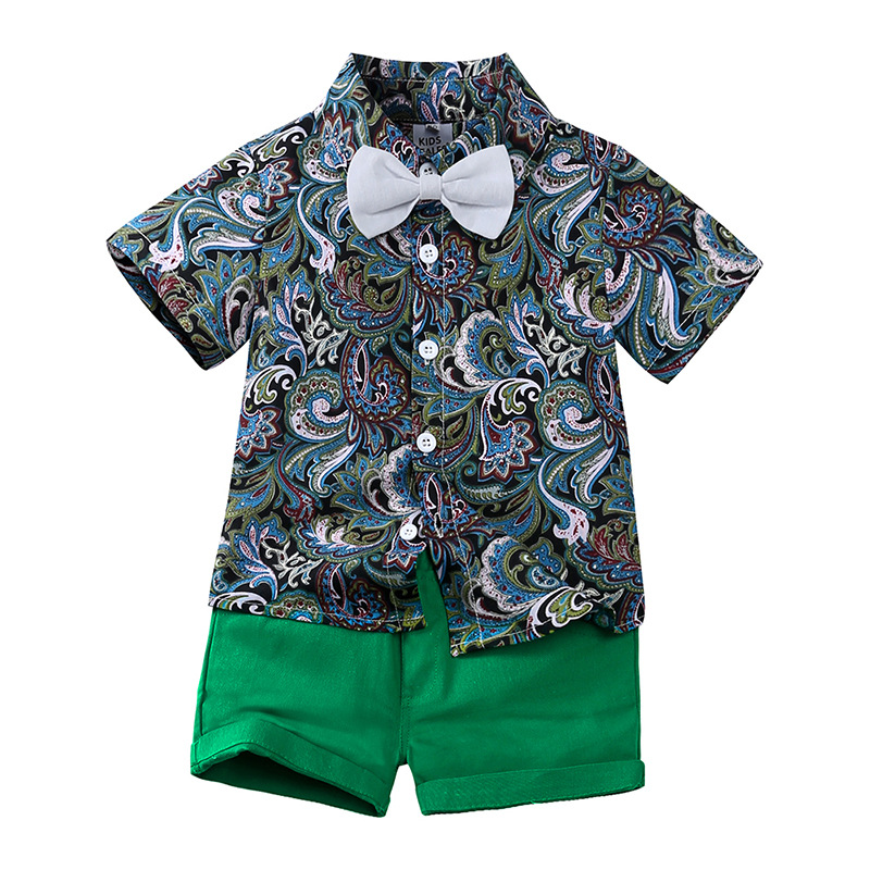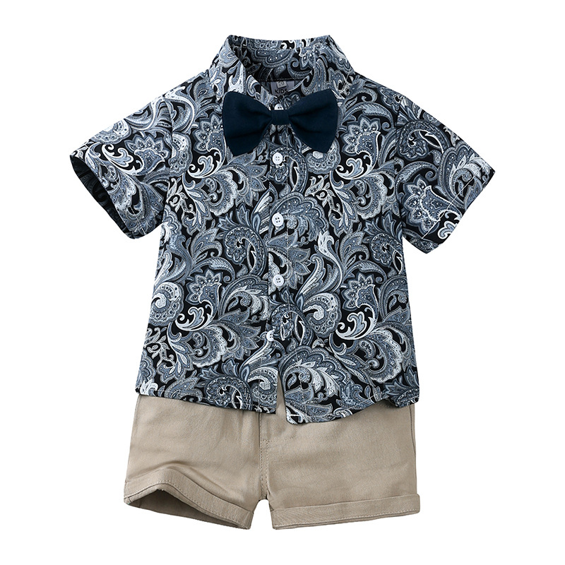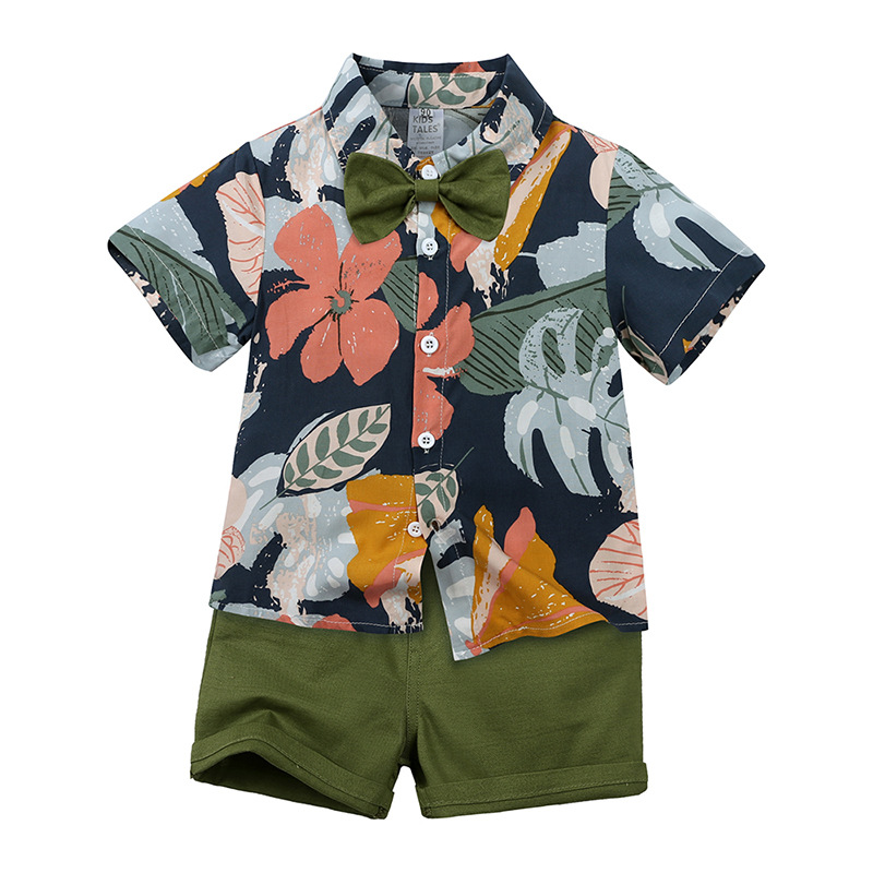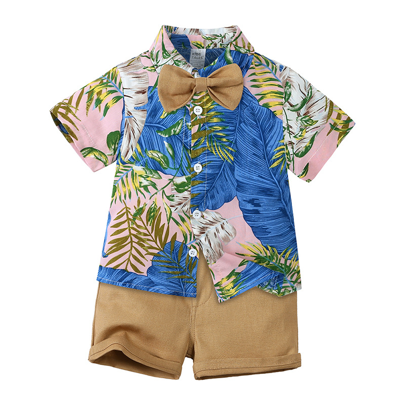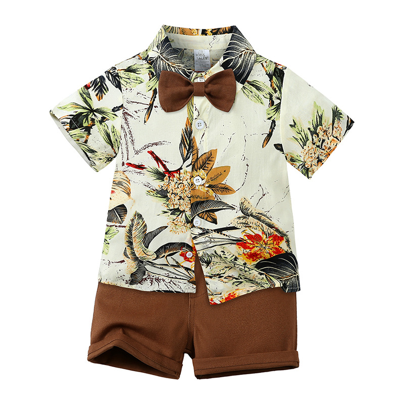 【款式】夏威夷花衬衫 2023夏季欧美儿童短袖花朵开衫男童短裤两件套 潮范