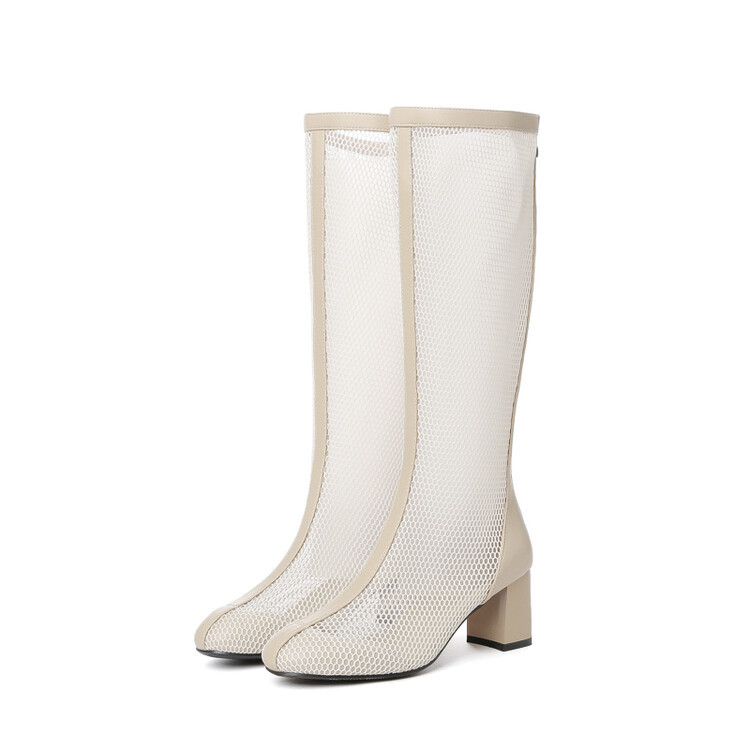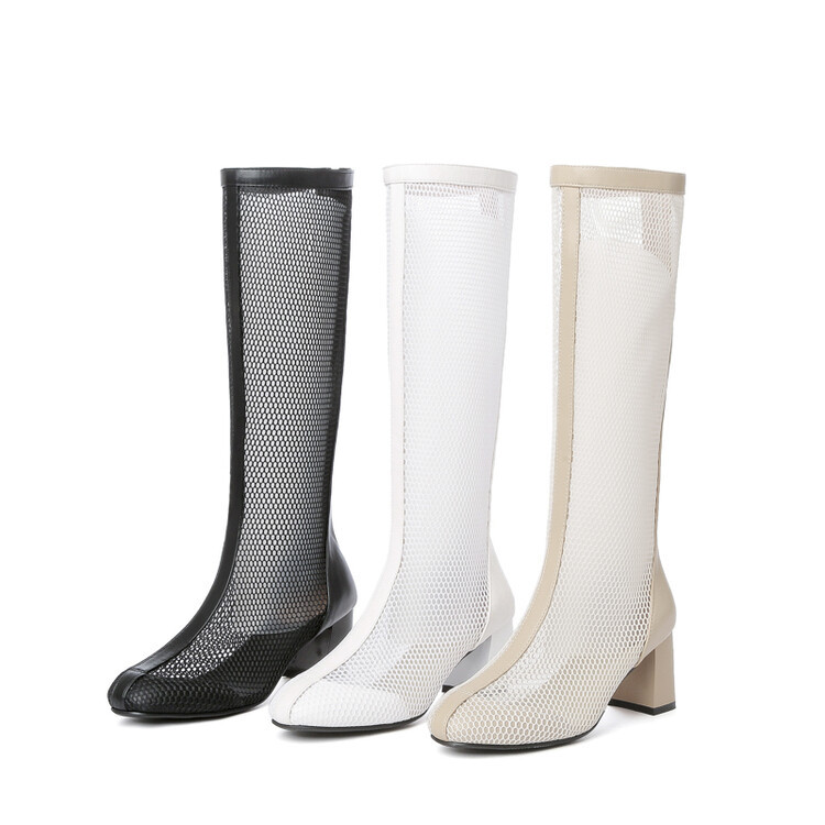 23 외국 무역 그물 부츠 두꺼운 뒤꿈치 하이힐 라운드 헤드 스티칭 중공 부츠 그물 여성 부츠 40-45 사이즈 신발
