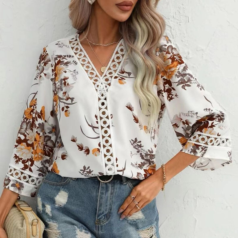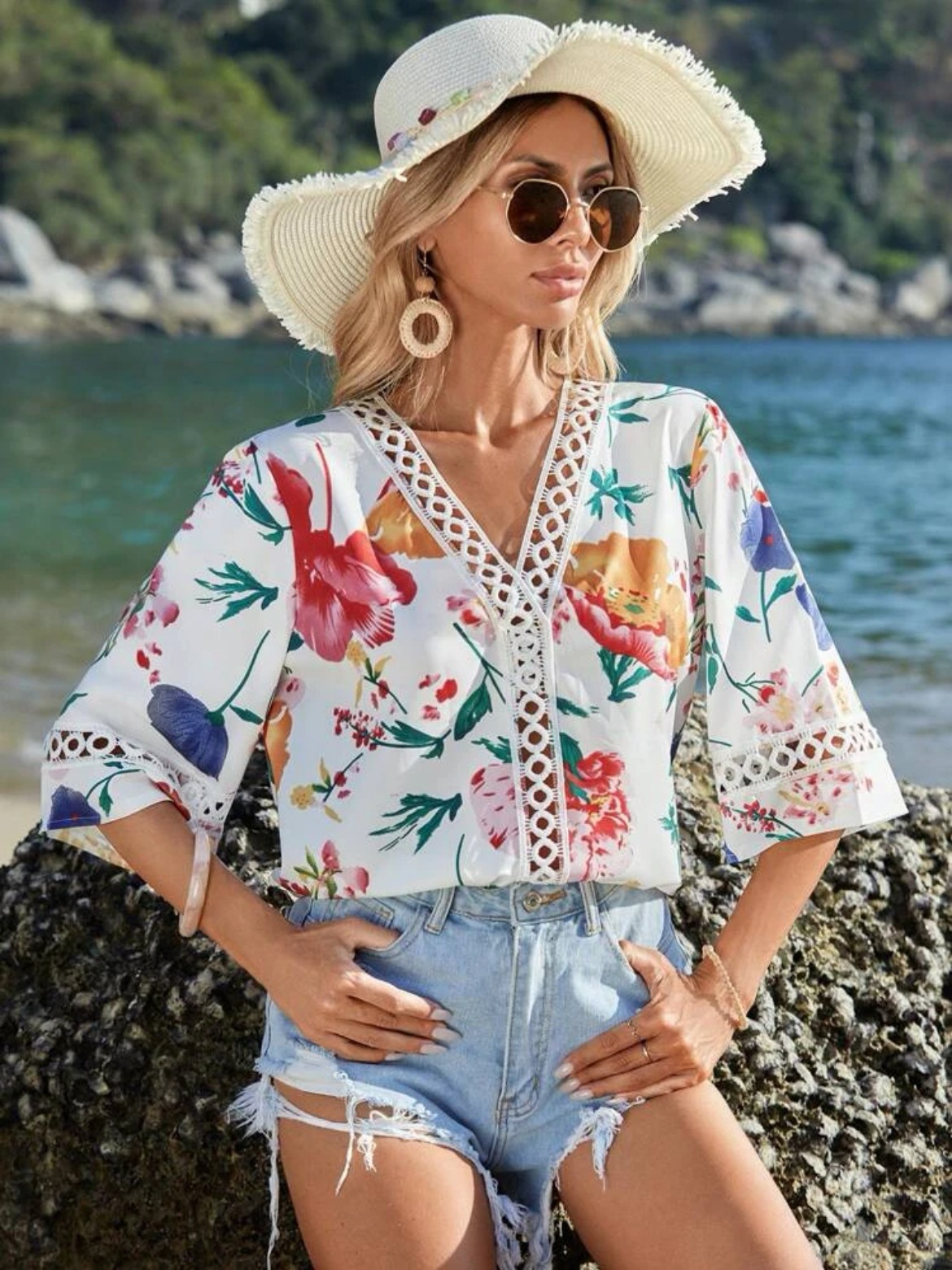 유럽과 미국 2023 새로운 패션 트렌드 레이스 트럼펫 슬리브 V-넥 느슨한 해변 휴일 인쇄 쉬폰 셔츠