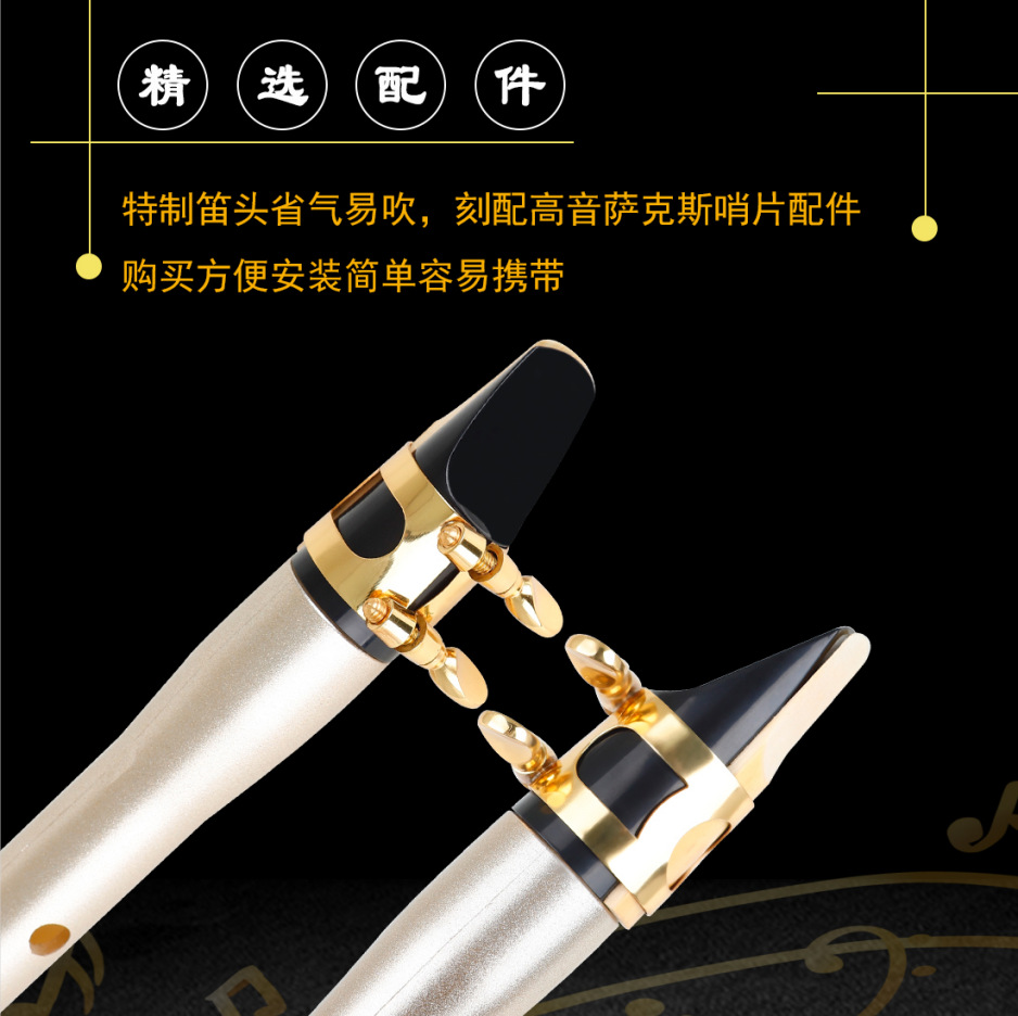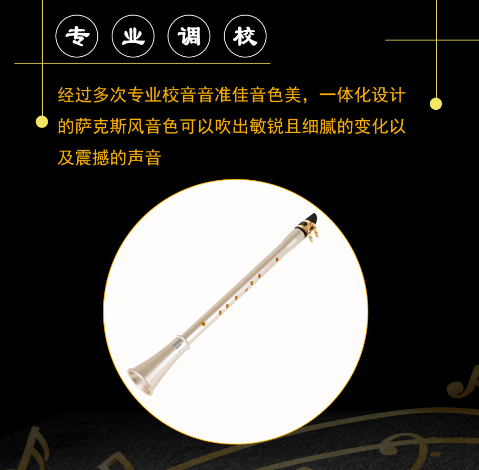 用途/卖点:精选优质树脂材质打造,色泽明亮打磨细腻触感好,一体化设计做工精致,配件之间的缝隙处理的精细不漏气,多次专业校音音准易吹响音质佳音色美,萨克斯风音色解脱单一音乐的束缚,给你独特的音乐感受。产品耐用易学上手快,从外观到选材,再到音色凝聚了众多的心血,是广大音乐爱好者的不二之选。
