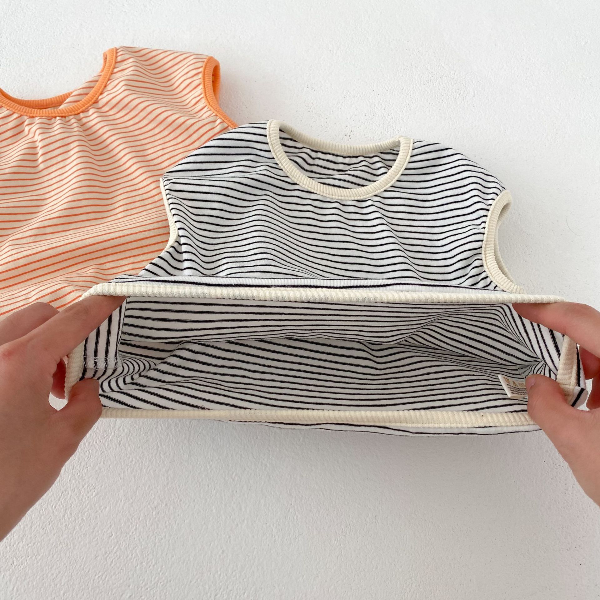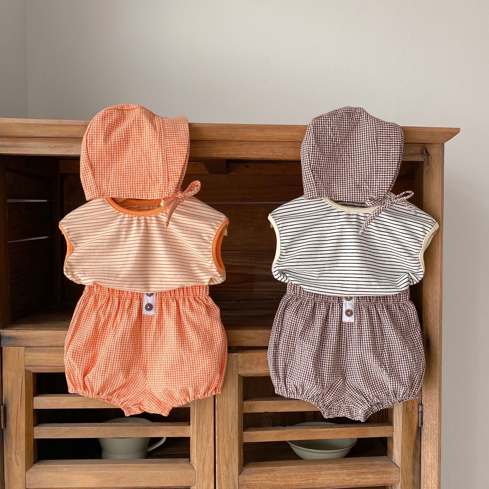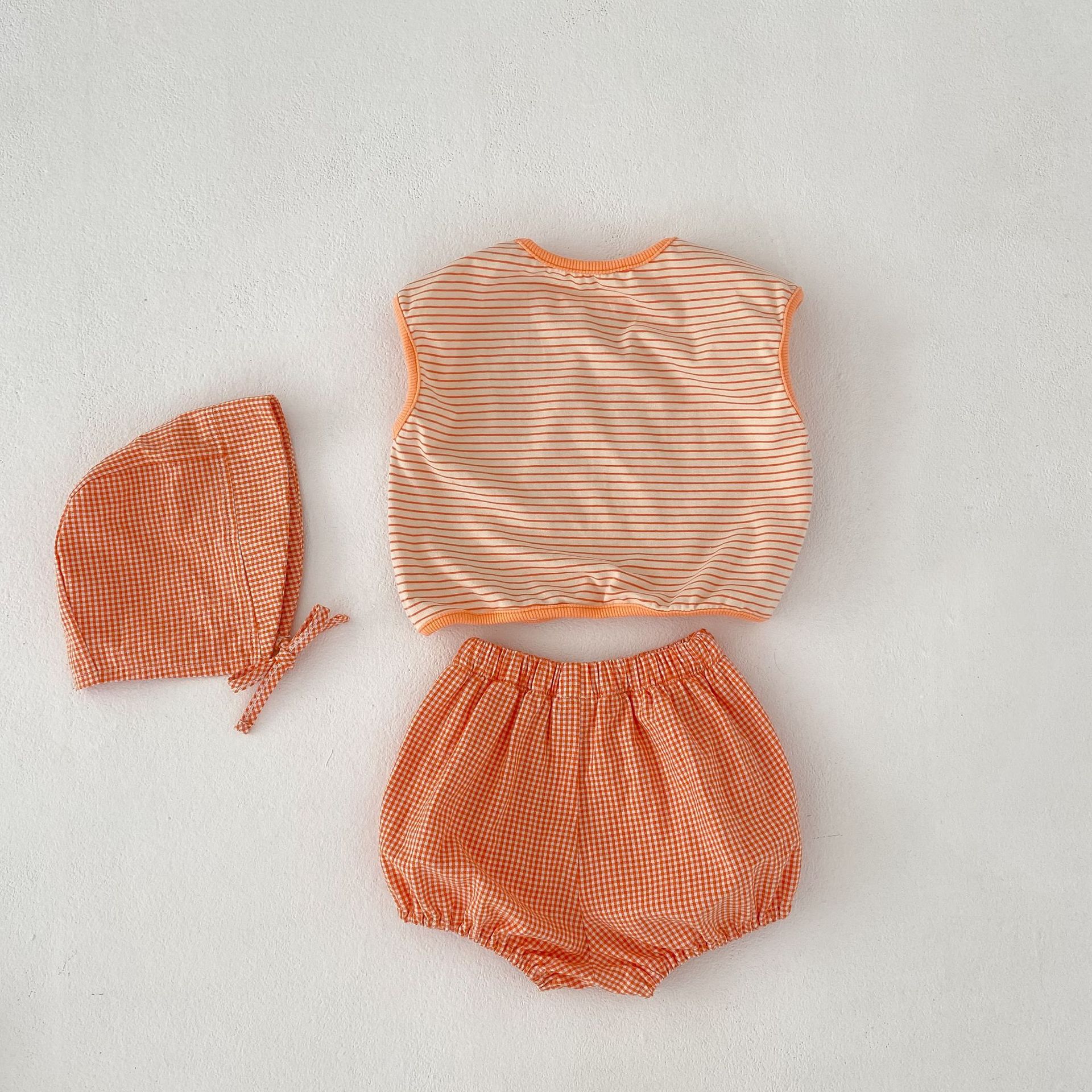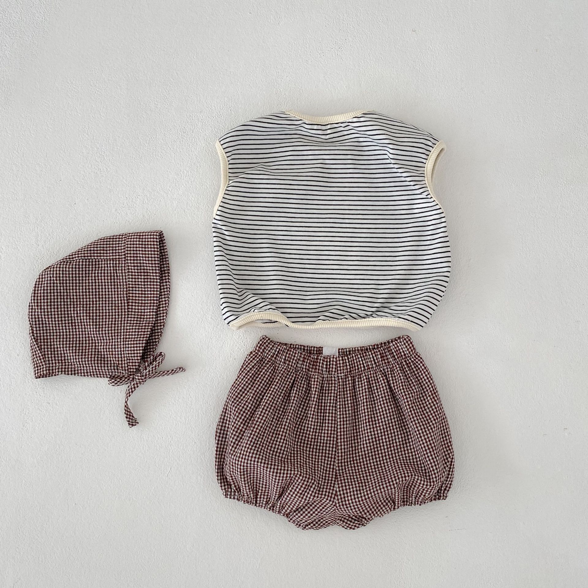 2025 여름 유아 소년 소녀 스트라이프 탑 + 작고 신선하고 귀여운 빵 바지 + 모자 3 피스 세트스토어 가기