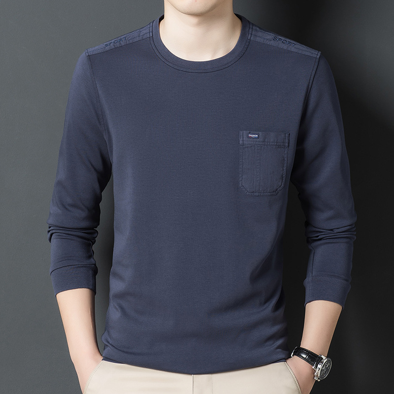 중년 남성 아빠 긴팔 티셔츠 남성용 봄 탑 라운드 넥 포켓 솔리드 컬러 면베이스 티셔츠 남성용 티셔츠