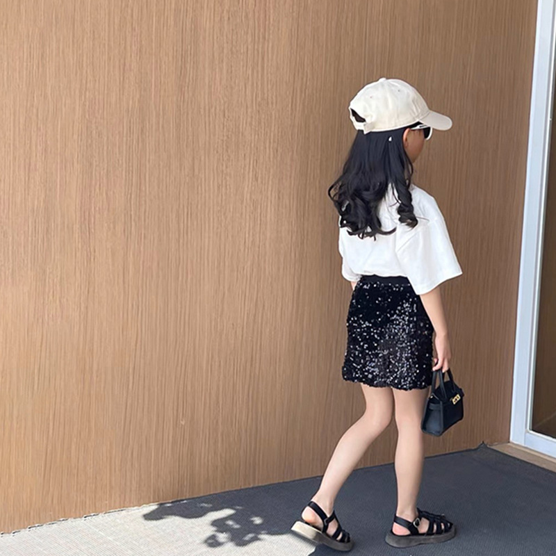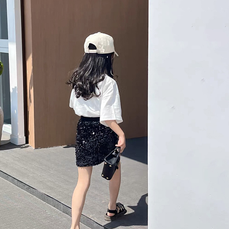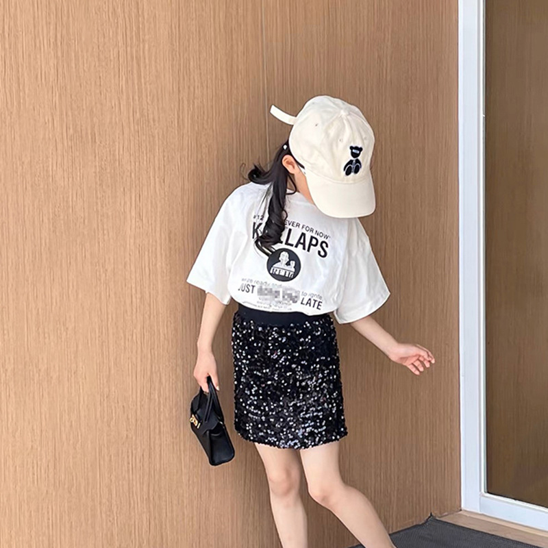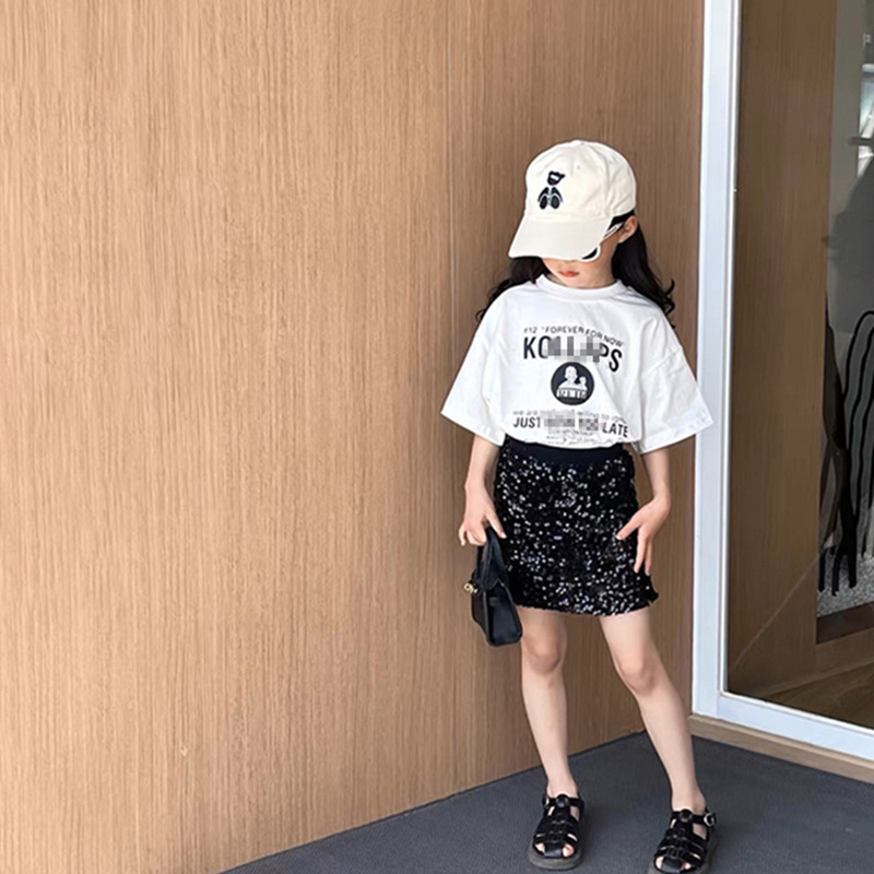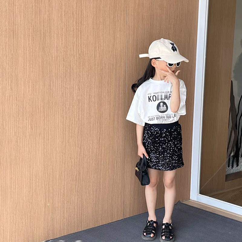 한국 스타일 아동복 2023 여름 새 여아 유행 편지 반팔 티셔츠 사이버 연예인 스팽글 스커트 세트 유행스토어 가기