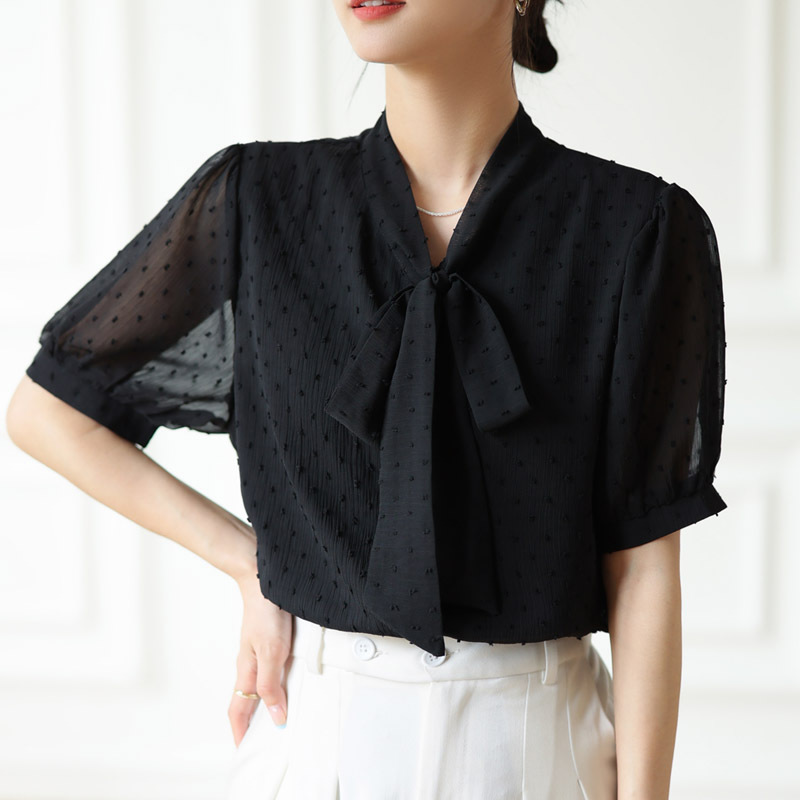 2023 여름 새로운 한국 스타일 셔츠 여자의 복고풍 세련된 랜턴 슬리브 셔츠 나비 넥타이 폴카 도트 짧은 소매