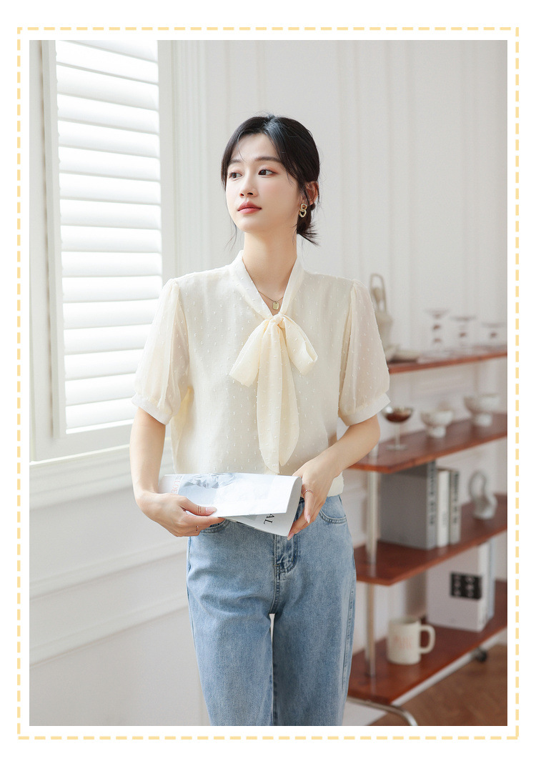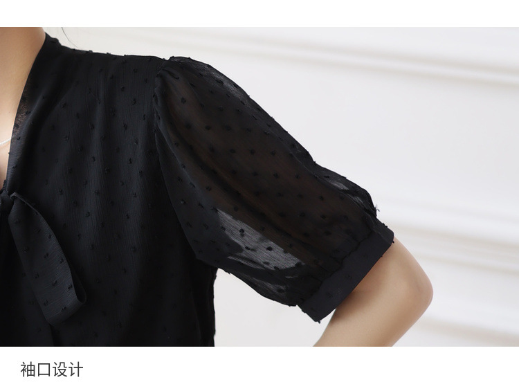2023 여름 새로운 한국 스타일 셔츠 여자의 복고풍 세련된 랜턴 슬리브 셔츠 나비 넥타이 폴카 도트 짧은 소매스토어 가기