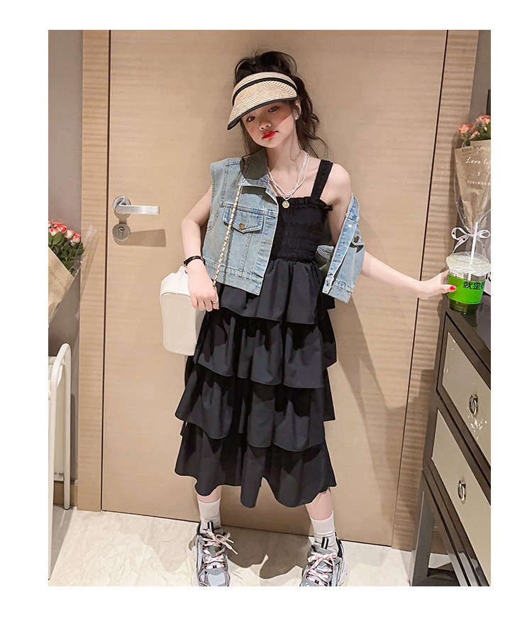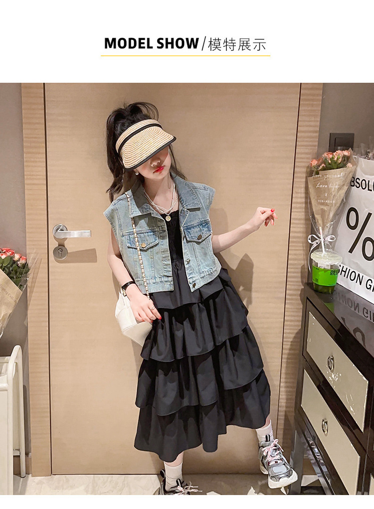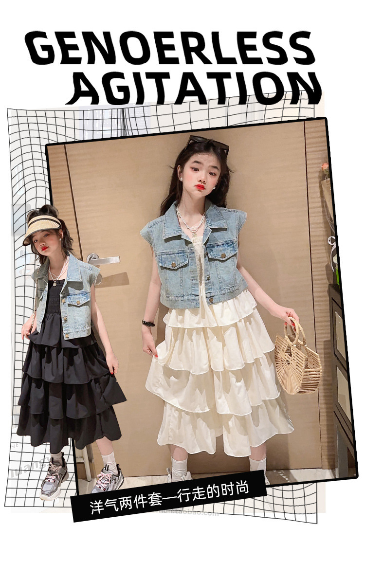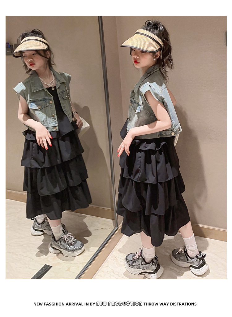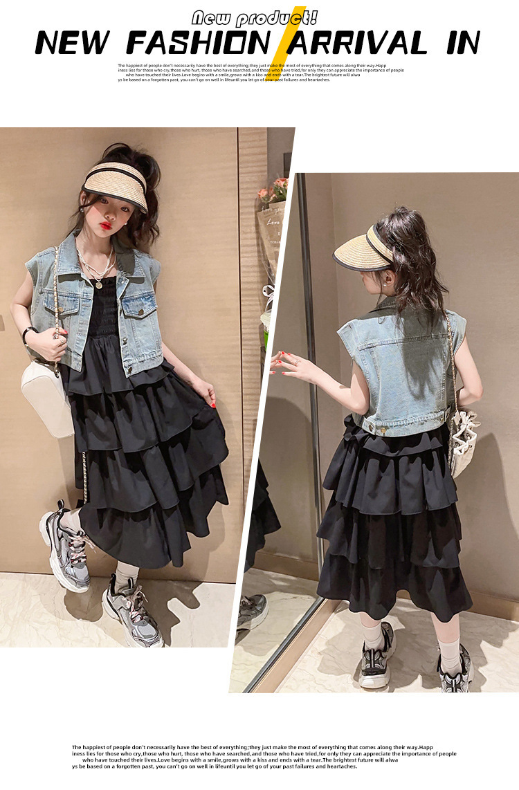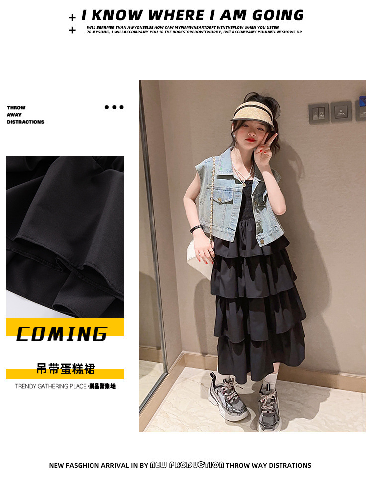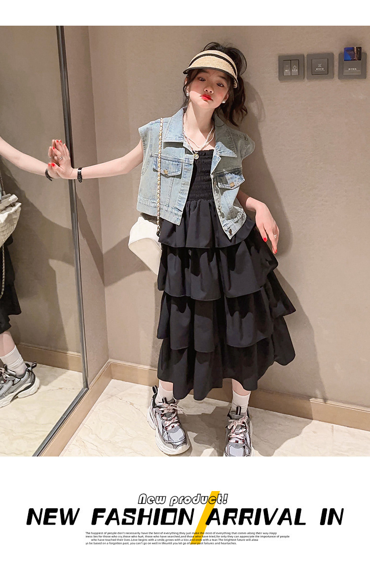 여아 데님 조끼 슬링 스커트 투피스 세트 2023 여름 새 케이크 스커트 프랑스 고급 블랙 롱 스커트스토어 가기