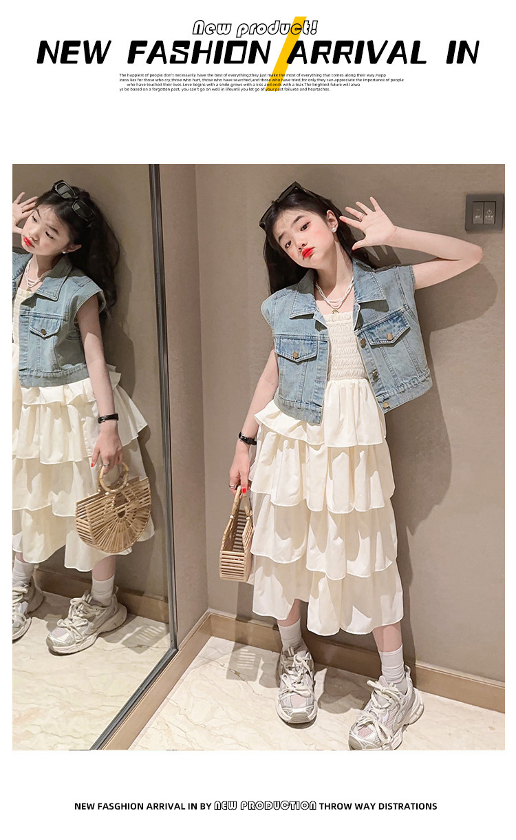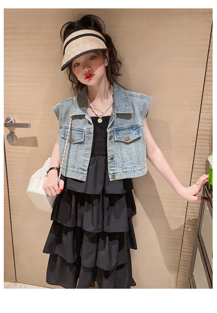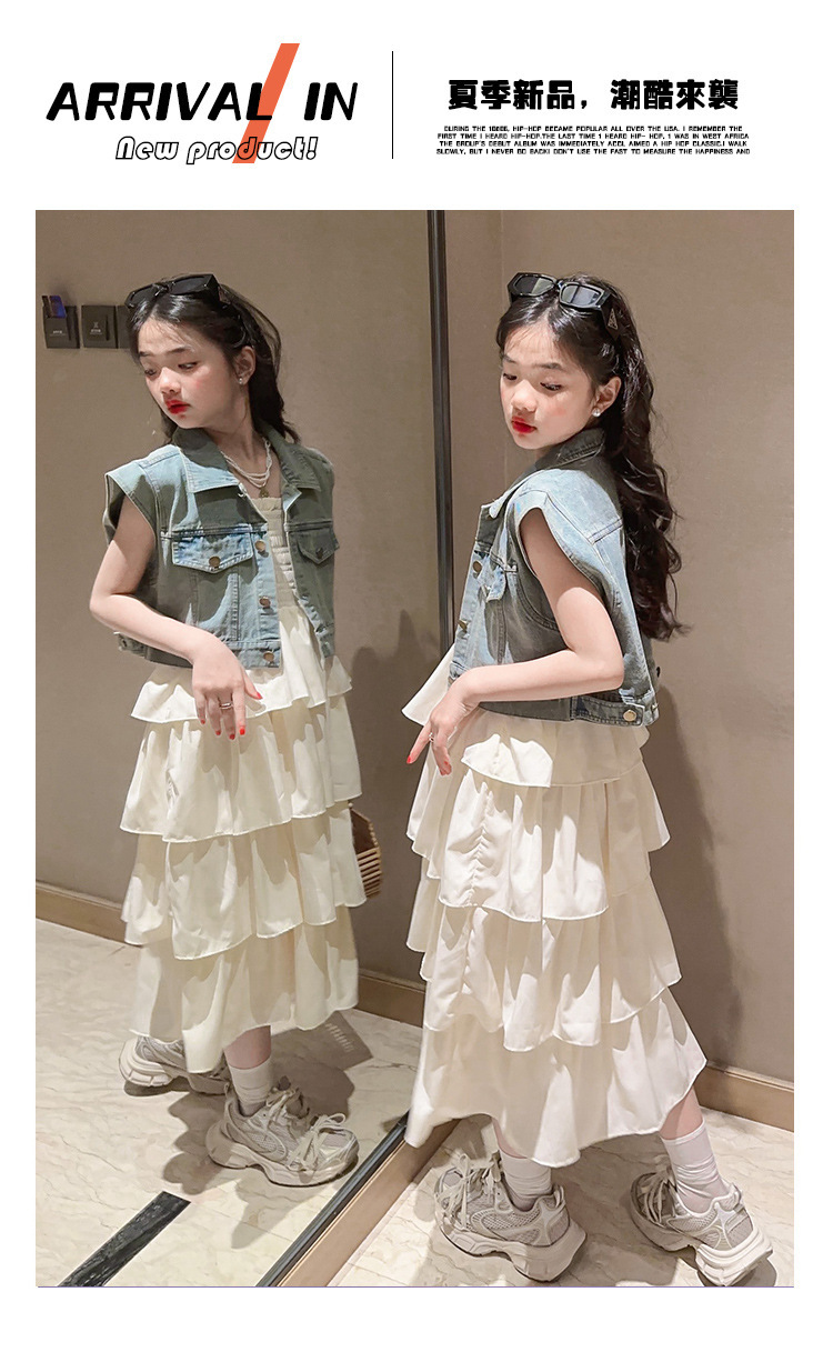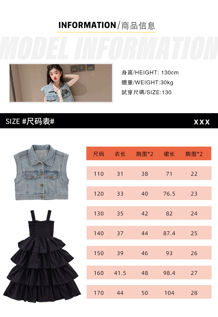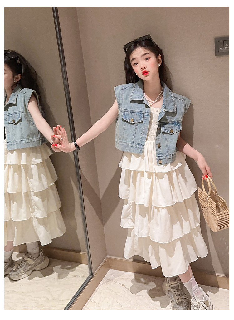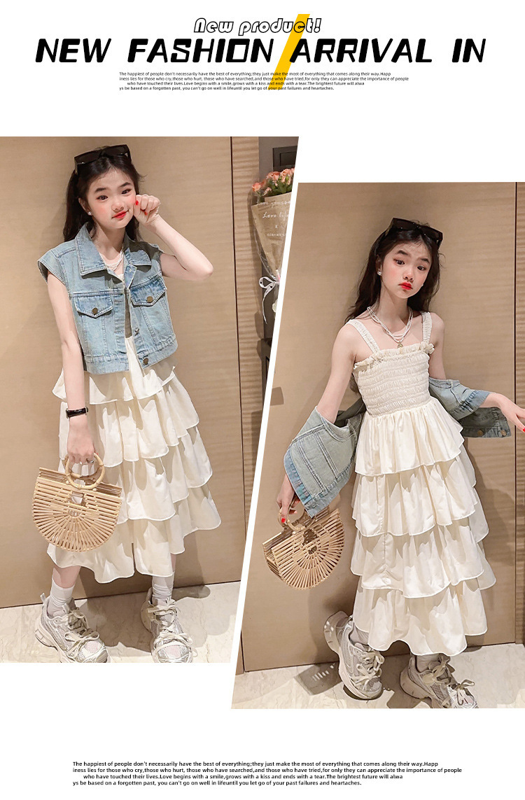 여아 데님 조끼 슬링 스커트 투피스 세트 2023 여름 새 케이크 스커트 프랑스 고급 블랙 롱 스커트스토어 가기
