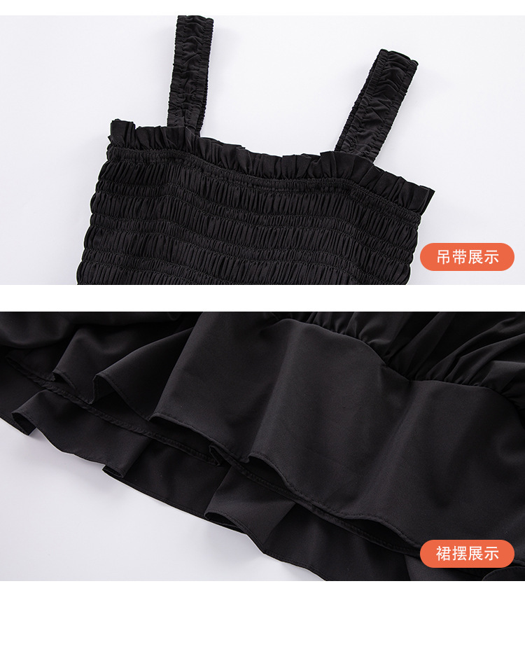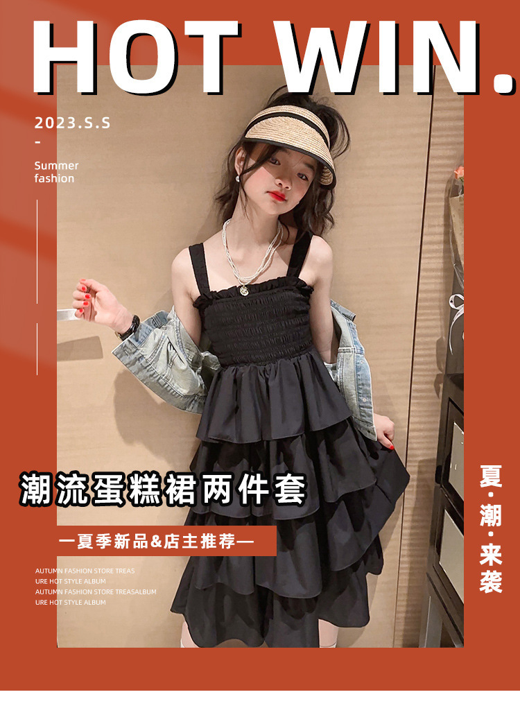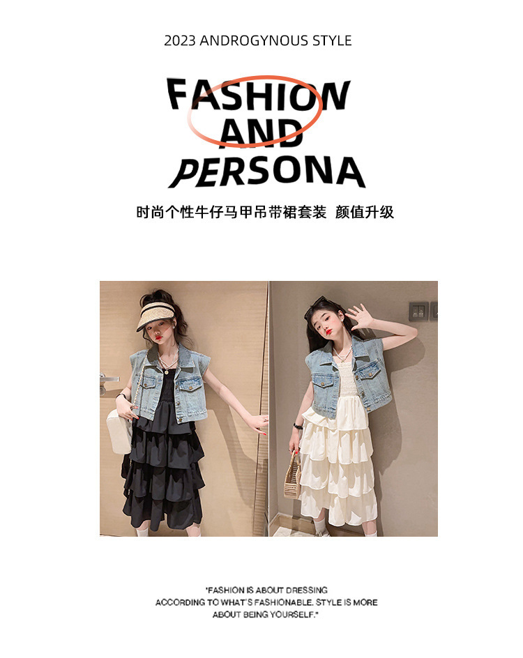 여아 데님 조끼 슬링 스커트 투피스 세트 2023 여름 새 케이크 스커트 프랑스 고급 블랙 롱 스커트